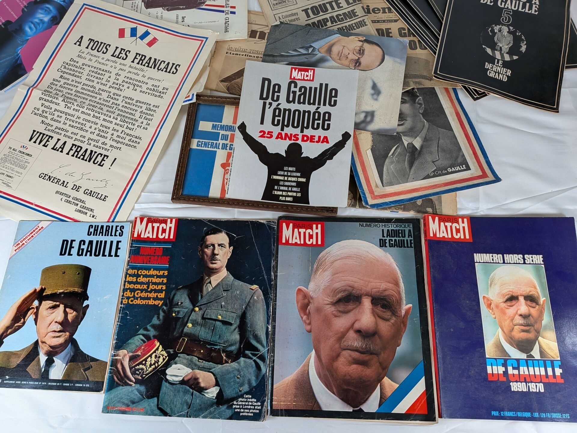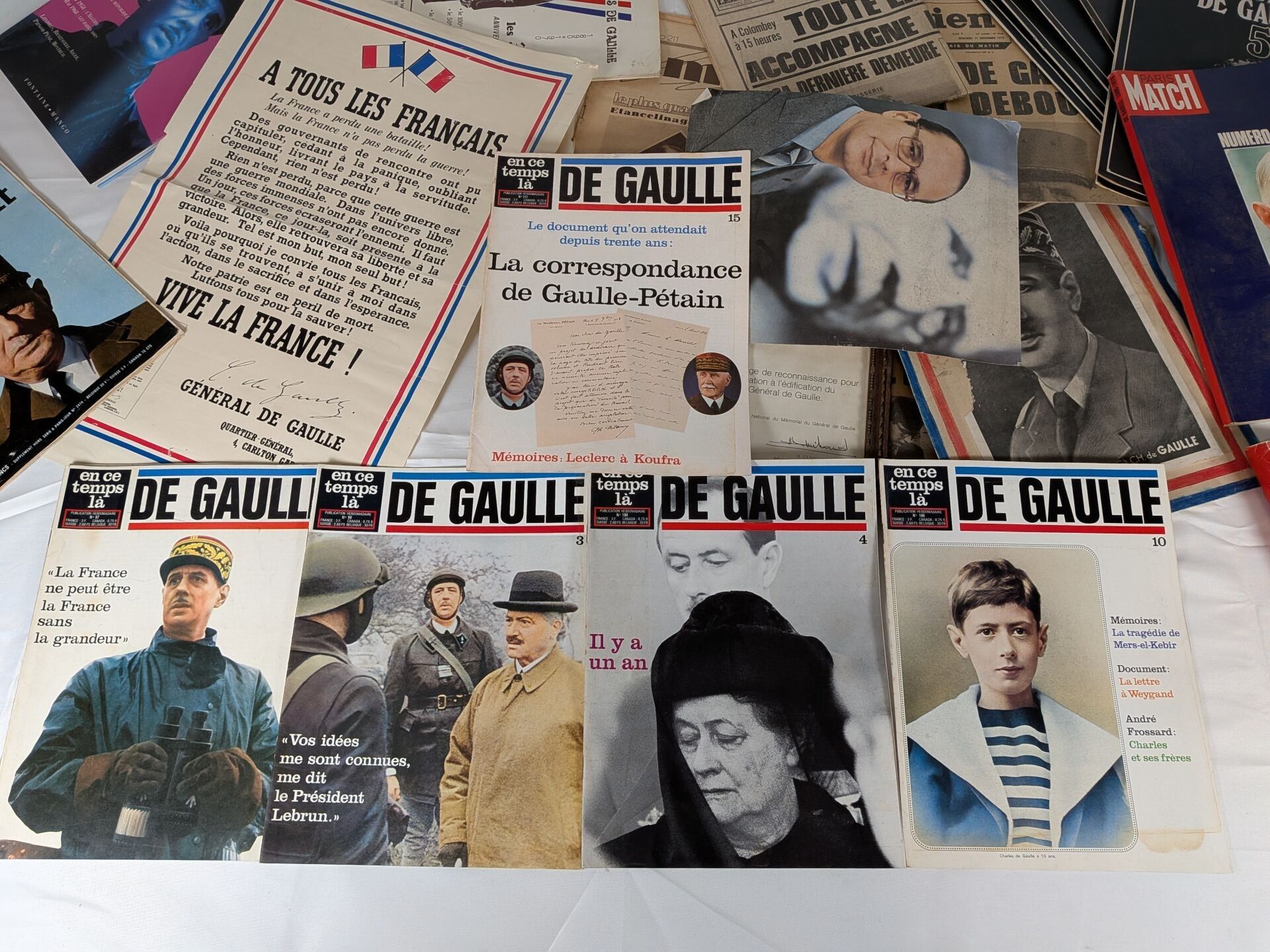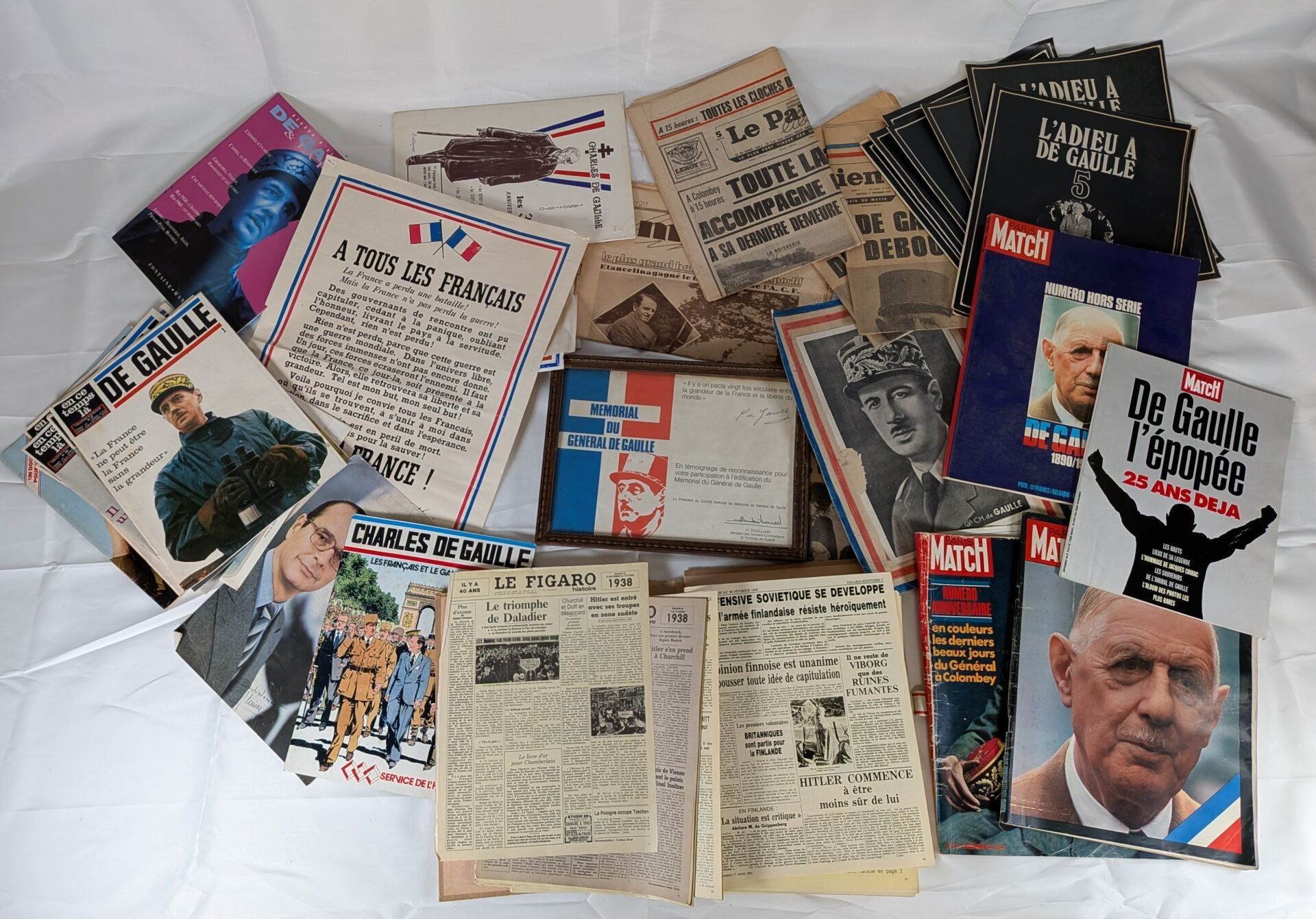 Set of works on the theme of General De Gaulle, including period magazines and newspapers. All in used condition.