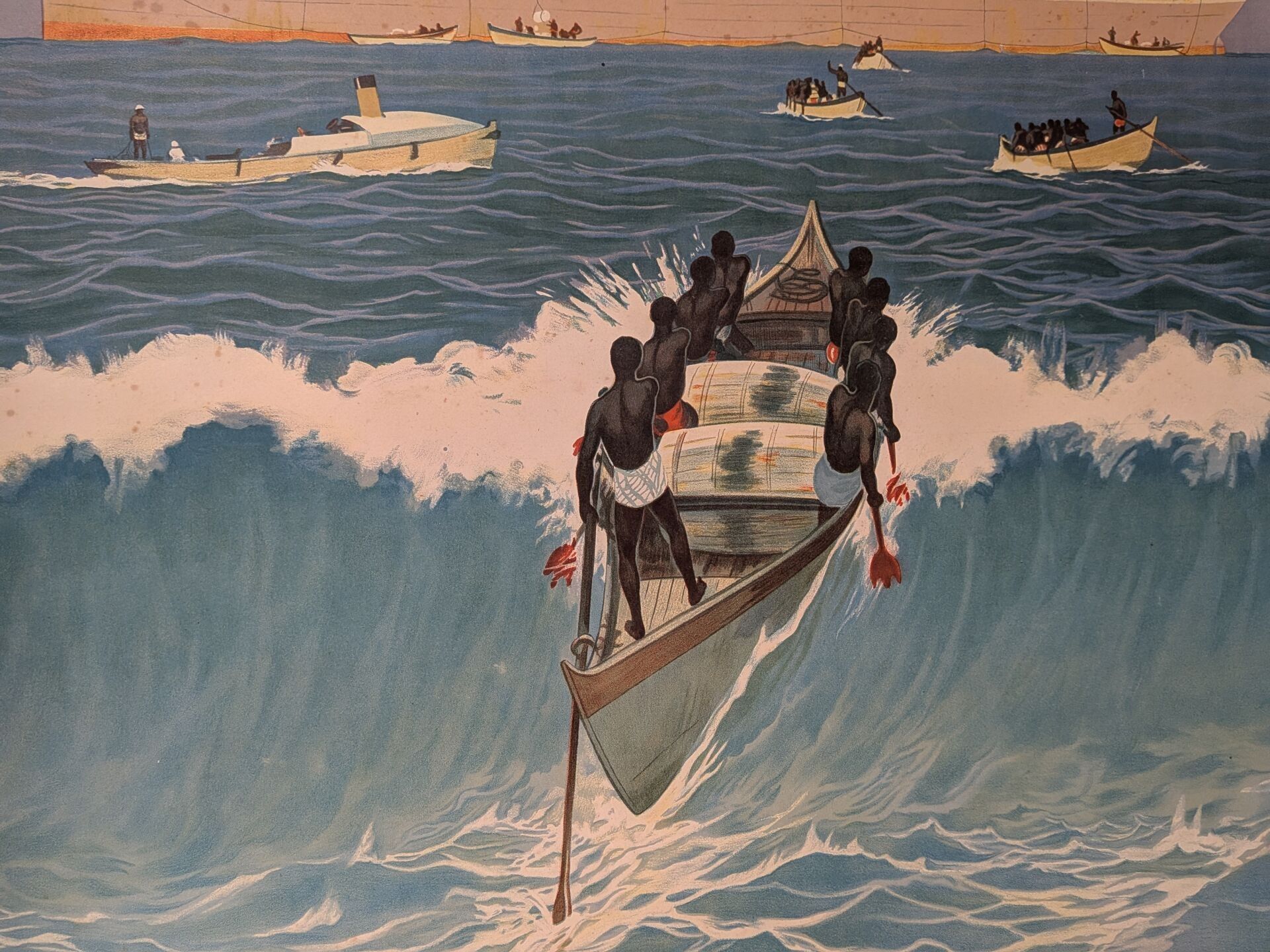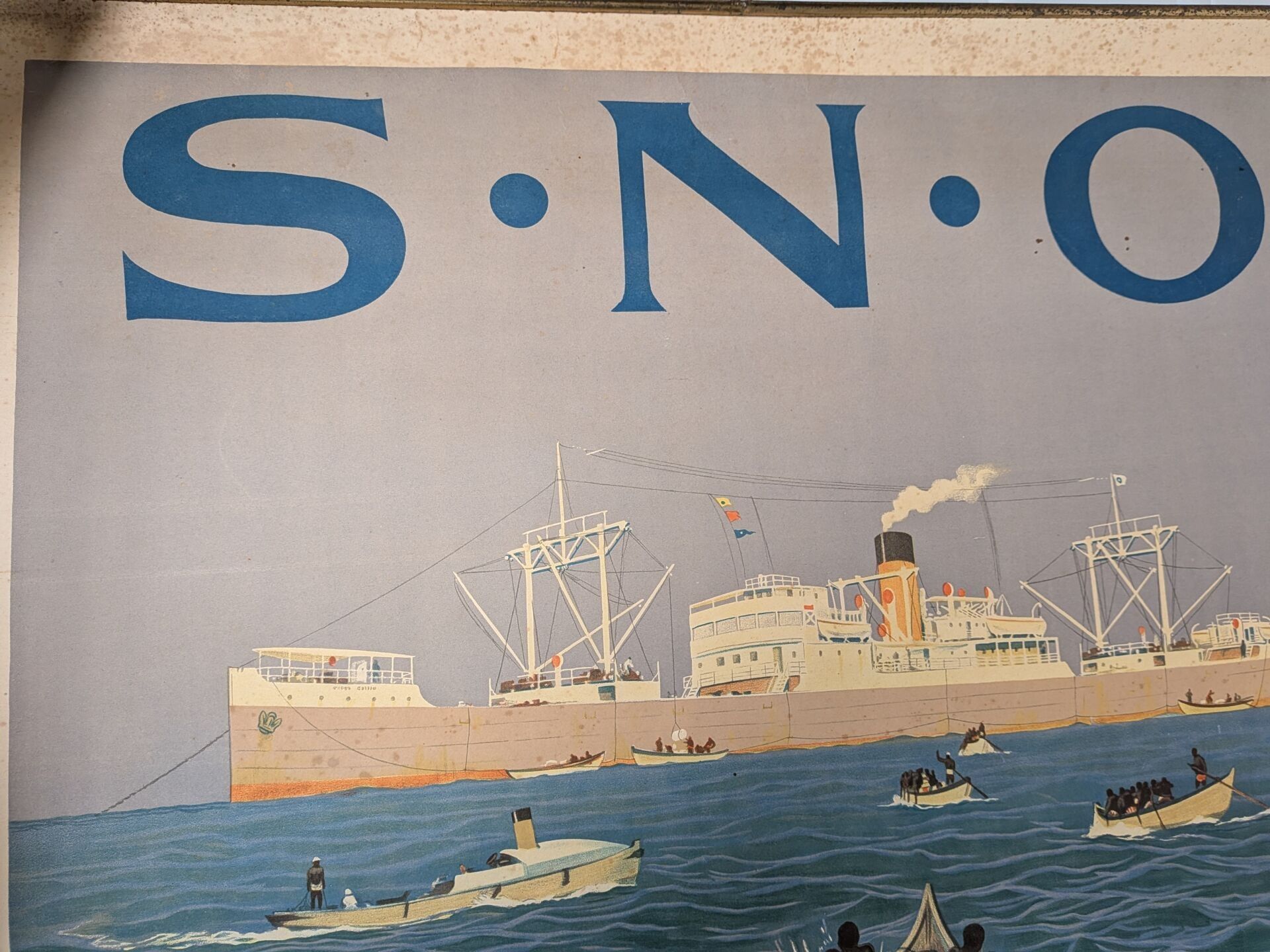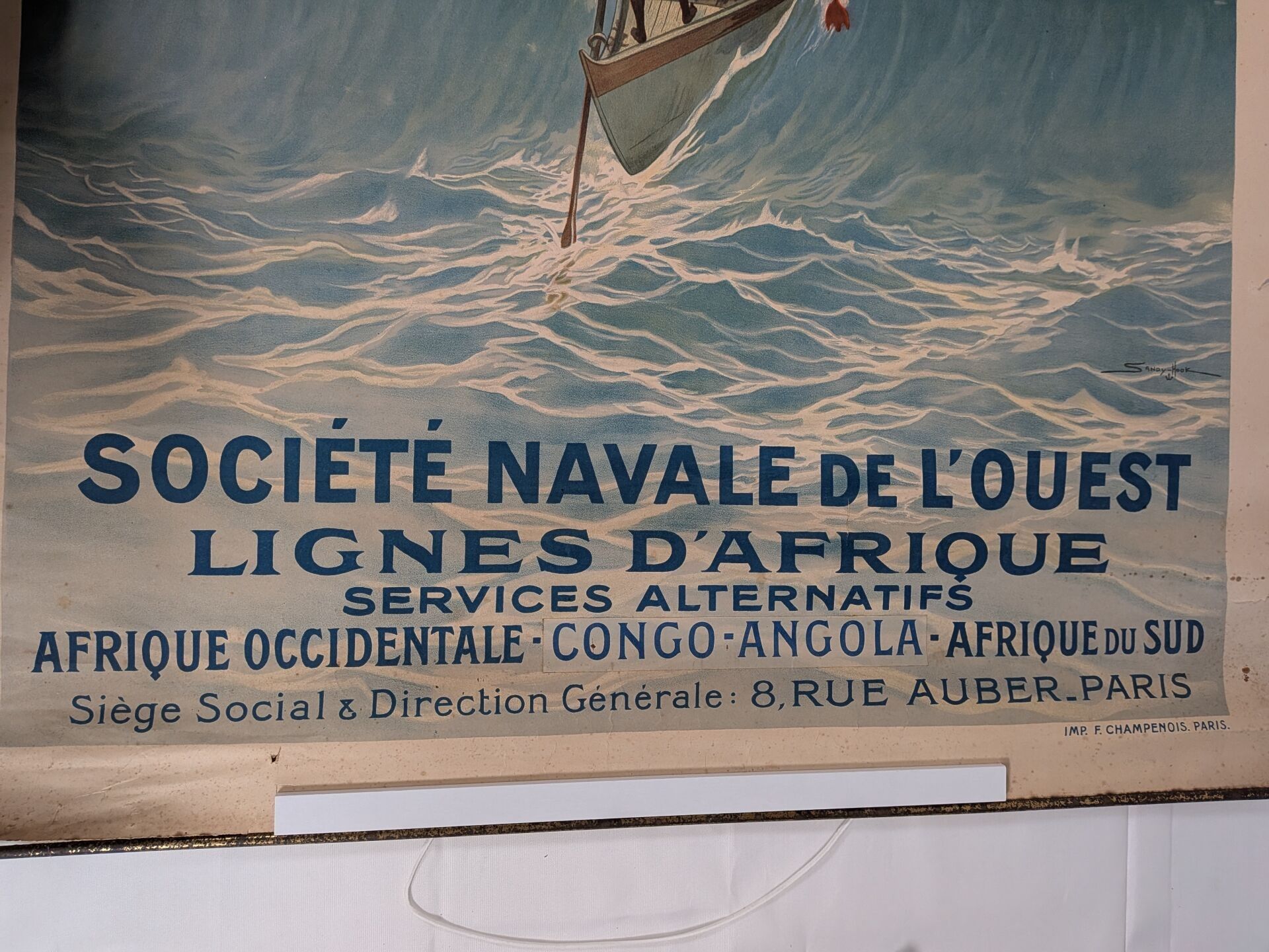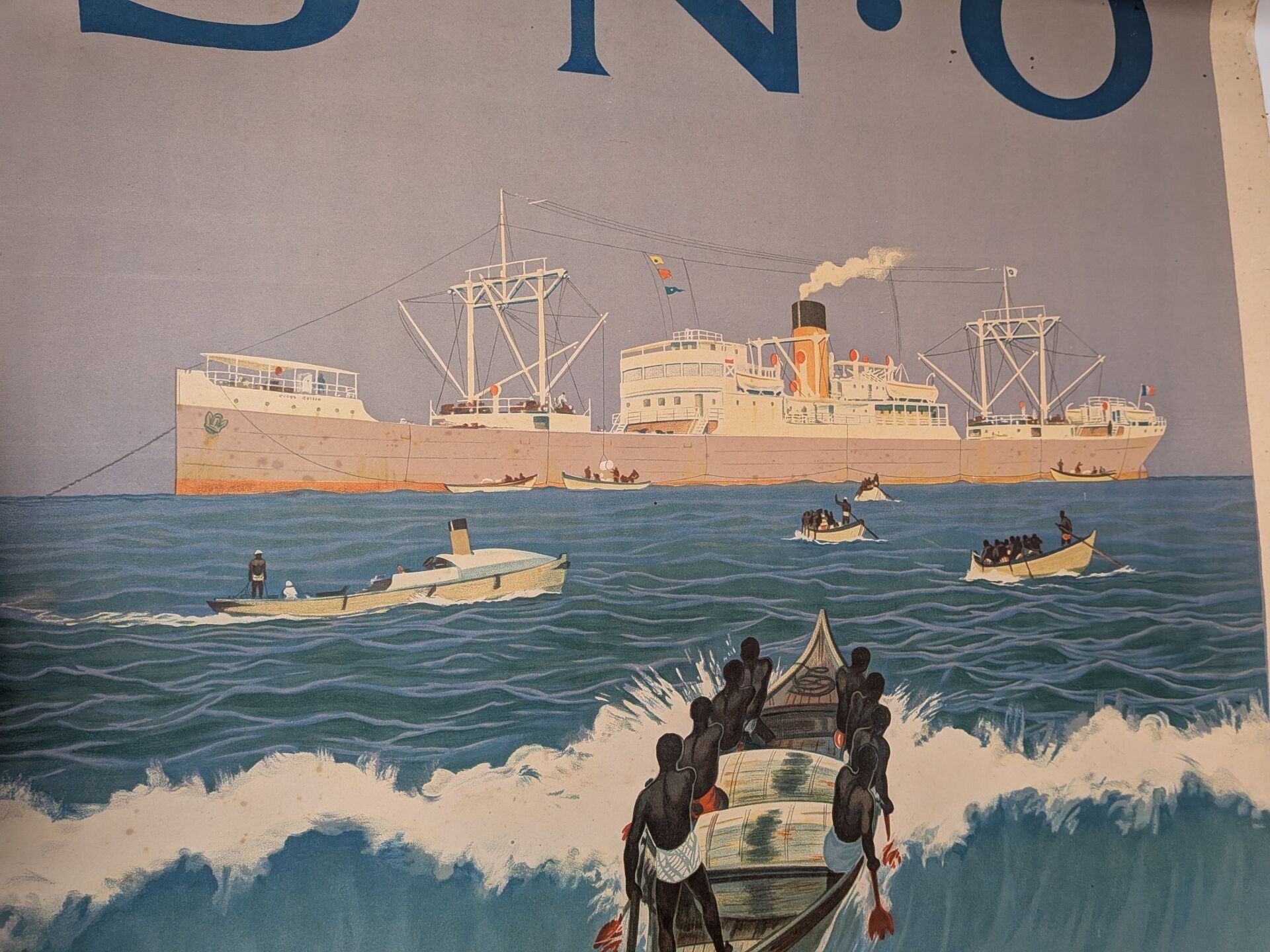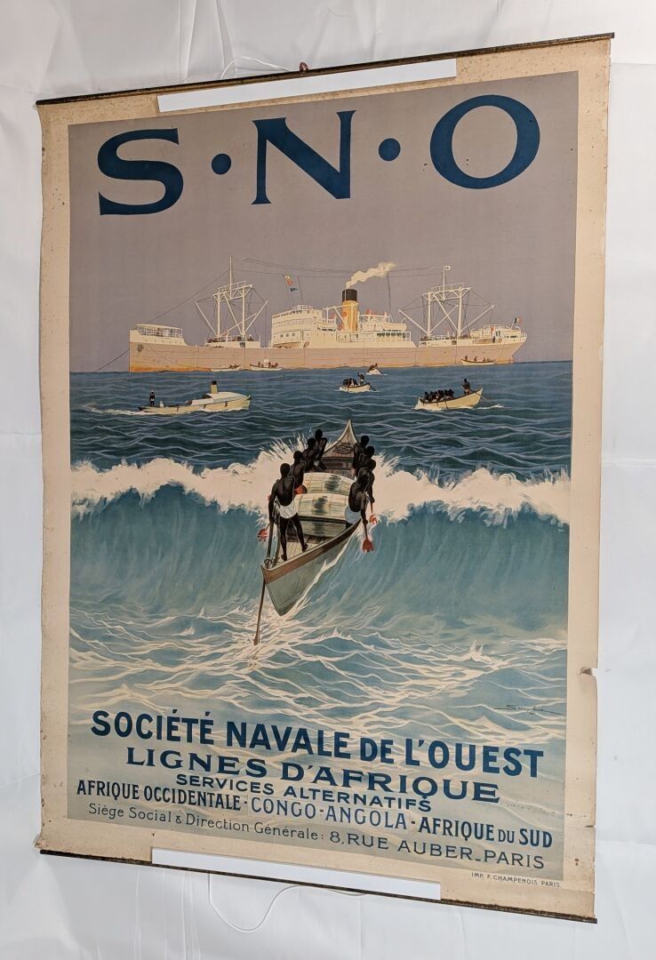 Sandy HOOK (1879-1960), pseudonym of Georges TABOUREAU (Official naval painter, poster artist, illustrator). Old poster S.N.O. Société Navale de l'Ouest lignes d'Afrique alternative services West Africa-Congo - Angola-South Africa. Head office & general management 8 rue Auber Paris, Imprimerie Champenois Paris. Sold as is. 107 x 77 cm