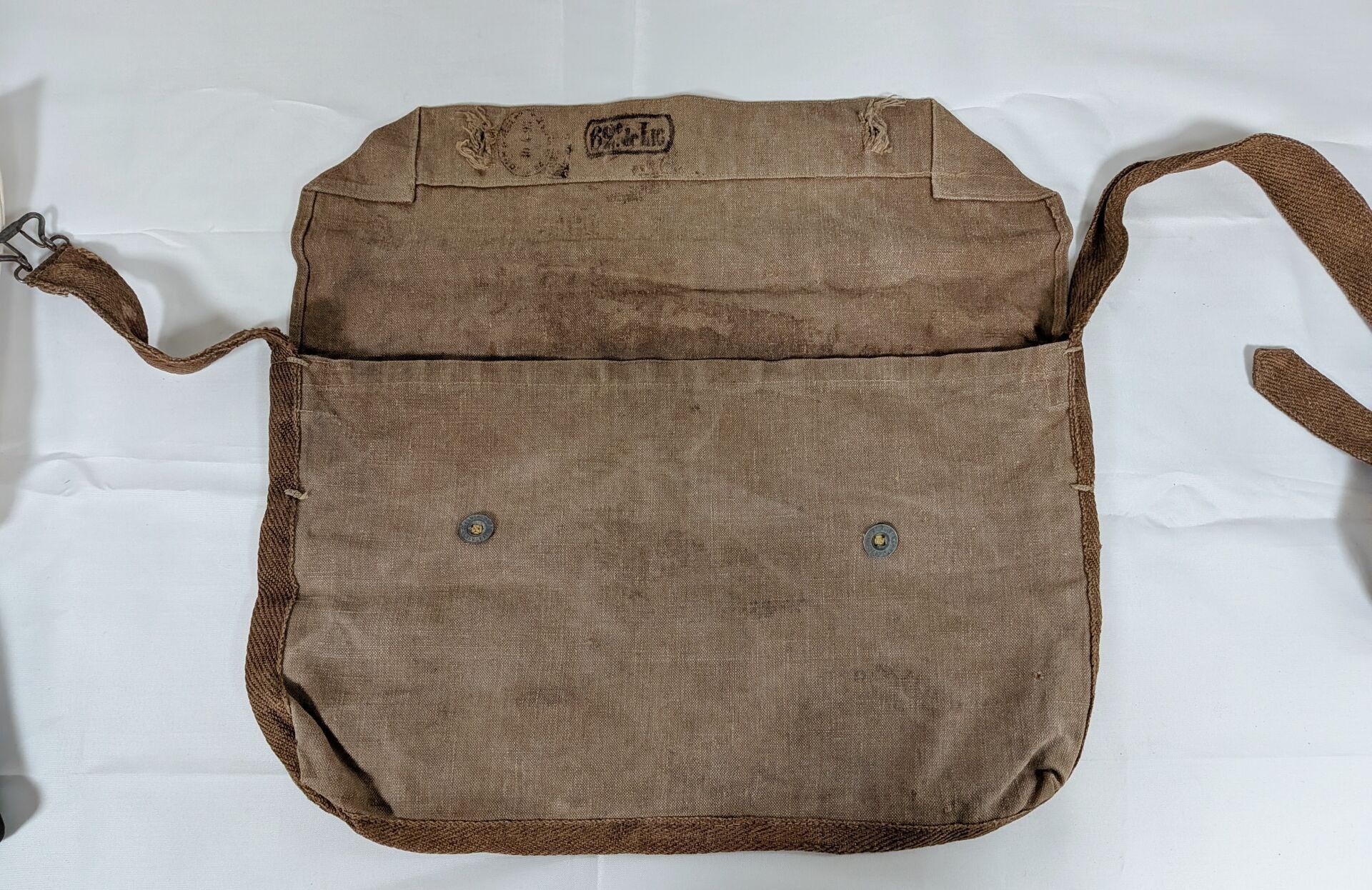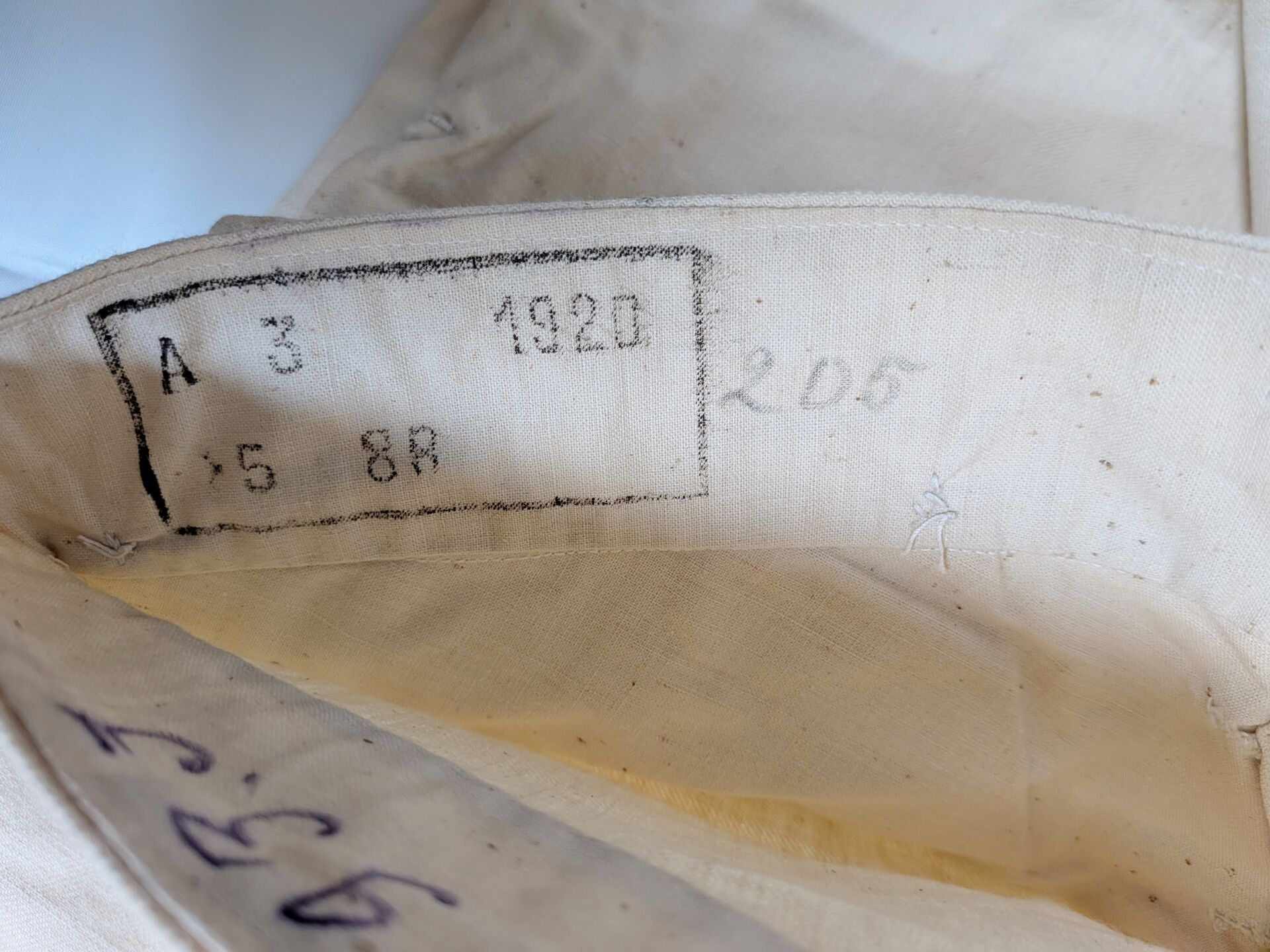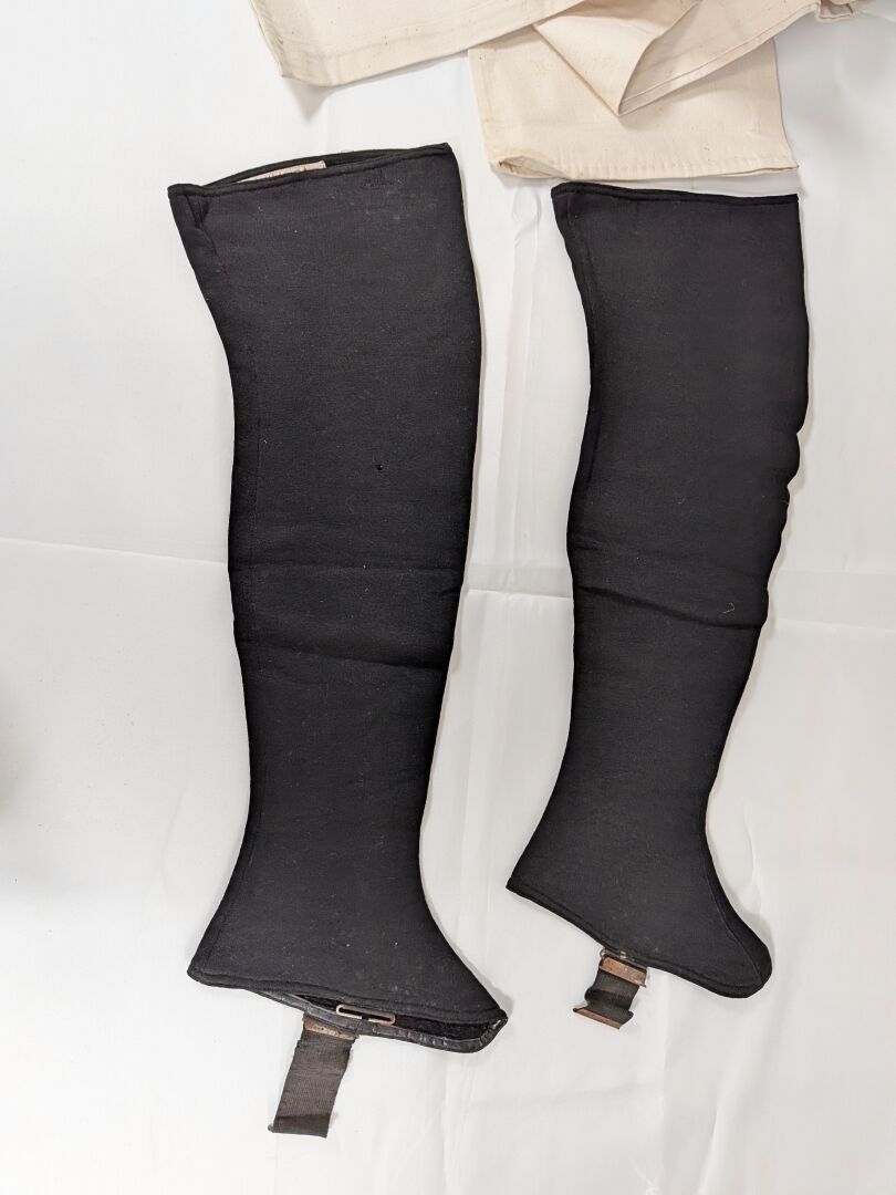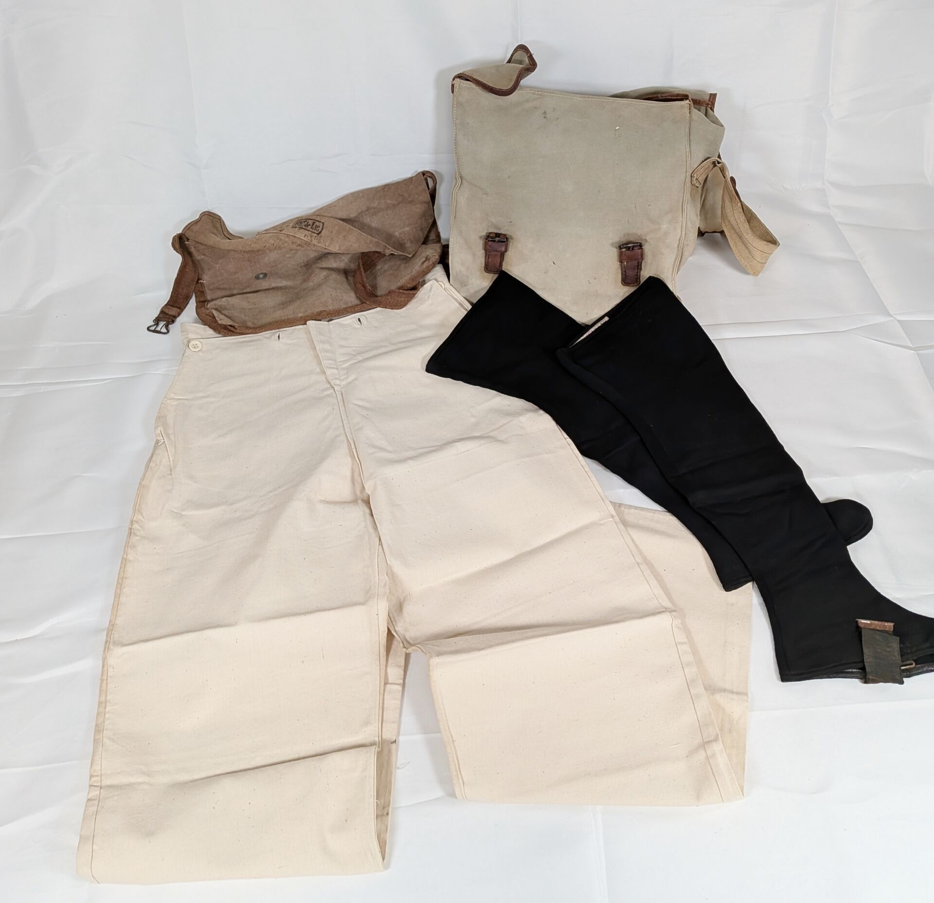 MILITARIA. Africa, 62nd regiment of the line. Lot comprising a pair of canvas trousers dated 1920, a besace bag with buttons marked military equipment (40 x 33 cm), a small bag with buttons marked military equipment and stamped 62nd regiment of the line (37 x 25 cm). One pair of black Edelweiss gaiters is attached.