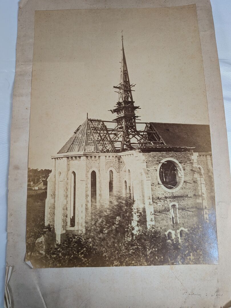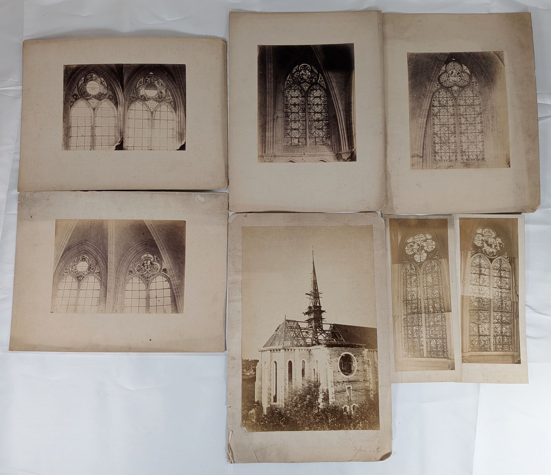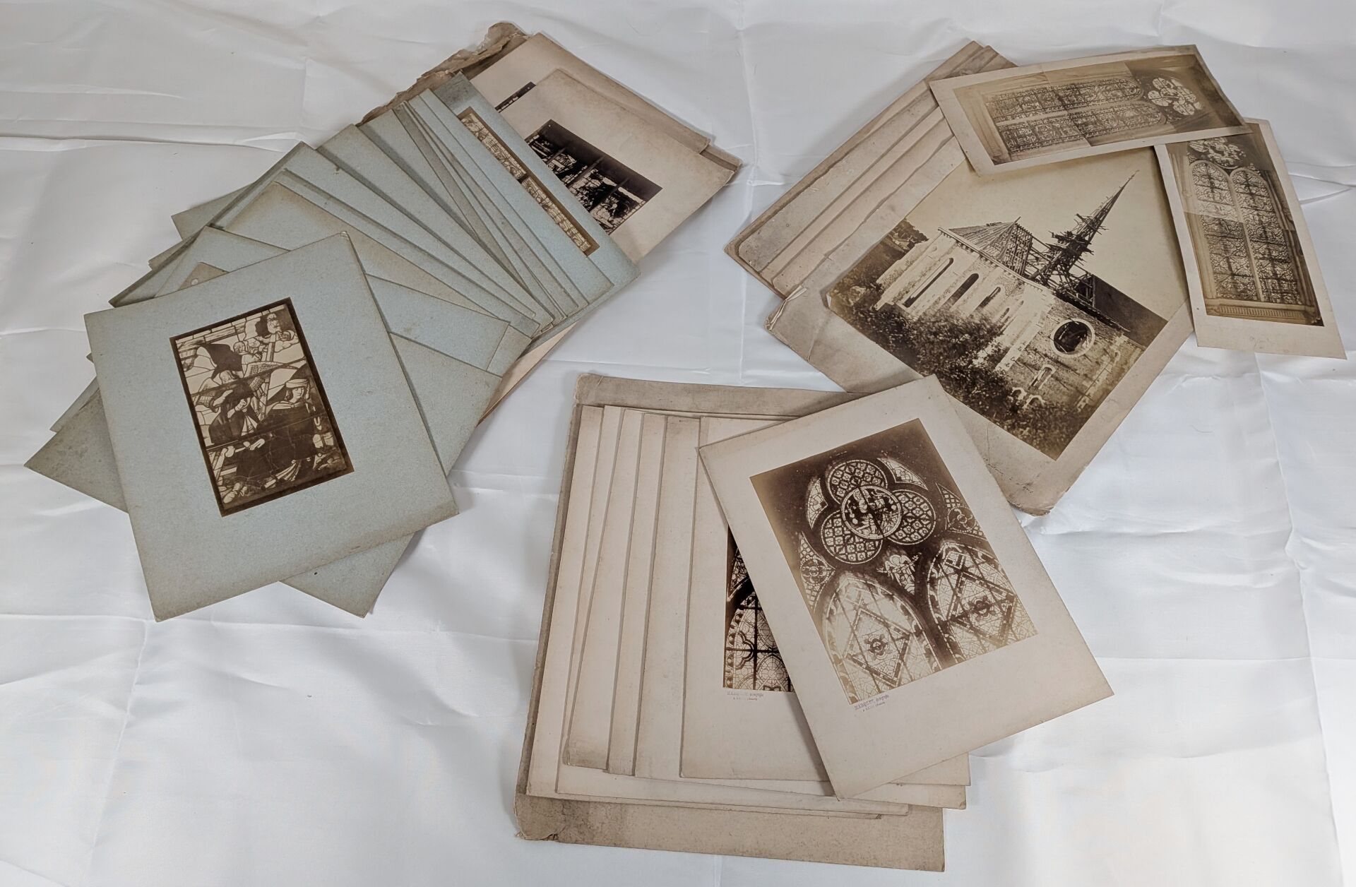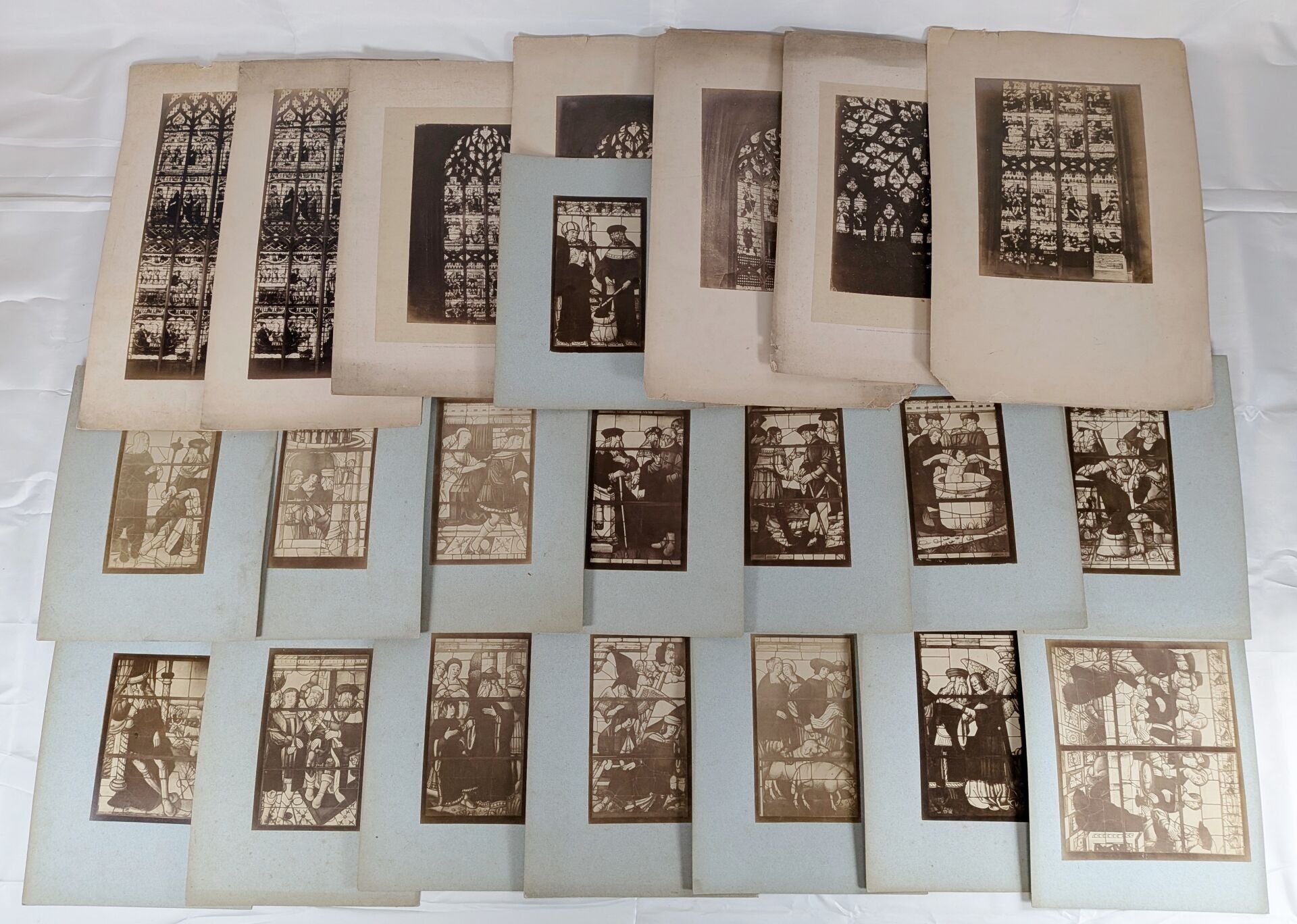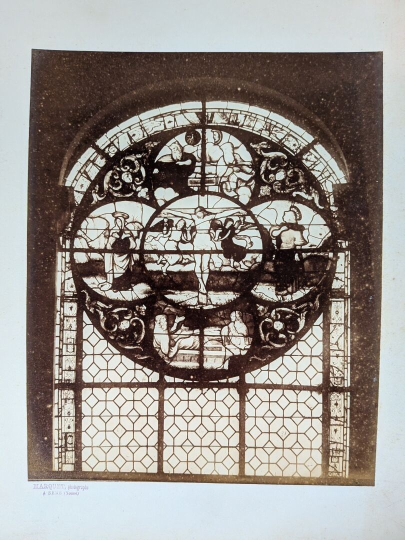 Gustave LANCELOT (1830 Epernay - 1906 Troyes. He settled in Troyes as a photographer and draughtsman from 1857). Set of 22 photographs showing stained glass windows or parts of windows mounted on card. Lot consisting of 7 photographs on white card and 15 photographs on blue card. Sight photographs on white card: 26 x 18 cm and 38 x 16 cm. Sight photographs on blue card: 19.5 x 11 cm.
