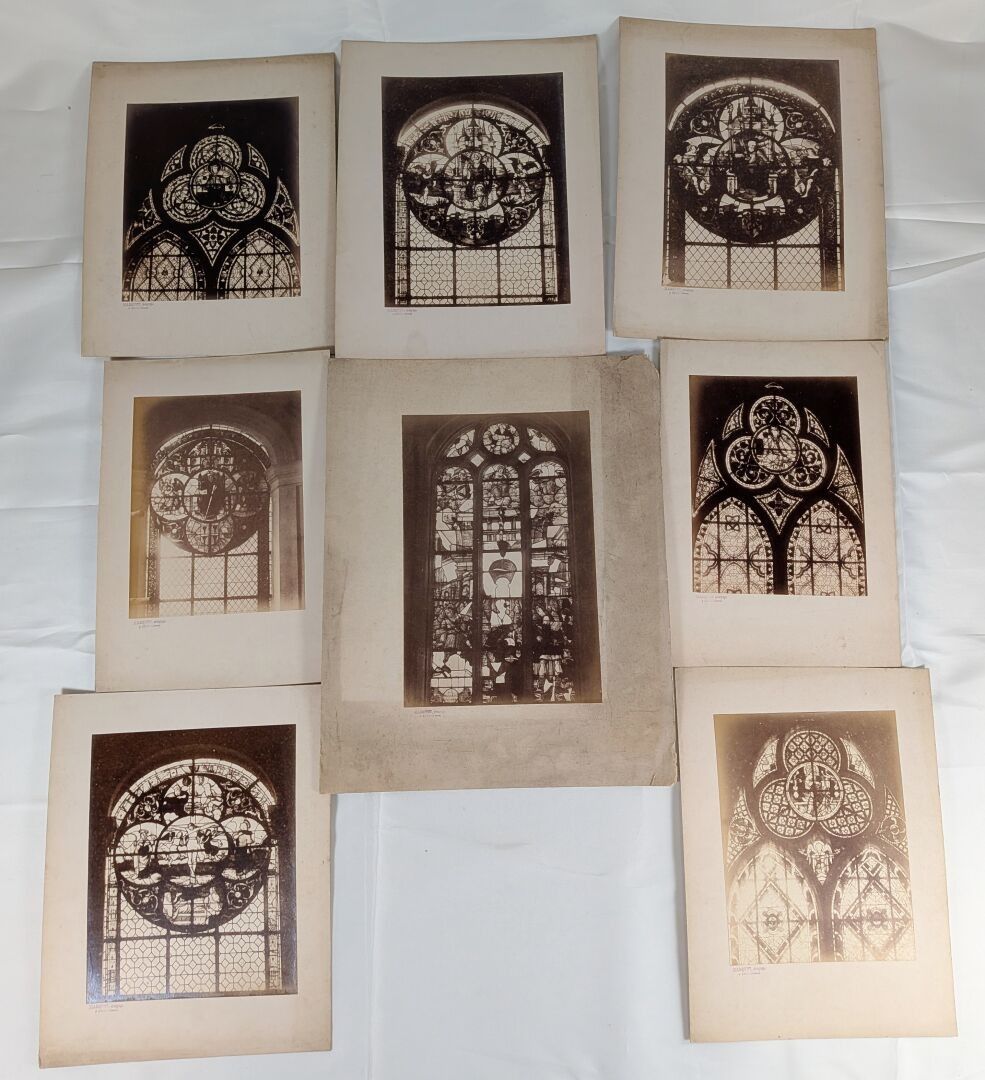 MARQUET, photographer in Sens (Yonne). Lot of 8 photographs mounted on white cardboard depicting stained glass windows (stamp on each photograph) Sight max 28 x 18 cm