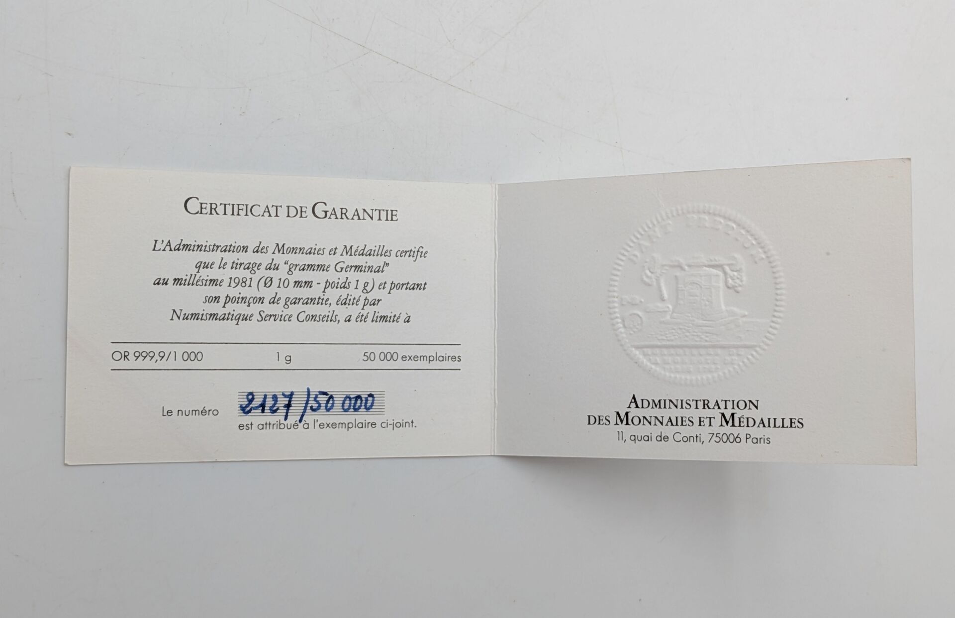 Gold medal 24 K 1 Gram Germinal 1981, 1 gr
