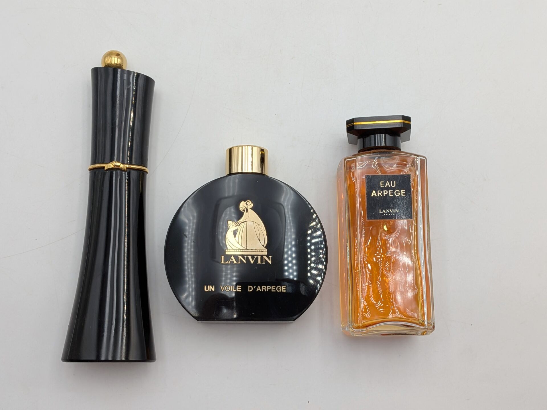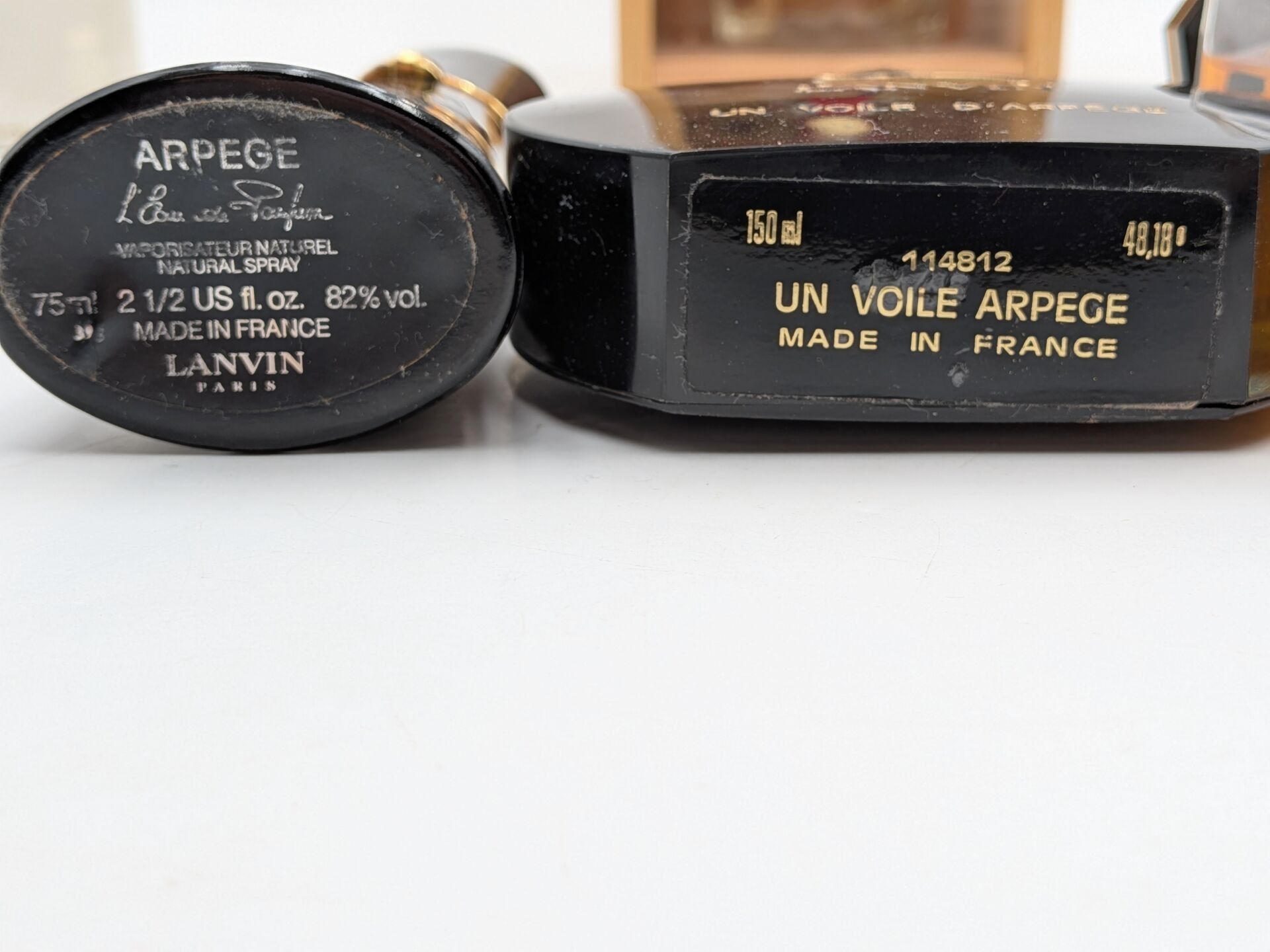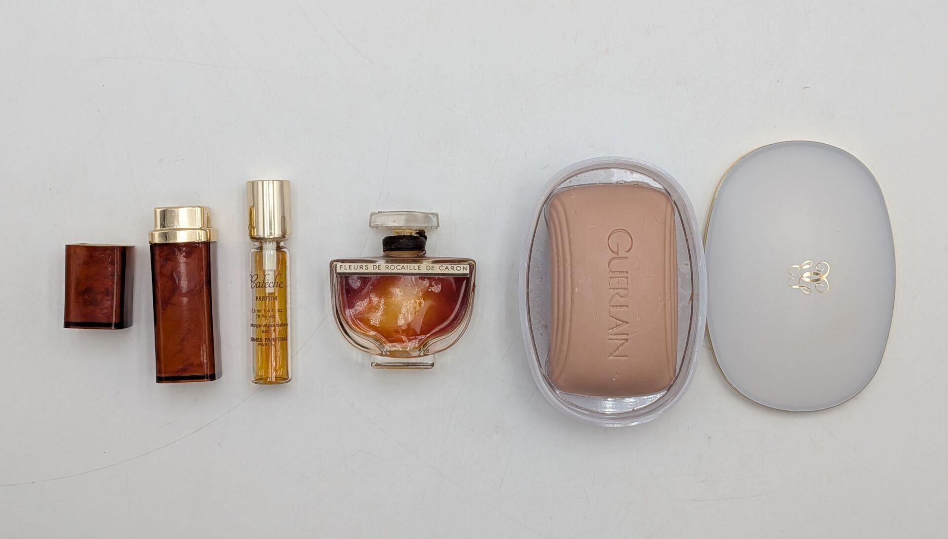 Lot comprising 5 perfume bottles (including Eau de Toilette Spray by Cabotin in mint condition, Fleurs de Rocaille by Caron, and Eau Arpège by Lanvin), 1 handbag spray, 1 Guerlain perfumed soap.