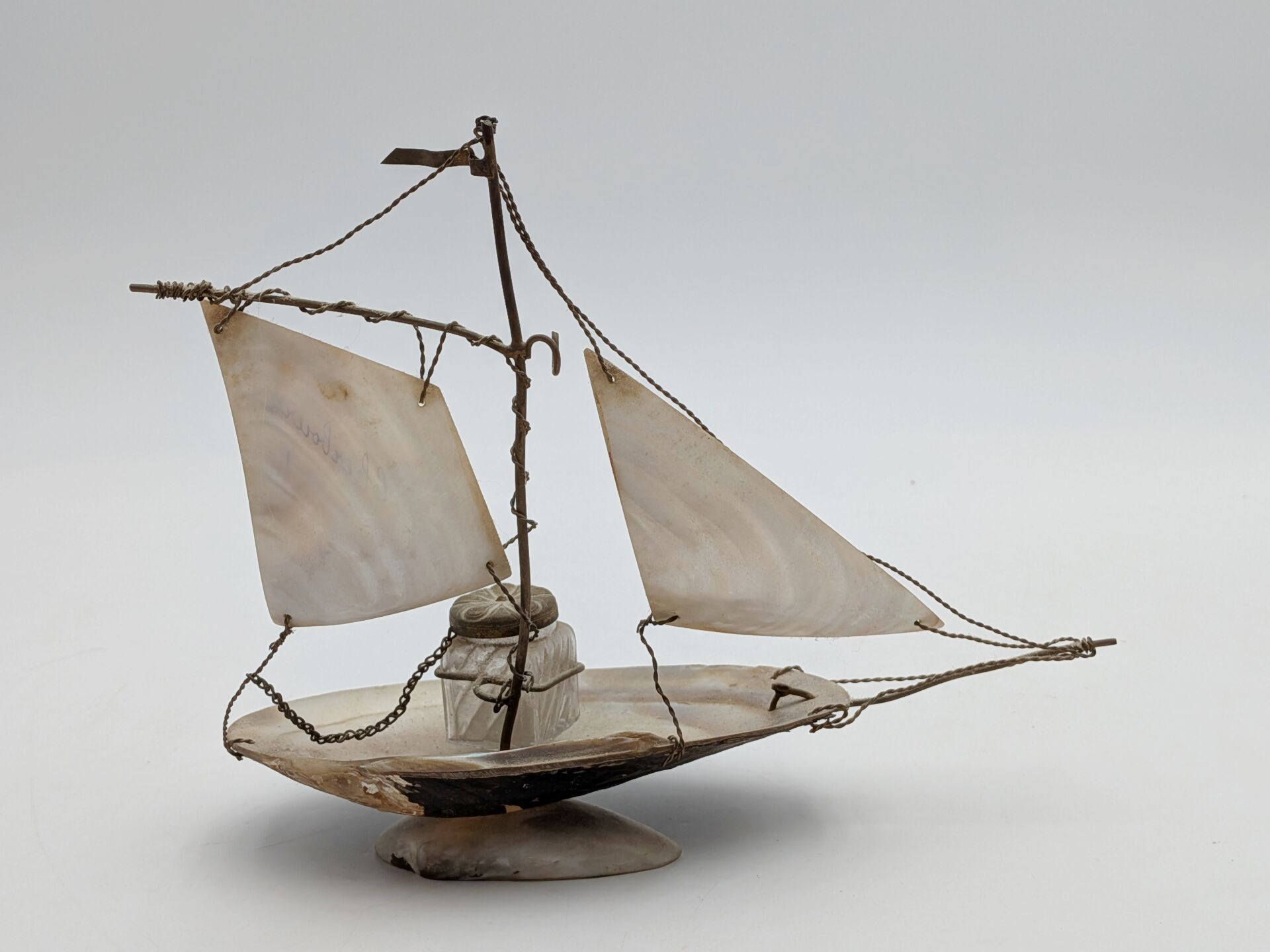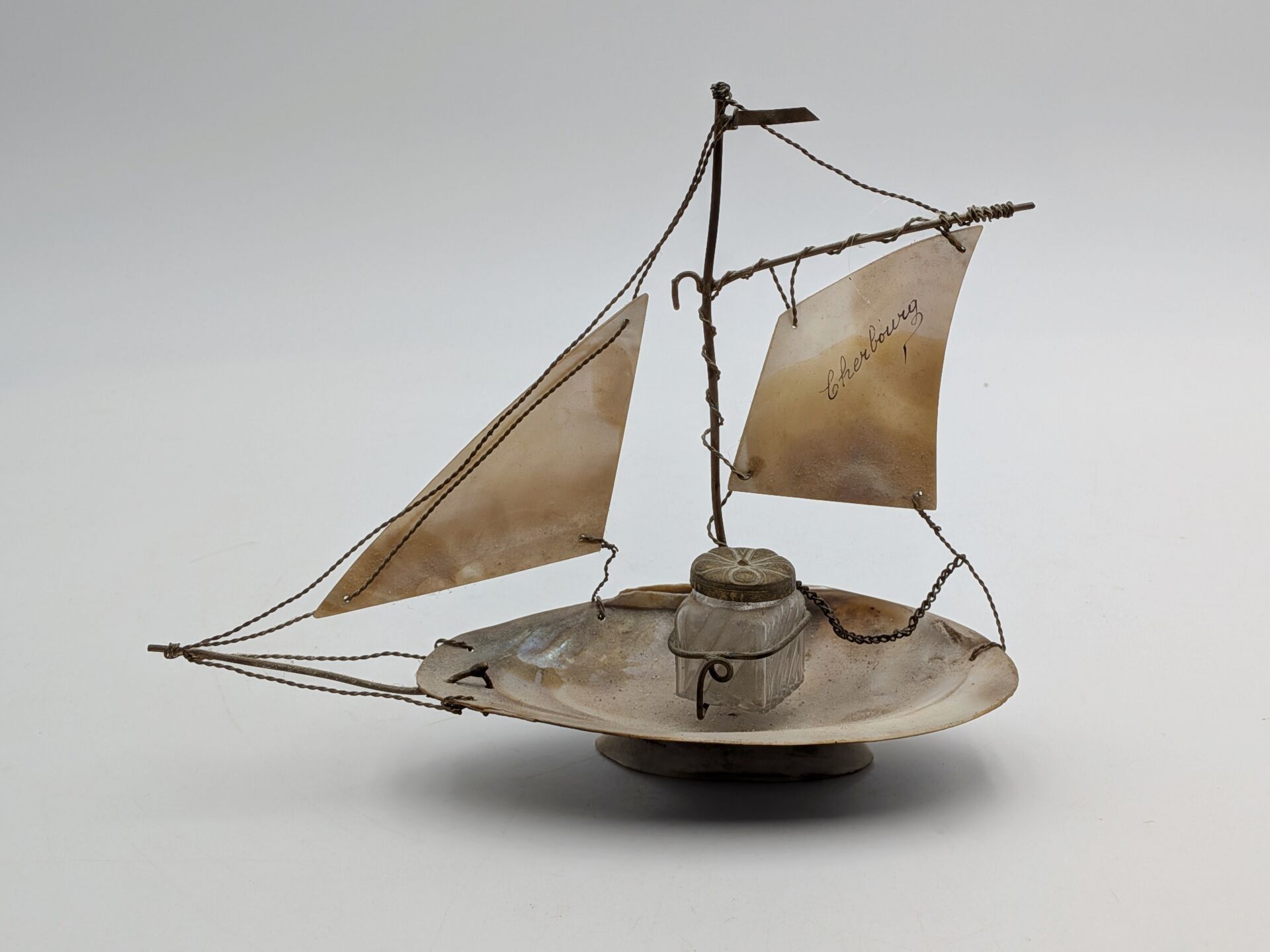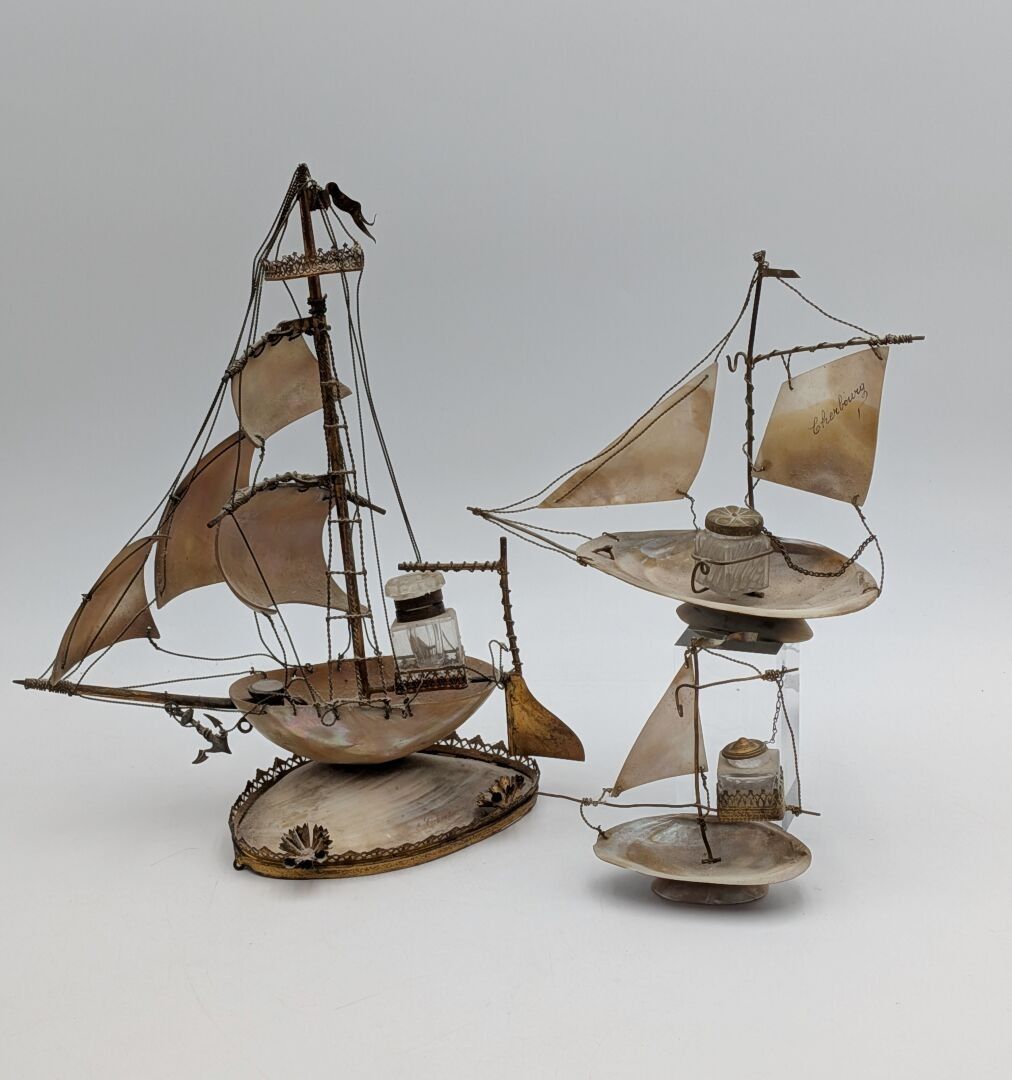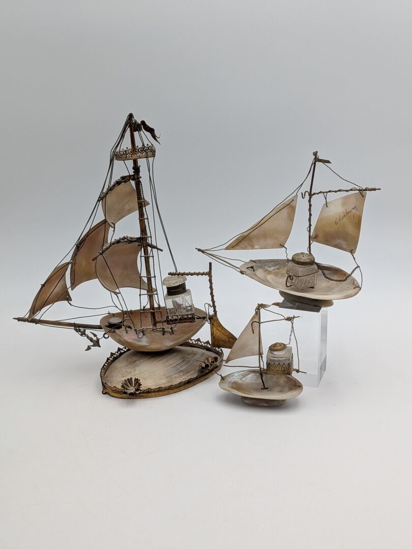 SEASIDE SOUVENIR. Reunion of 3 mother-of-pearl sailboat-shaped inkwells, two marked Cherbourg, H. max 32 cm