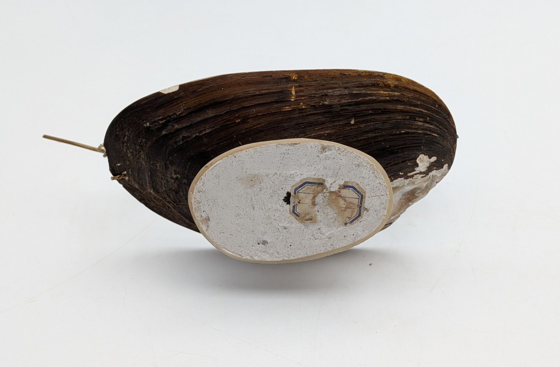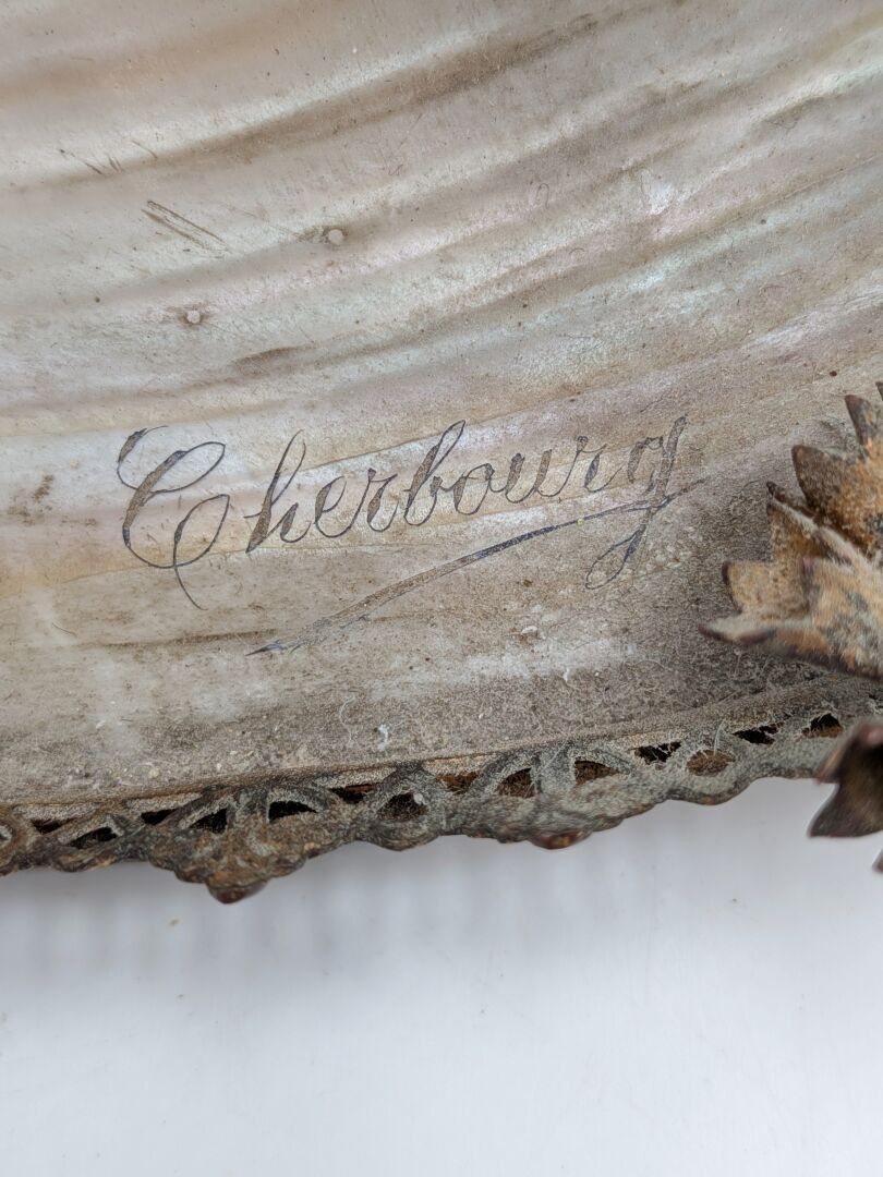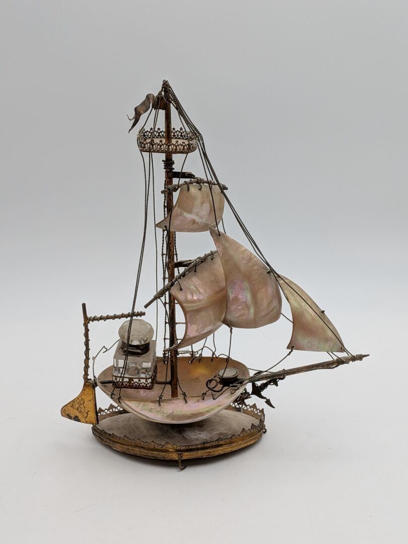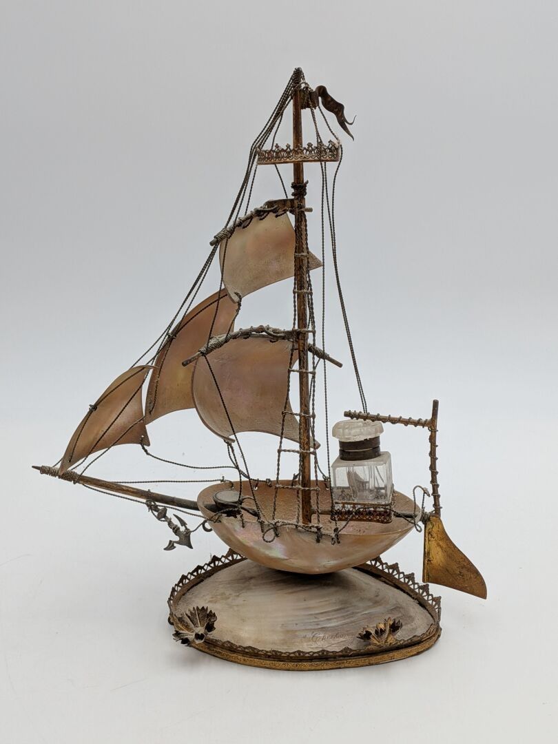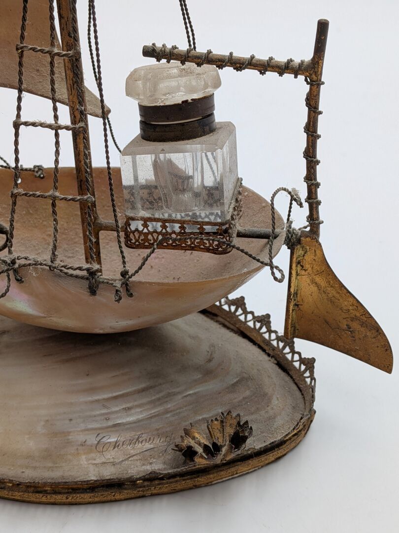 SEASIDE SOUVENIR. Reunion of 3 mother-of-pearl sailboat-shaped inkwells, two marked Cherbourg, H. max 32 cm