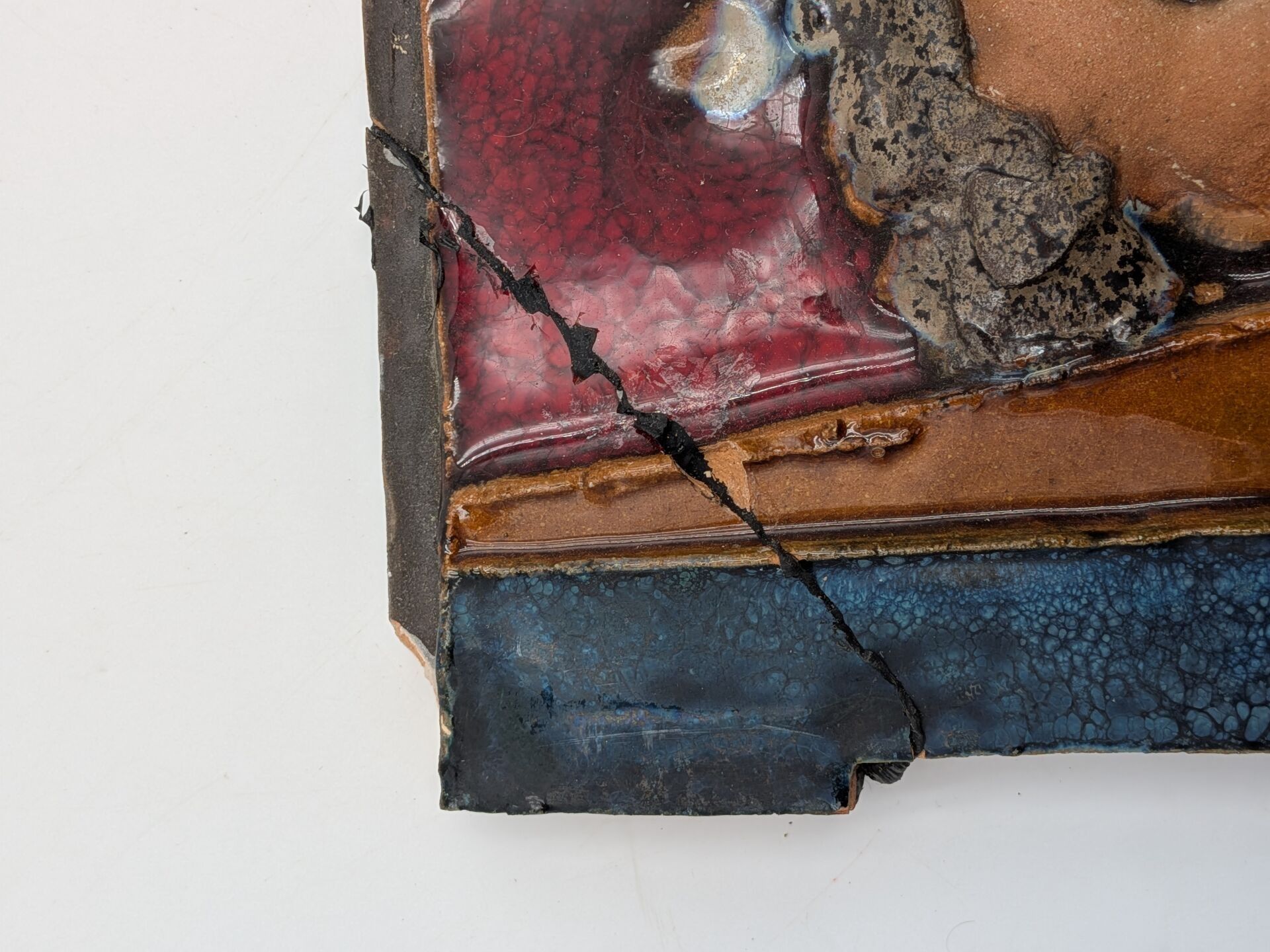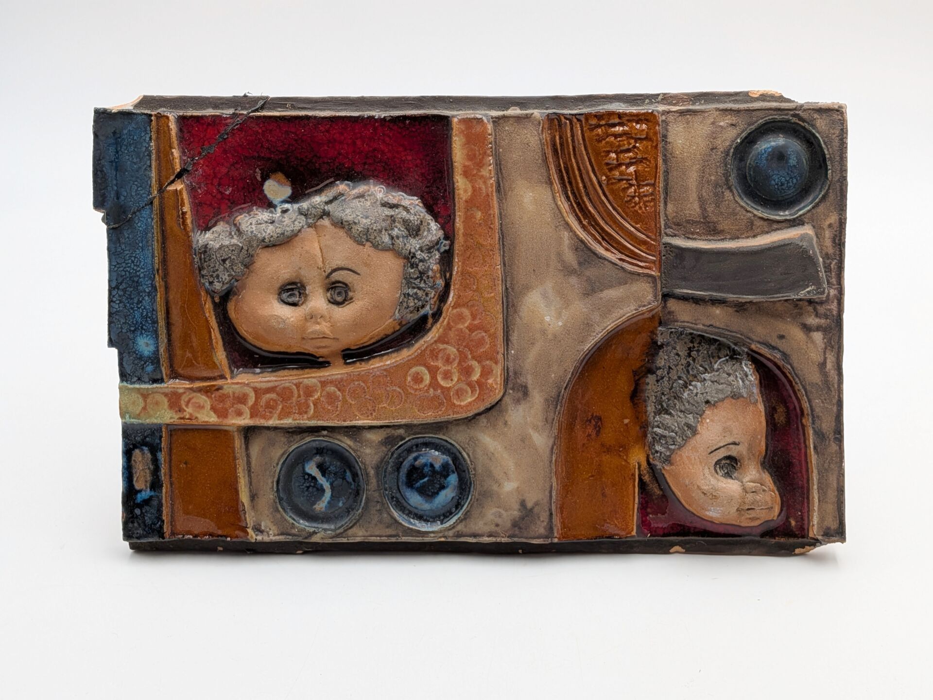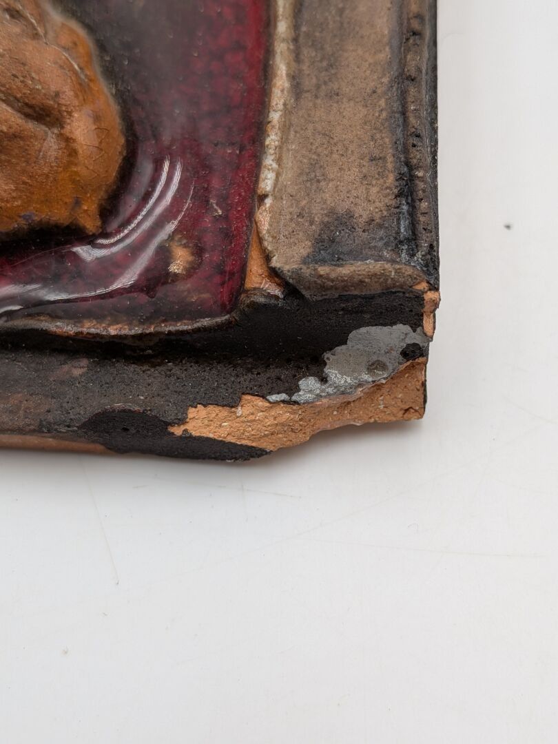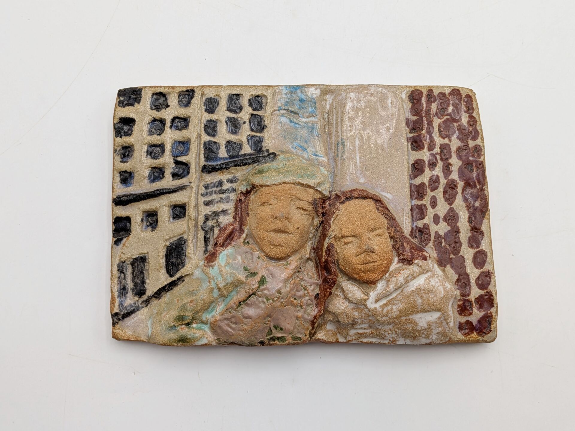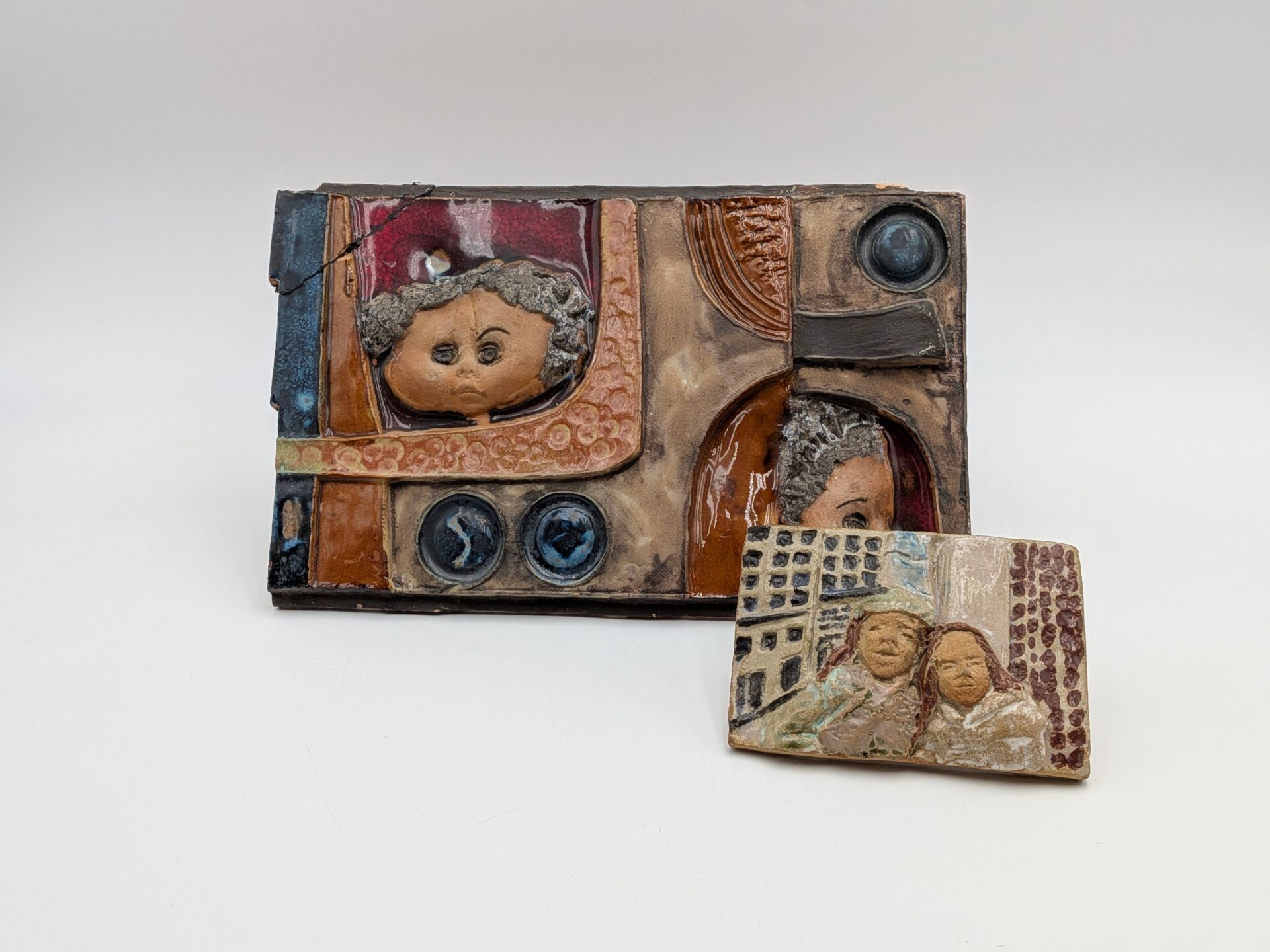 GAUDEBERT Laure (born 1966). Reunion of two stoneware bas-reliefs, partly enamelled, representing figures, the smaller monogrammed (9 x 13.5 cm), the larger restored (20.5 x 31 cm). Minor chips and restoration to a corner of the larger one.