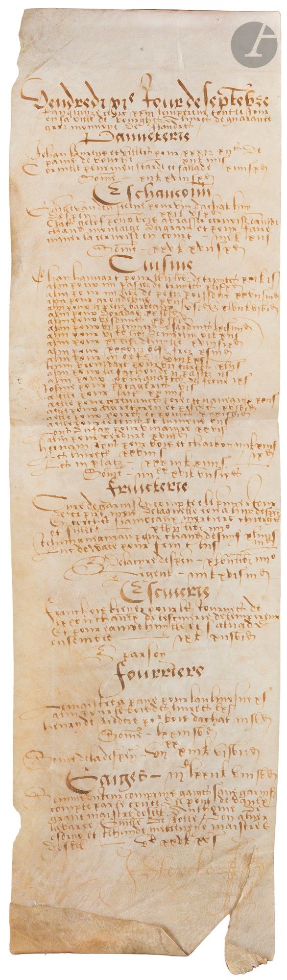 The following are categories of expenditure related to the Burgundian court, with the sums due and the names of the providers: Panneterie / Eschançonnerie / Cuisine / Fruicterie / Escuierie / Fourriere / Gaiges. Under the heading "Cuisine" we find, for example: "Pour iiii paster de truytes / Pour iiiu libres de petiz poissons...".
