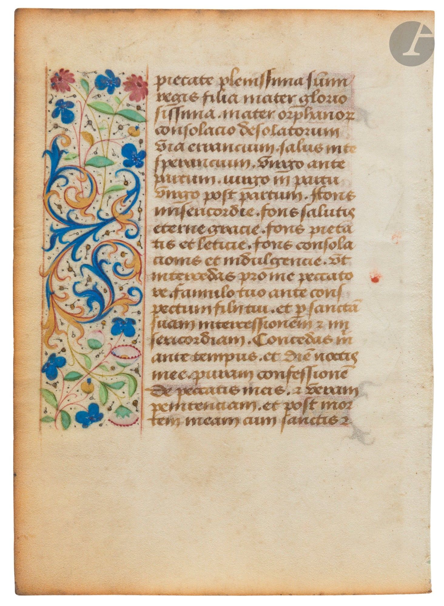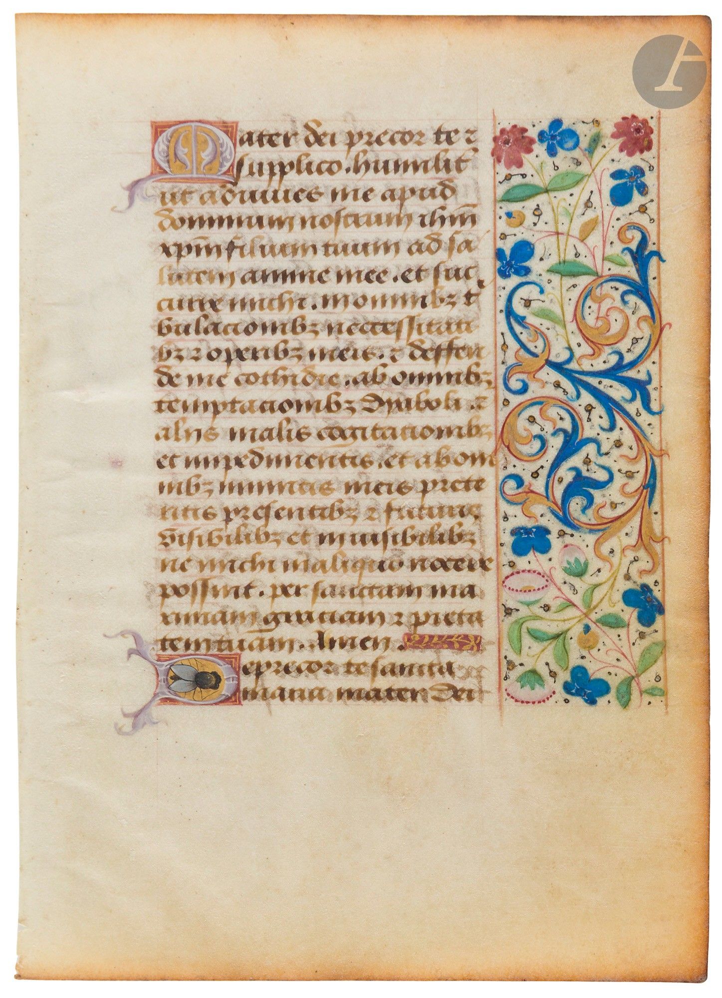Leaf from a book of hours, fine regular bastard written in brown ink, two ornate initials, one painted pale grey with white highlights on a liquid gold and red-brown ground, the other pale mauve on a liquid gold and red-brown ground with a painted fly, illuminated border in the outer margin, with blue and gold acanthus leaves, liquid gold besants, coloured floral motifs.