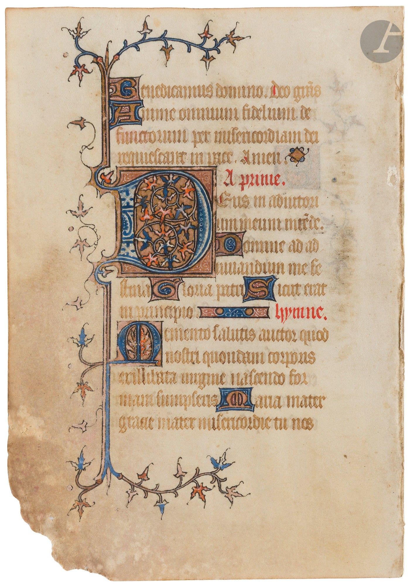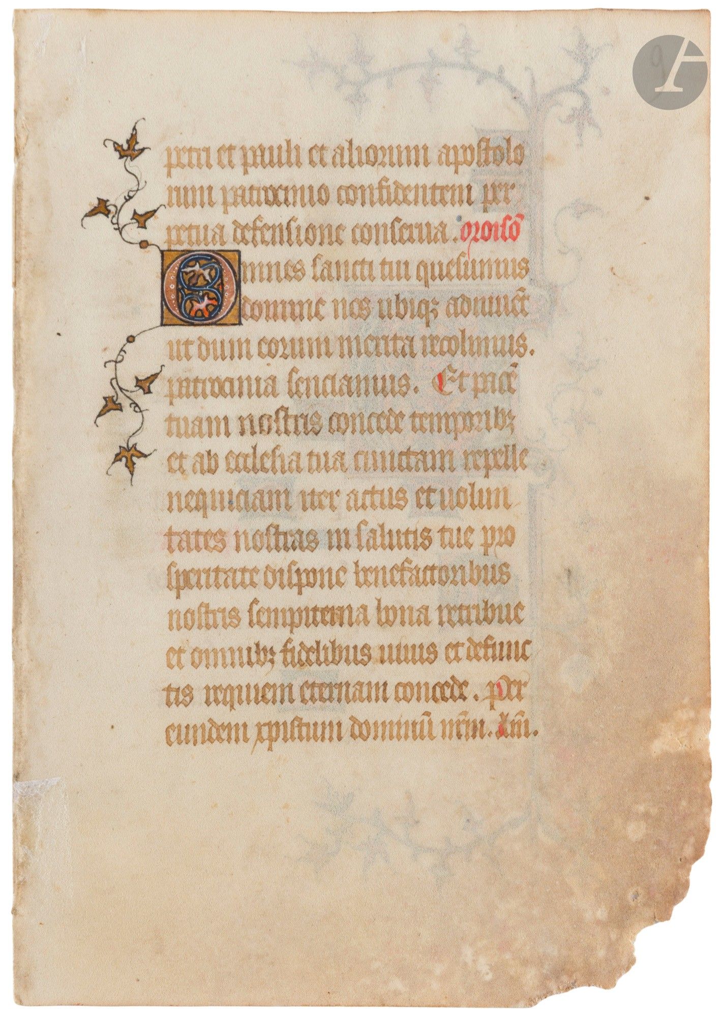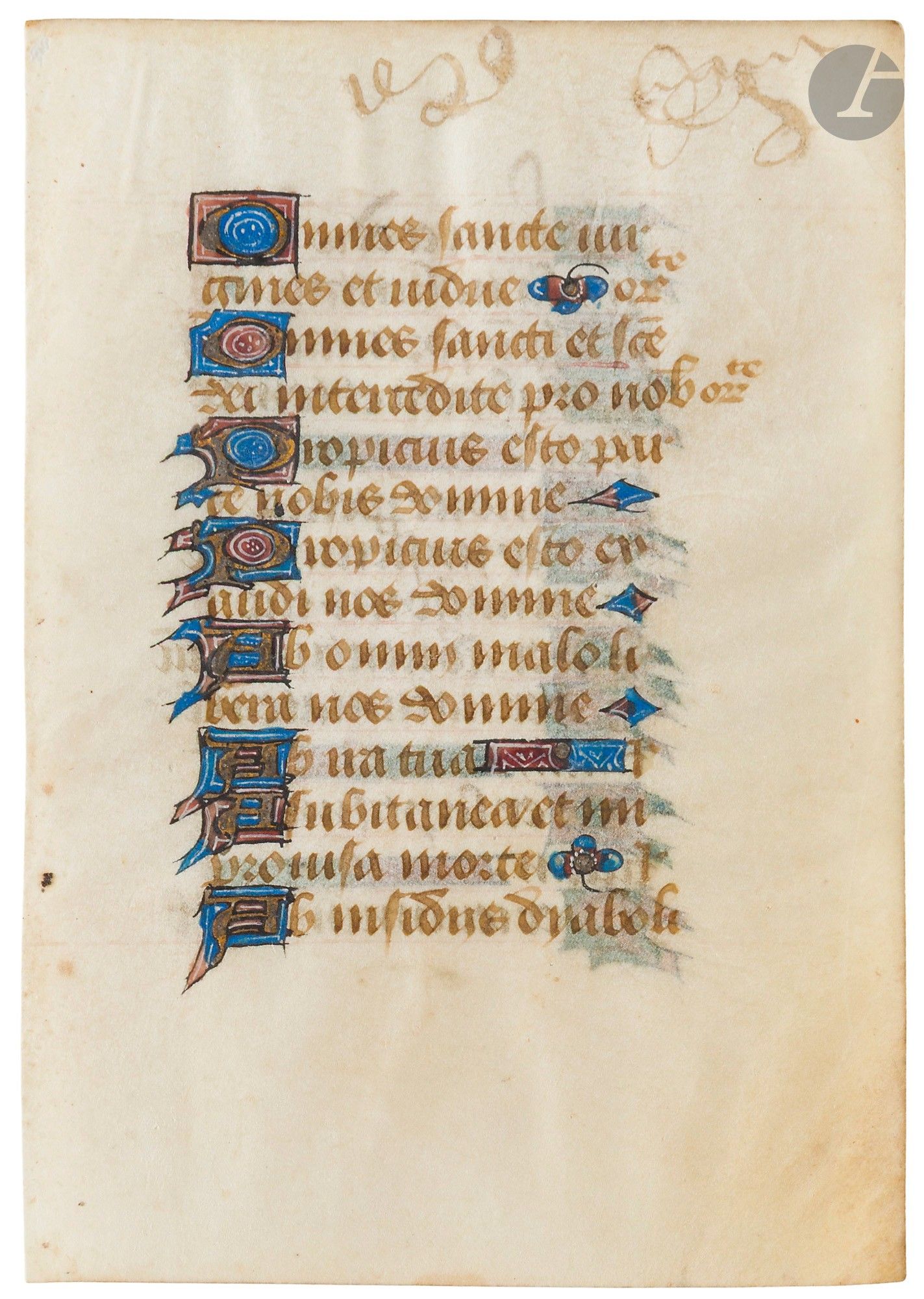1. Leaf from a book of hours, oration, "Omnes sancti tu..." (recto) and prime (from the Hours of the Virgin?) (verso). (recto) and prime (from the Hours of the Virgin?) (verso). France, Paris, circa 1380-1400 ? In Latin. Gothic script in brown ink, headings in red and French, small initials in burnished gold on blue and/or pink backgrounds, line ends in the same way, on verso initial (2 lines high) painted in pink with white highlights and coloured vine decoration, on recto large initial D (5 lines high) in blue with white highlights, coloured vine decoration, on pink background. Dimensions: 150 x 105 mm