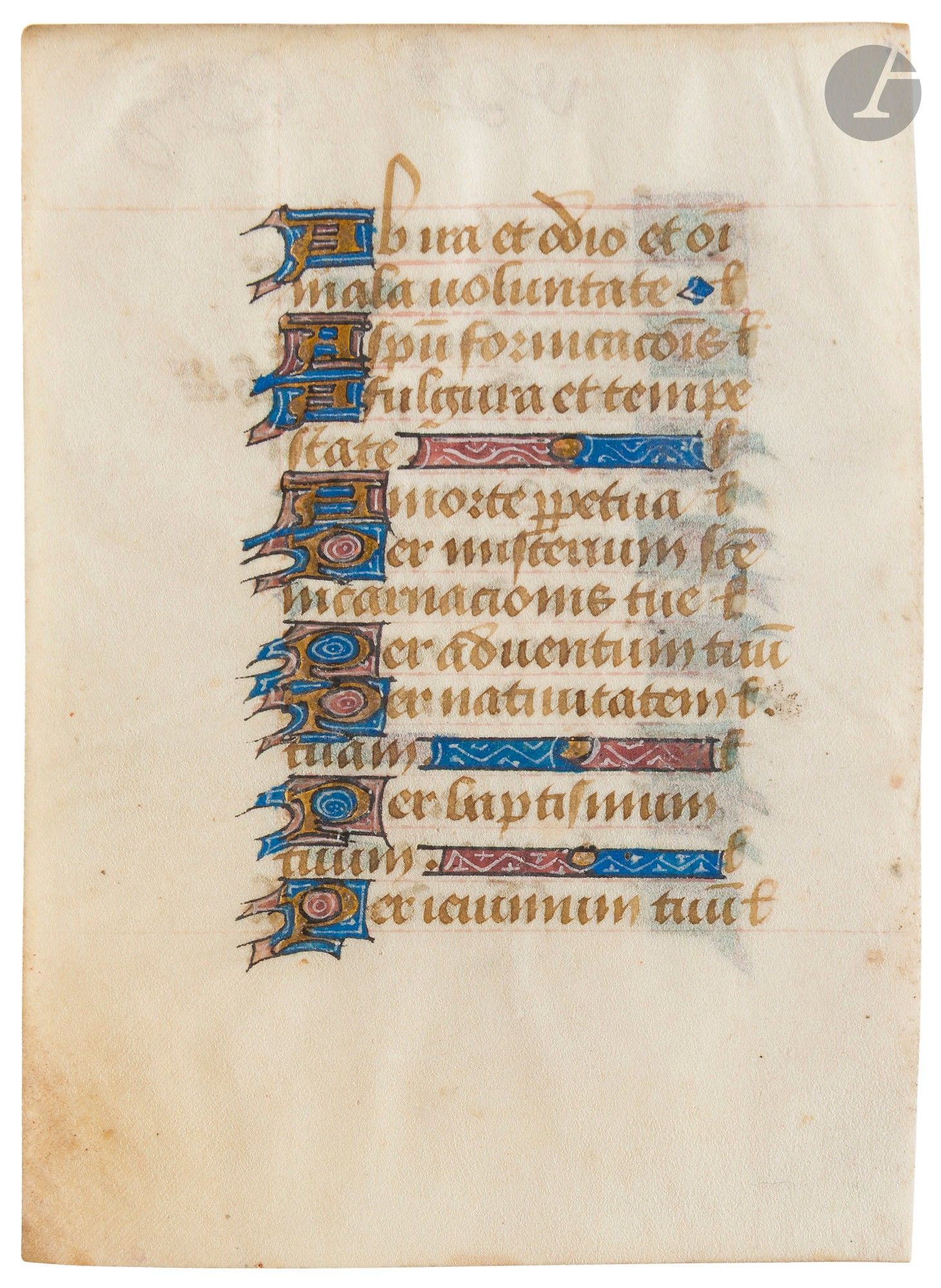 3. Leaf from a book of hours, small format, prayers after the litanies of the saints. France, circa 1450-1475. In Latin, bastard script in brown ink, initials in burnished gold on a pink and blue background, line ends in the same style.