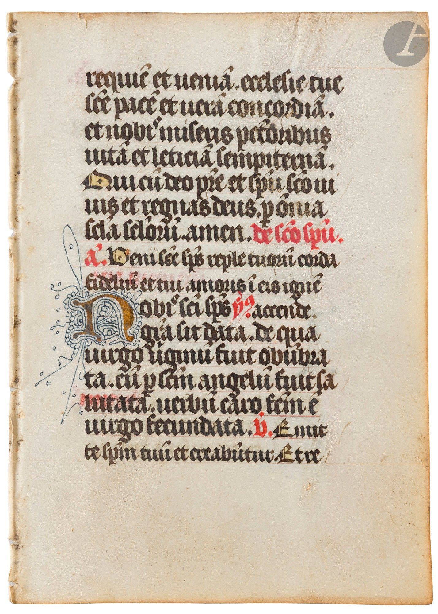 2. Leaf from a book of hours, recto, end of Lauds (?) from the Hours of the Holy Spirit and verso, beginning of Prime from the Hours of the Holy Spirit (?), hymnus, "Veni creator spiritus". Northern France or Belgium, circa 1450. In Latin, Gothic script in dark brown ink, headings in red, small initials painted in red or blue, two-line high initials in blue or gold with red or dark blue filigree decoration, large "puzzle" initial in blue and gold with red and blue filigree decoration.