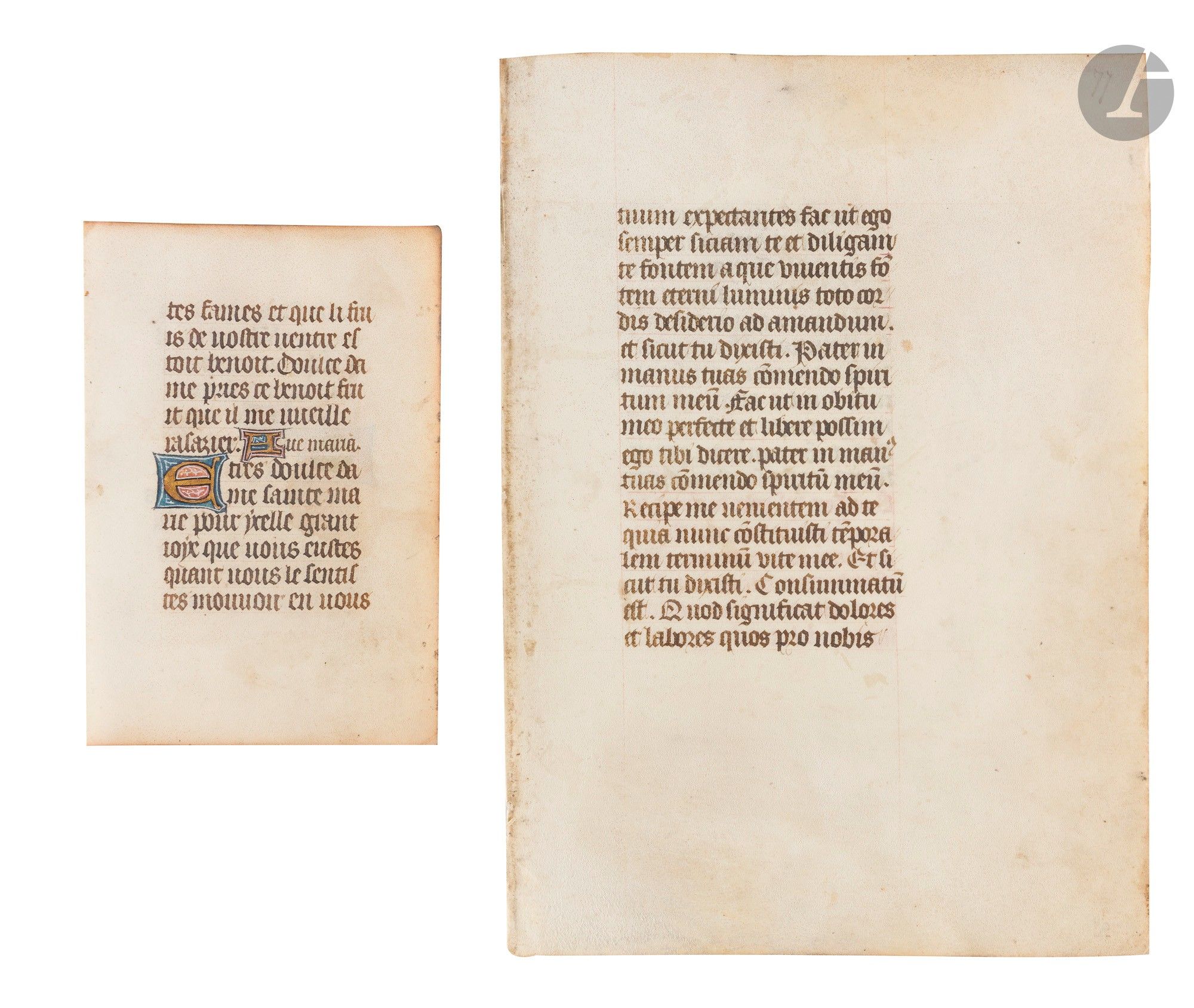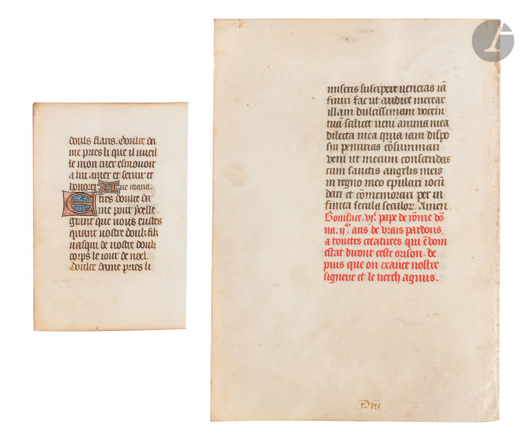 Joint: Leaf extracted from a book of hours, on parchment, brown ink and rubric in red ink, with the end of a prayer included in the text known as Sept requêtes à Jésus Christ [Domine Ihesu Christe qui septem...], followed by a long rubric in French announcing a text by Boniface VI on indulgences. Note the "tierch" form, reminiscent of the dialects of northern France. Dimensions: 212 x 152 mm