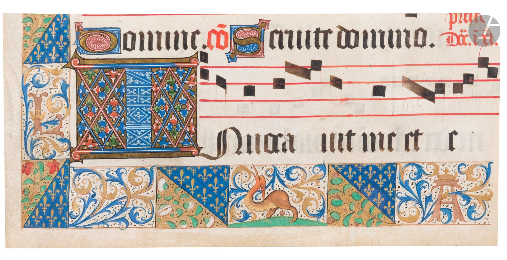 [ILLUMINATION]. Fragment from the Gradual of Louis XII and Anne of Brittany. In Latin, illuminated manuscript on parchment. France, Paris (?), circa 1499-1500 Dimensions: 415 x 230 mm This fragment, with the introit Invocabit me et e(go) for the first Sunday in Lent, is taken from the Gradual of Louis XII of France and his second wife, Anne of Brittany, produced in Paris around 1500. This manuscript was undoubtedly intended for use in the royal Sainte-Chapelle in Paris, as suggested by the depiction of Louis and Anne kneeling in prayer before its most famous relic, the Crown of Thorns, in a historiated initial from the same manuscript, now in the Musée Dobrée in Nantes. (See Catalogue Galerie Les Enluminures, 1994, no. 28). According to Le Roux de Lincy, the manuscript was dismembered around 1840, when fragments began to appear on the art market in France. Other historiated initials in the manuscript include the Last Supper and Pentecost (Firmin-Didot sale, Paris, 10 June 1884, lot 78; Sotheby's, 1 June 1905, lot 723, then again on 7 December 1924, lot 900; the miniature of Pentecost was attributed by J. Günther to Jean Pichore in Brochure 9, 2006, no. 55), the Creation of Eve, Noli me Tangere, Saint Mary Magdalene and the Trinity (Sotheby's, 8 July 1974, lots 26-29). Horizontal cut-outs with lines of text and musical staves similar to our fragment have survived, as for the Second Sunday of Advent (Delorme-Collin du Bocage sale, Hôtel Drouot, Paris, 15 December 2004, lot 8), Quinquagesime Sunday (Sotheby's, 29 November 1990, lot 39, and again on 2 July 2013, lot 7), Ash Wednesday (Galerie Les Enluminures, 2004, no. 24 ; Sotheby's, 6 December 2005, lot 21), and the first Friday of Lent (sold by Librairie ancienne Bruno Sepulchre in 2010). Complete leaves include that for the feast of Saint Mary Magdalene with a historiated initial illustrating her Ascension (Sotheby's, 5 July 2016, lot 45) and that for the third Sunday after Easter (Wellesley College, Massachusetts, MS 6). Several bands of border ornaments and initials have also been identified, such as the one in the Lilly Library, Bloomington (Indiana), Ricketts 107 (see De Hamel, 2010, whose entry provides a list of known fragments); or the one in Philadelphia, Free Library, Lewis T 659 (see Nicolas Herman's Blog, 2020). The texts identified indicate that this impressive choir book included both the Temporal and the Sanctoral. The largest complete surviving page shows that the volume was substantial, measuring 685 x 515 mm. It was illuminated by a team of renowned Parisian illuminators, including the Master of Philippe de Gueldres (Louis and Anne before the Crown of Thorns), Jean Coene (Ascension of Mary Magdalene) and Jean Pichore (Pentecost). Many extracts include the royal arms of France, the crowned initials L and A (as in the present extract), the ermine of Brittany, and the leaf showing the Ascension of Mary Magdalene (Sotheby's, 5 July 2016, lot 45) includes the arms of Orléans, Louis's arms before he was crowned king on 7 April 1498. The folio held at Wellesley includes the arms of France quartered with those of Milan, suggesting that the manuscript was illuminated during the period when Louis was both King of France and Duke of Milan, from 6 September 1499 to 5 February 1500. See : Le Roux de Lincy, A. La Vie de la Reine Anne de Bretagne, 1860-61, II, p. 86. - De Hamel, C. Gilding the Lilly: A Hundred Medieval Illuminated Manuscripts in the Lilly Library, Bloomington, 2010, no. 83, pp. 182-183. - Blog Nicolas Herman, Bibliotheca Philadelphiensis: Louis + Anne Forever.