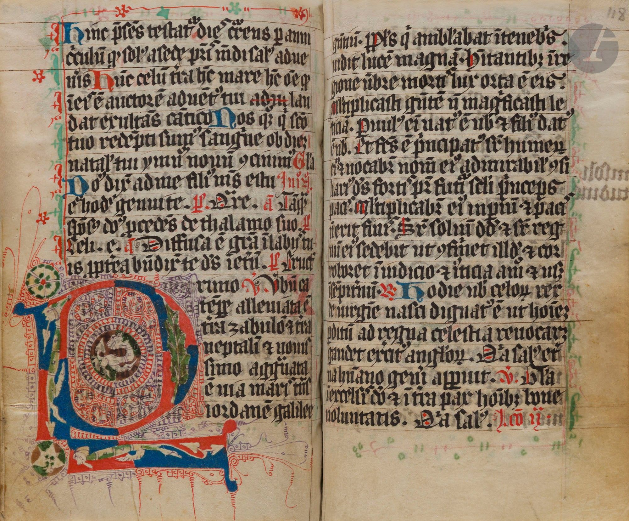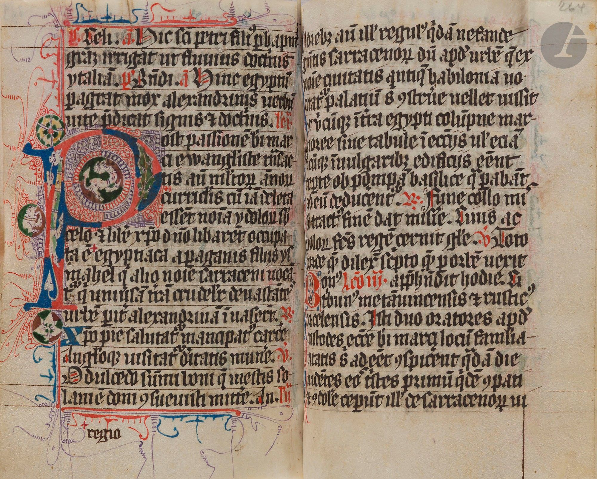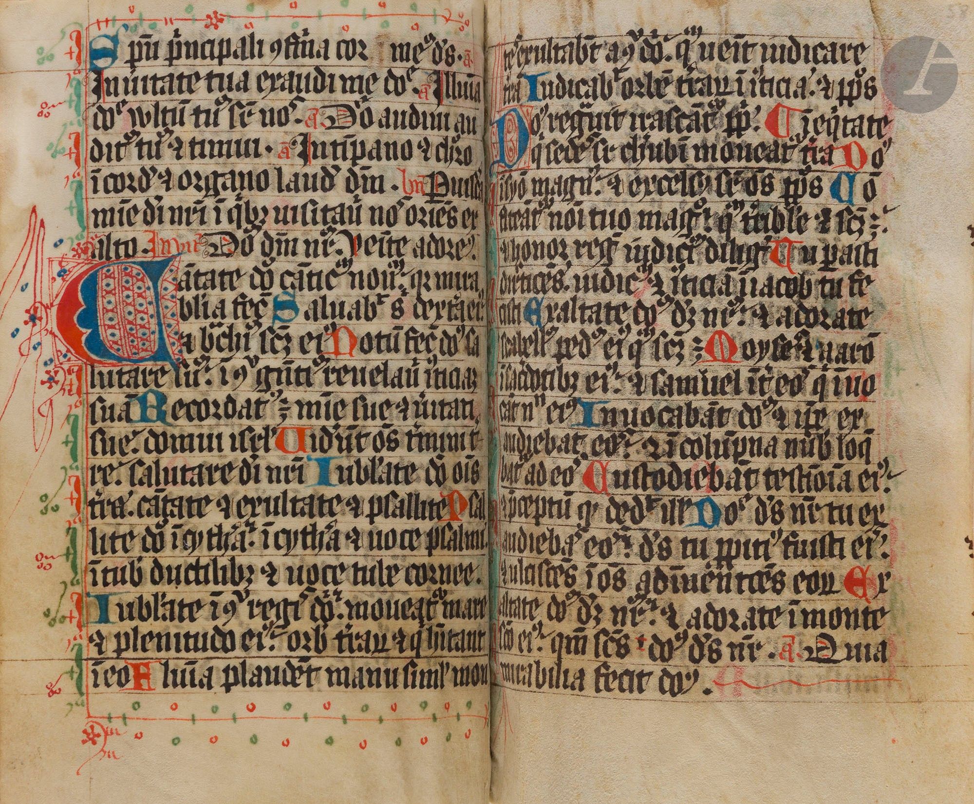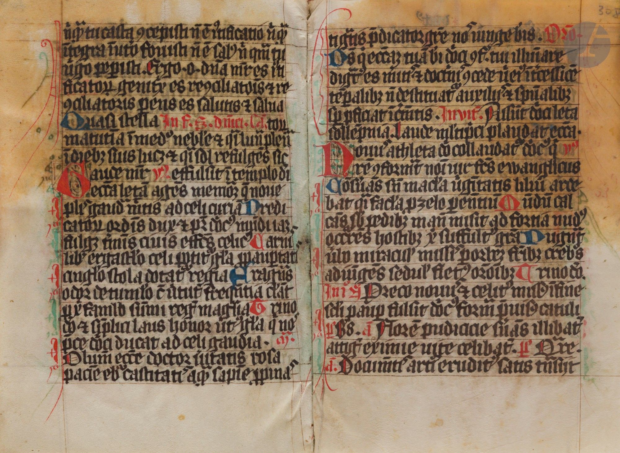 314 ff, missing at the beginning and end of the manuscript, text copied on a single column, ruled in brown ink (justification: 63 x 103 mm), liturgical Gothic script in dark brown ink, a few advertisements (e.g. ff. 121v, 133v, 145v, 205v, 255v), headings in red, numerous small initials painted in red and blue, larger initials two lines high in red or blue with watermarked decoration in red, green or blue, usually with ascending and descending "bands of I", very large initials 3 to 7 lines high marking the main divisions of the text (ff. 4v, 15, 25, 34v, 46v, 57v, 70, 117v, 138, 144v, 262, 263v) with puzzle decoration in red and blue, with grotesque motifs, vegetal motifs enhanced with green and yellow, decoration of filigree motifs in mauve and red ink, sometimes with grotesques.
