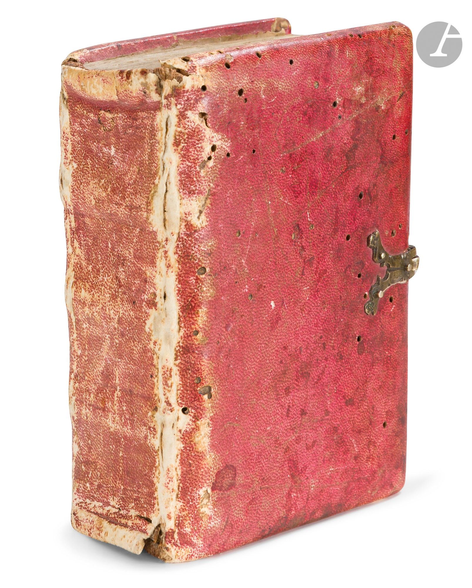 Contemporary binding, wooden boards covered with pink-tinted sow skin, spine with 3 exposed nerves, leather fastening and brass clasp, discolouration of the leather on the spine and the joins (a few wormholes on the boards, a few stains on the boards, joins a little split but boards well attached, a few pieces of leather missing from the tail of the spine). Ink discharges on the upper flyleaf (no counter-guards).