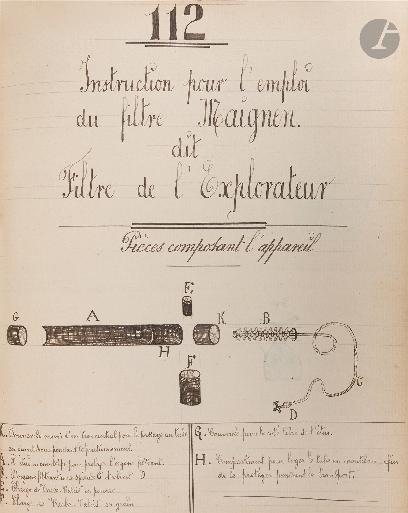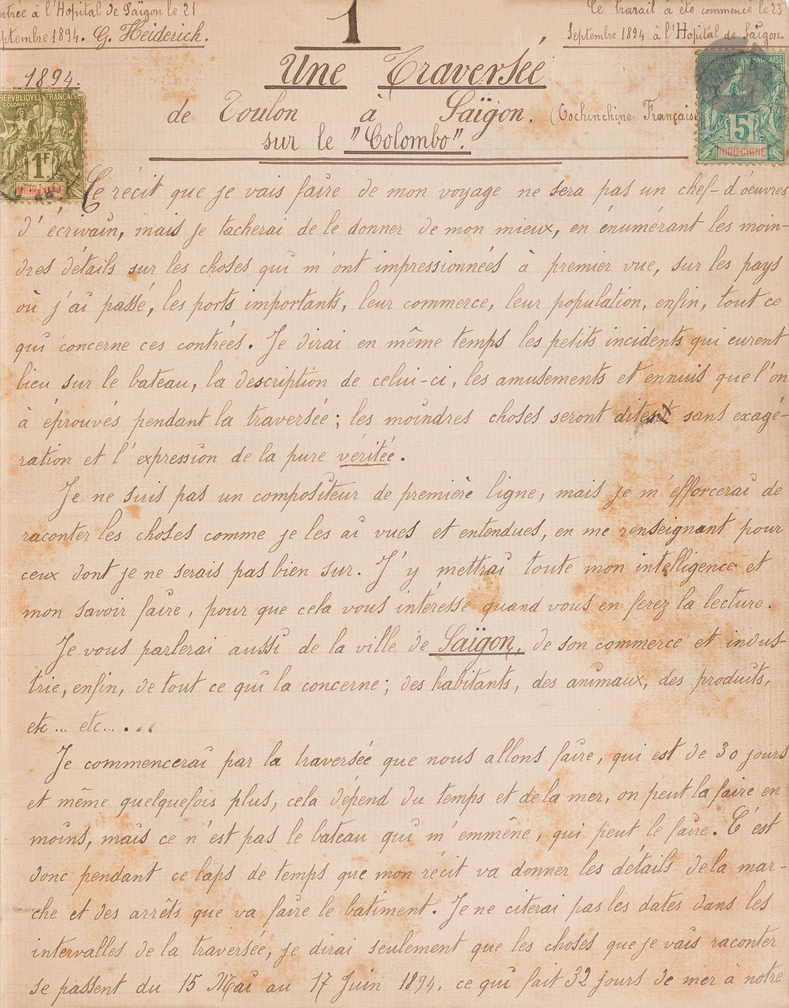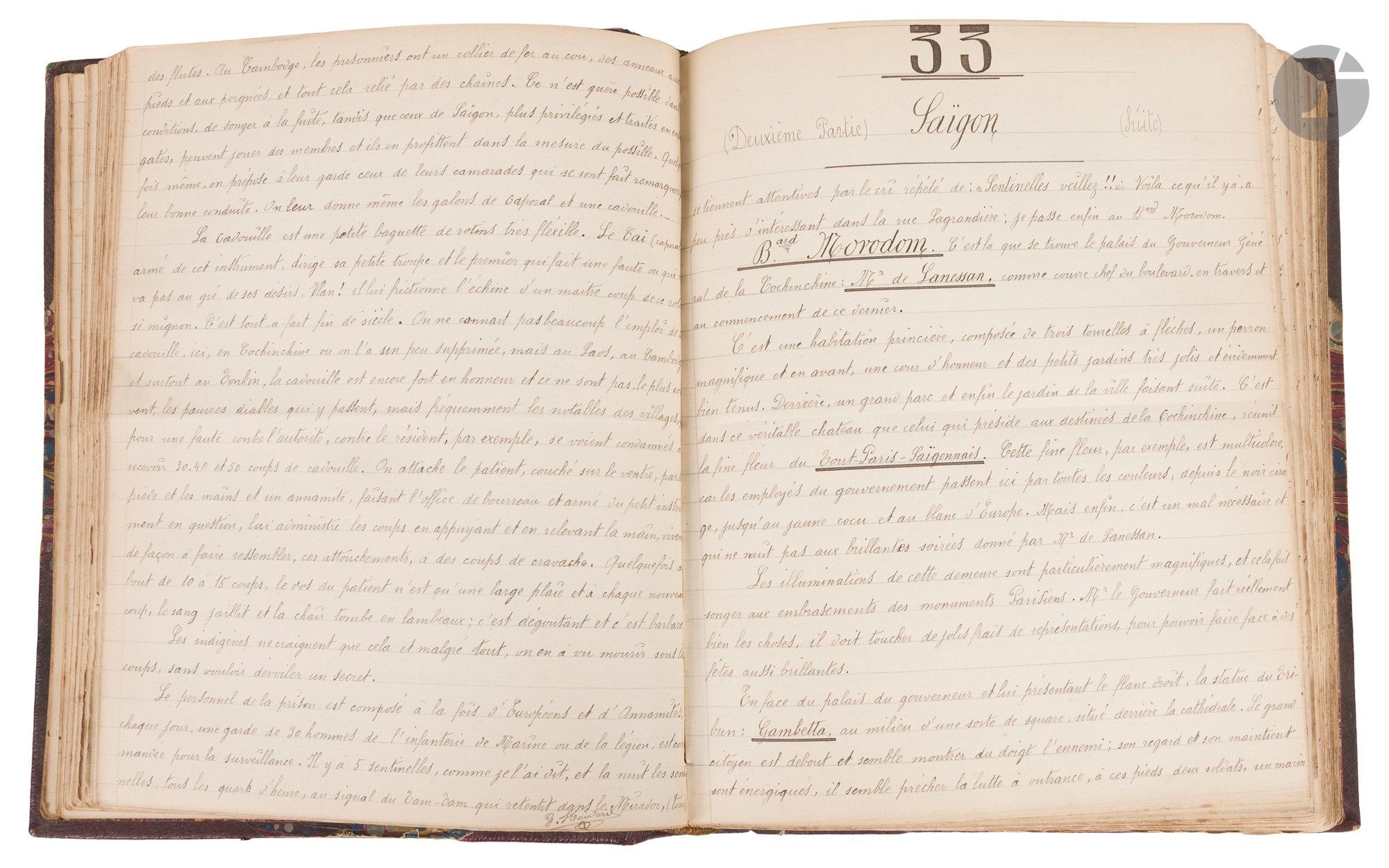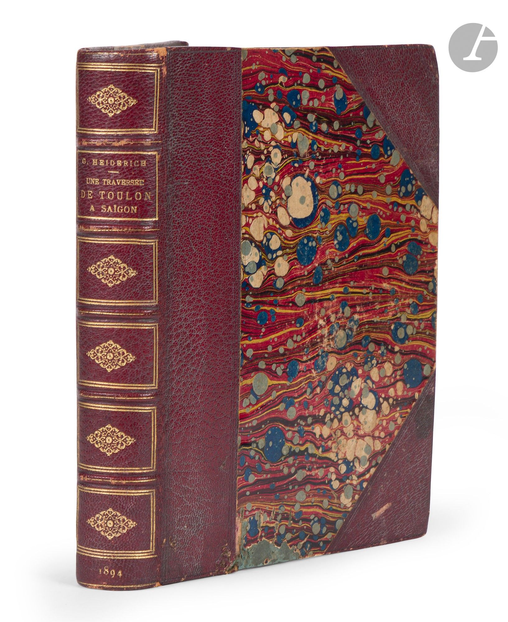 INDOCHINA - HEIDERICH (G.). Autograph manuscript signed in several places. 1894-1895. Saigon, 1894-1895. - Manuscript in-4, 210 x 170 : 456 pp. Garnet half-chagrin with corners, cold filets, spine ribbed and decorated, gilt head, untrimmed (contemporary binding). Very important and interesting unpublished autograph manuscript, containing the memories of Indochina of G. Heiderich, a marine infantryman at the end of the 19th century. Sent to serve in the Orient in May 1894, Private Heiderich arrived in Saigon the following month where, having fallen ill in September, he was admitted to hospital. He remained in hospital until January 1895 and took advantage of this period of enforced inactivity to write the present text, intended for friends and family. It is a composite work: the first two parts are based on direct observation, one in the form of a narrative and the other in the form of a descriptive table, while the third part is a compilation based on various readings, mainly in Le Royaume de Cambodge by Jean Moura (1883) and in La Cochinchine religieuse by Louis Louvet (1885). The work is divided into three distinct parts: - A crossing from Toulon to Saigon on the "Colombo" (chapters 1-28), begun on 21 September 1894: A detailed account of his 32-day voyage, punctuated by anecdotes about his comrades and evocative descriptions (such as that of Riou Island in the Straits of Malacca). He also recalls his discovery of exotic flavours (bananas, coconuts) and his impressions of the ports of call (Oran, Port-Saïd, Obock, Singapore). - Saigon, capital of French Cochinchina" (chapters 29-35), begun on 6 December 1894: Methodical description of the city: the port, the arsenal, the main streets, the hospital, the prison, the Governor General's palace, and even the brothels on rue Borèse. He slips in anecdotes about the local fauna and monetary customs, and mentions having seen rickshaws at the 1889 Universal Exhibition. - Cochinchina and Cambodia. Tonkin. Siam. Annam" (chapters 36-101). Largest part begun on 7 December 1894 and completed on 11 January 1895: Documentary compilation on the peoples (Annamites, Khmers, Malays, Chams, etc.), agricultural crops (trom, kong, pheu-chuc), fauna (elephants, tigers, monkeys), customs (costumes, tattoos, opium, marriages, religions), colonial administration, and history. The appendices (chapters 102-112) include texts of colonial treaties, information on the Maignen filter (for sterilising water, with 2 original drawings), and onomastic and historical questions. Although marked by the vibrant nationalism and racial prejudices typical of his time, Heiderich condemned torture (such as beatings with the "cadouille", a rattan stick) and expressed an acute awareness of colonial injustices, evoking "their violated soil and their lost freedom". His personal experience of the loss of Alsace-Lorraine undoubtedly awakened his sensitivity to the condition of colonised peoples. In short, this is both a personal and documentary account, a blend of ethnographic curiosity, travelogue and critical reflection on colonisation, tinged with an ambivalence that reveals his era. Two stamps from the period are pasted on the first page. Opposite this first page is a later autograph note to the manuscript: "En souvenir du service que mon (sic) rendu MMme Garnier et fils. G. Heiderich. In the centre of the second lining must have been a coin or medal, which has now disappeared. Rubbing from use. Some foxing.