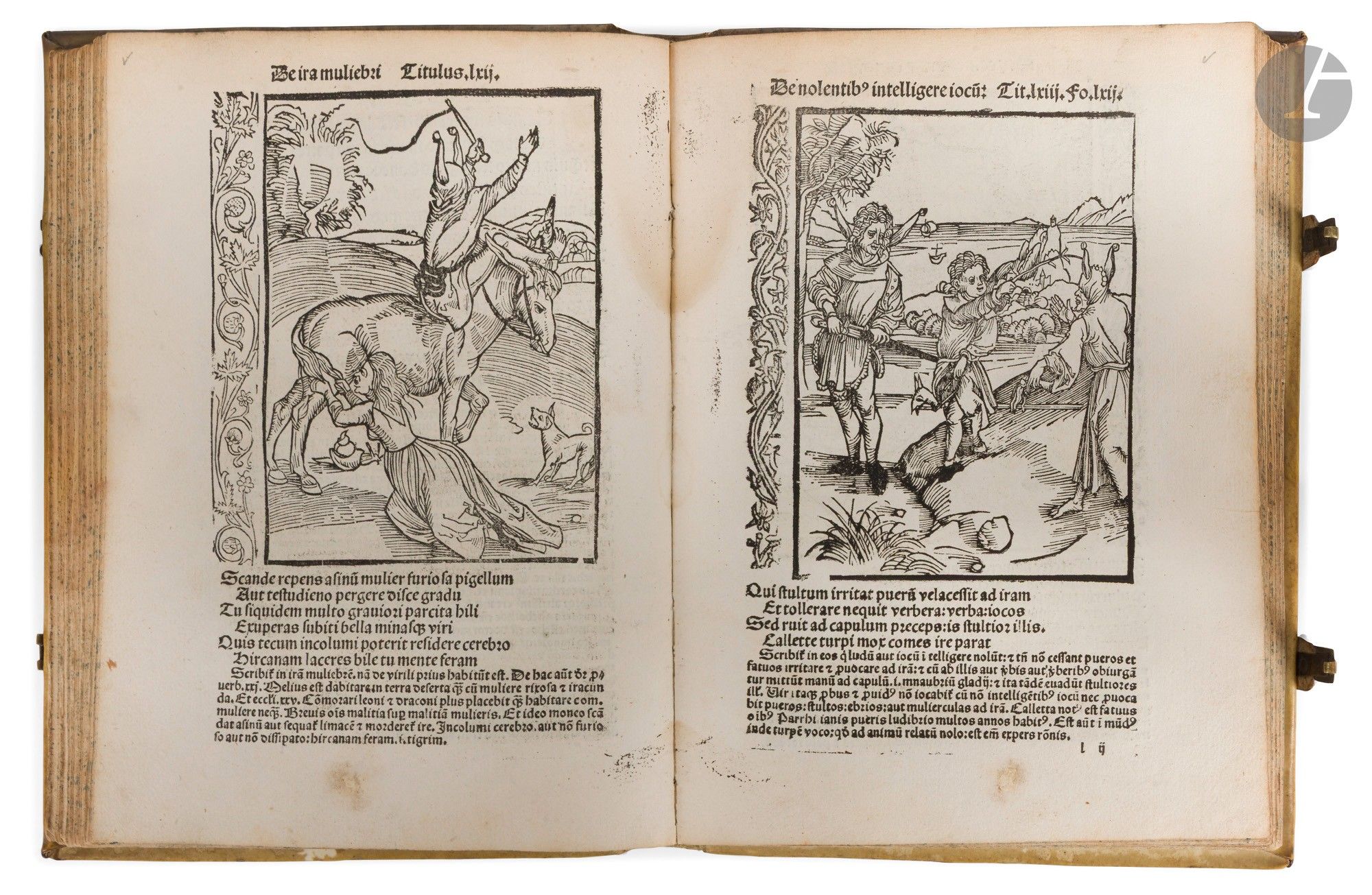 Early editions of this text were characterised by their abundant illustrations. This edition features 115 woodcuts, including one on the title, one on a full page, and the others on three-quarter pages, bordered by a decorative frieze. These illustrations come from the original German edition published in Basel in 1494, and more than half are attributed to the famous engraver Albrecht Dürer. The title is printed in red and black, and the printer's mark appears in the colophon.