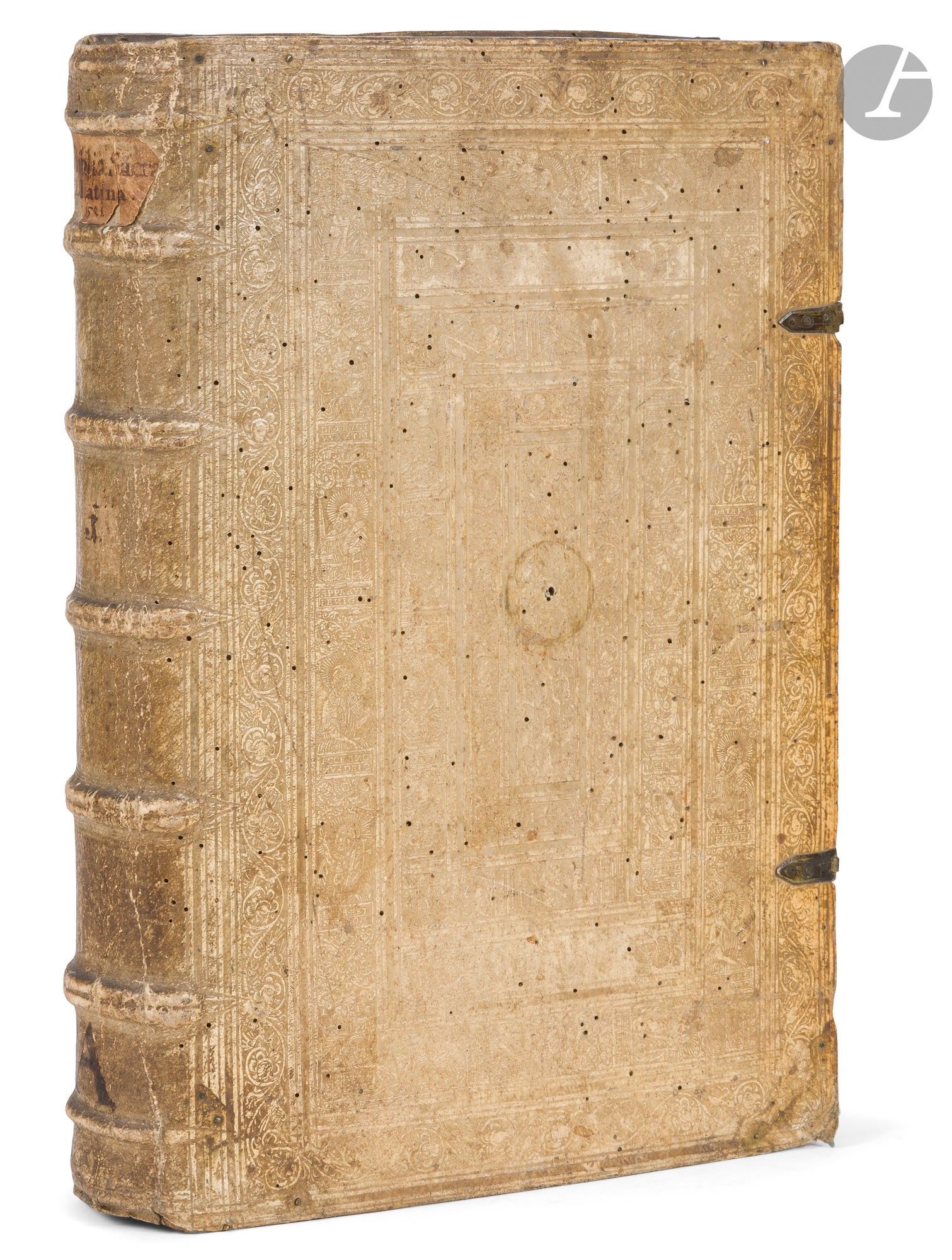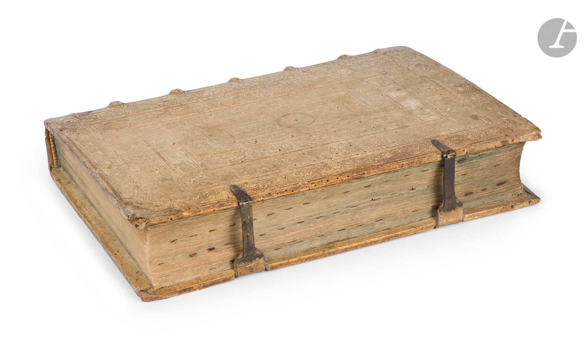 This very handsome copy is bound in contemporary saddle-skin, cold-stamped on wooden boards. It has retained its two original chased brass clasps, but the umbilicus and bouillons (corner irons) are missing. The boards are decorated with friezes of foliage and portraits, notably of biblical figures, in frames. The linings contain several notes and old bookplates.