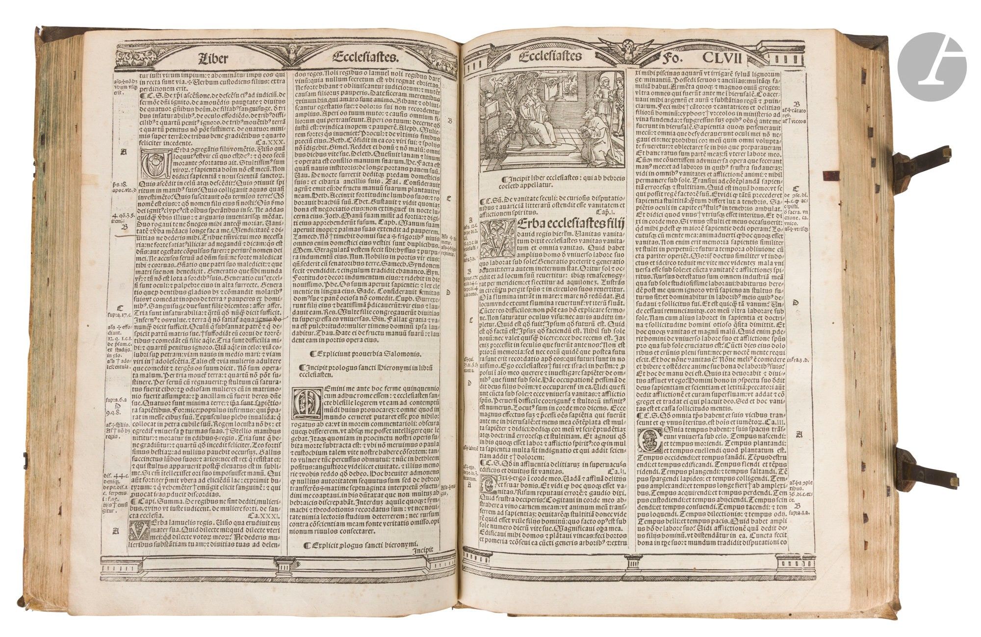 Superb sixteenth-century illustrated Latin Bible, printed in Gothic letters in Lyon by Jacques Sacon for Anton Korberger of Nuremberg. It faithfully follows, page by page, the edition published by the latter in 1519.