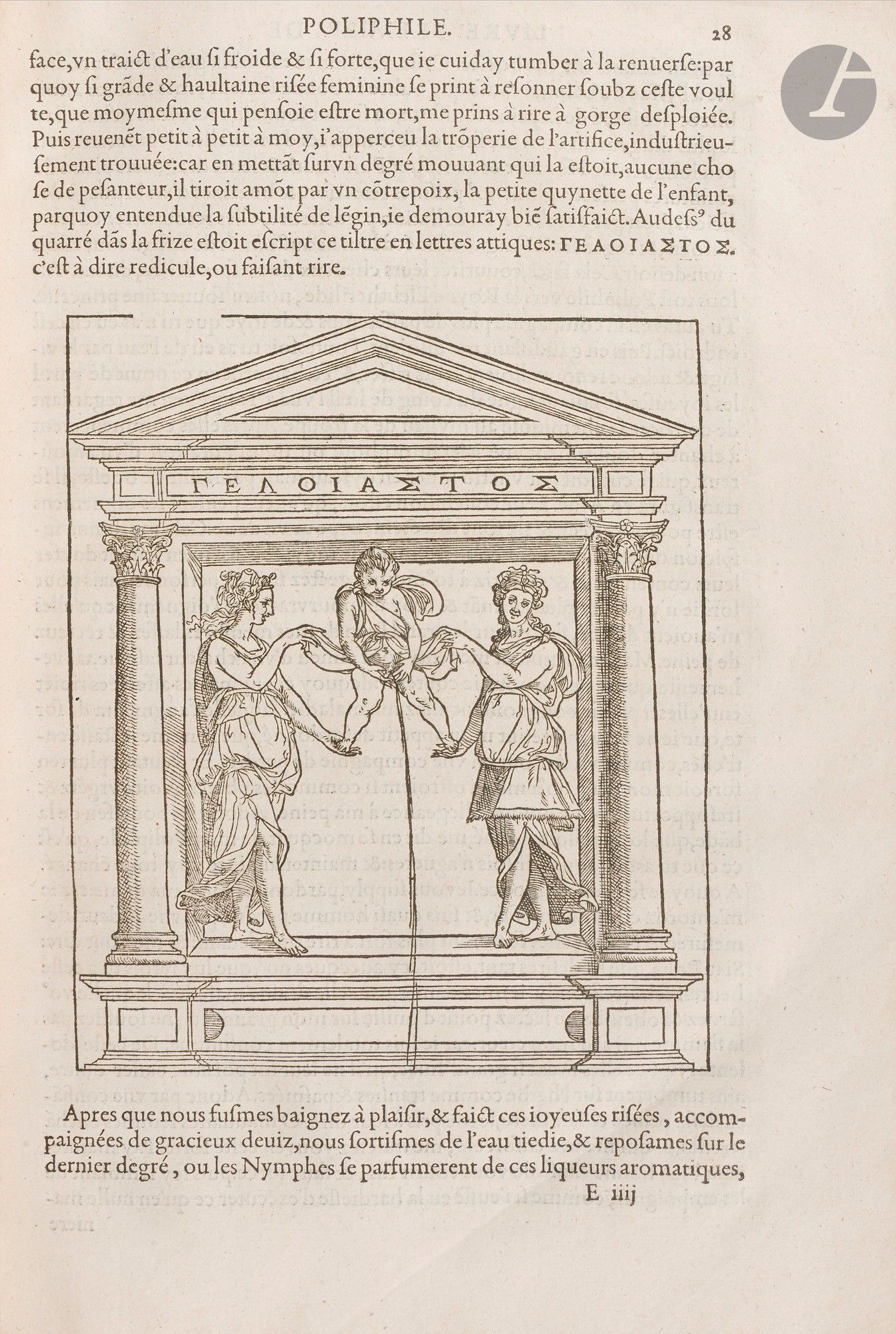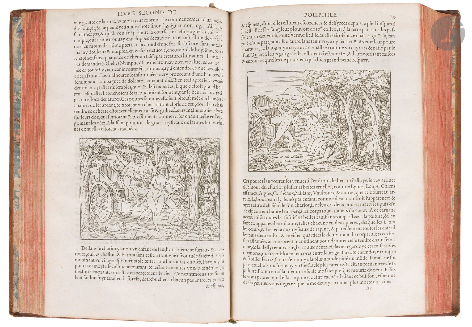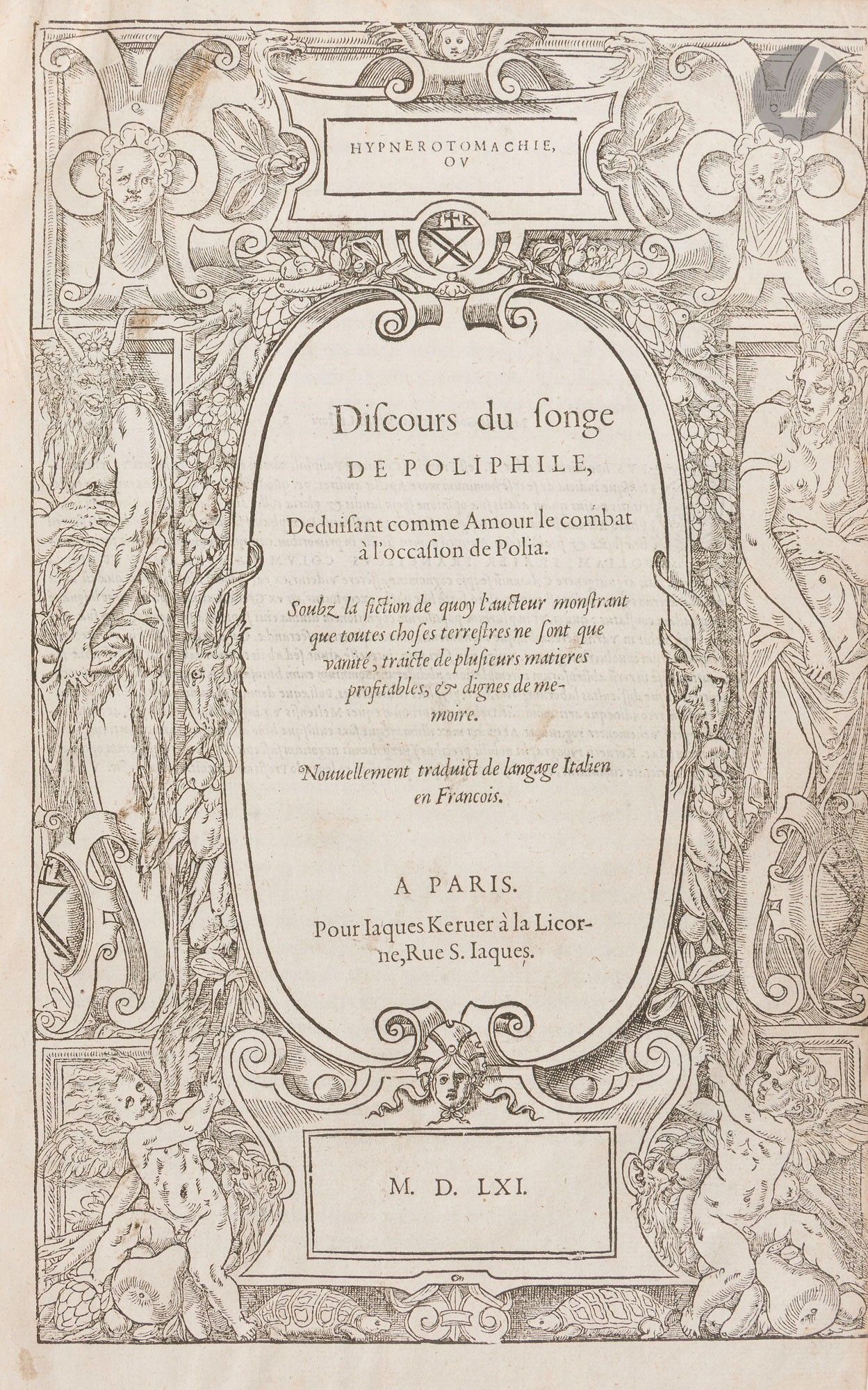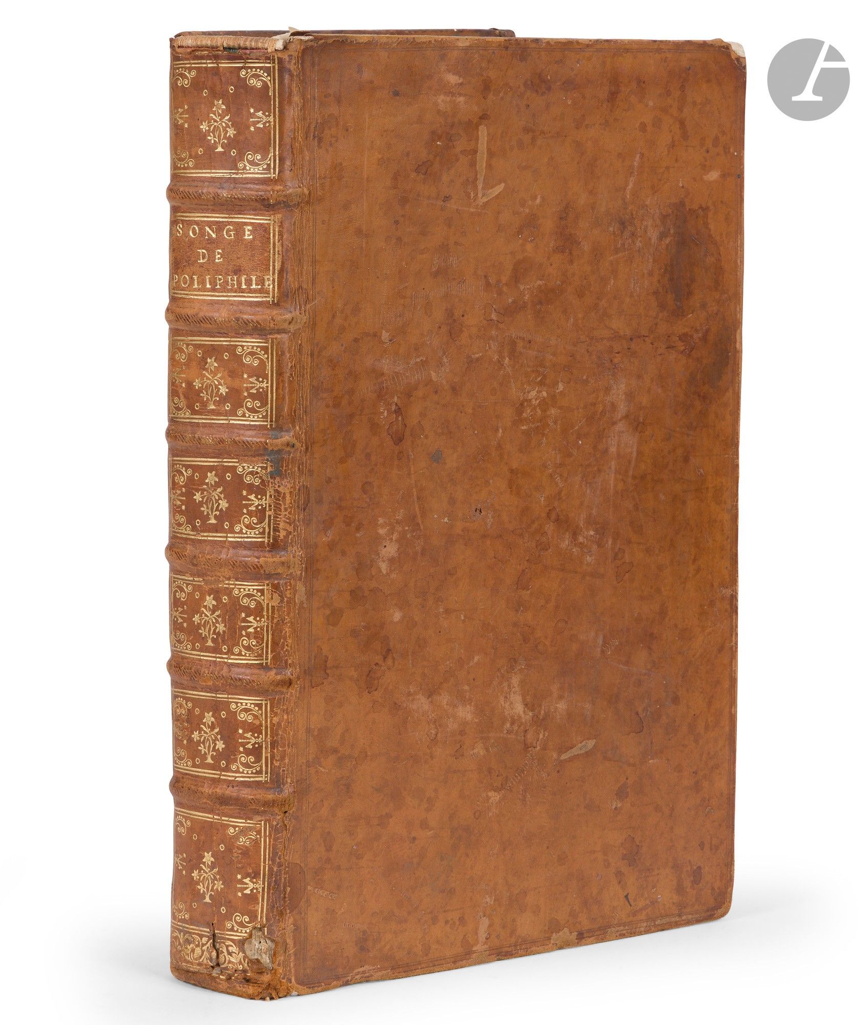 COLONNA (Francesco). Hypnerotomachie, ou Discours du songe de Poliphile, Deduisant comme Amour le combat à l'occasion de Polia. Soubz la fiction de quoy l'aucteur monstrant que toutes choses terrestres ne sont que vanité, tracte de plusieurs matieres profitables, & dignes de memoire. Paris: Jacques Kerver, 1561. - In-folio, 312 x 205 : (6 ff.), 157 ff., (1 f.). Tan calf, spine ribbed and decorated, red edges (18th century binding). Brunet, IV, 779. - D. Cordellier, Luca Penni, un disciple de Raphaël à Fontainebleau, Paris, 2012, pp. 111-113. Third edition of the French translation by Jean Martin (15..-1553?), following those of 1546 and 1554. Francesco Colonna (1433-1527), a Venetian Dominican monk, is traditionally considered to be the author of The Dream of Poliphilo (Hypnerotomachia Poliphili), which he wrote in 1467. A novel of fascinating singularity, both in its conception and in its language (a mixture of Latin, Italian and Greek), it recounts Poliphilo's dreamlike, initiatory journey to the island of Love, Cythera, combining symbolism, architecture, mythology and allegory. First printed by Aldus in 1499, it is considered to be one of the "most beautiful books in the world", with an abundance of extremely refined and spellbinding illustrations. It exerted a major influence on literature and the arts in the 16th and 17th centuries, inspiring generations of artists and writers. The Kerver edition (1546), translated and adapted by Jean Martin, simplified the complex language of the original: the interminable enumerations were summarised, the labyrinthine descriptions clarified, and the Greek and Latin phrases translated (sometimes with deliberate misunderstandings to soften certain passages). Despite these adaptations, the mysterious acrostic in the opening chapters has been preserved: "Poliam frater Franciscus Columna peramavit" ("Brother Francesco Colonna loved Polia intensely"). This 1561 edition is very close to the second of 1554: "The title page mentions Kerver's new address, which has been changed from the sign 'Deux colonnes' to 'La Licorne'. Jean Martin's text has been recomposed without modification. New lettering appears only in the preliminaries, and the publisher has introduced a band at the head of each chapter. The Greek texts, printed in larger type, are more legible. The engravings are the same: the one at the bottom of folio 22 has been reversed" (website architectura.univ-tours.fr/livres-notice/ensba_1322b/). It is decorated with the famous illustrations from the first French edition (1546), including the superb title frame recently attributed by Dominique Cordellier to Luca Penni, and 181 woodcuts, 13 of which are full-page. Although inspired by the princeps edition of 1499, these woodcuts, attributed to Jean Goujon or Jean Cousin, are original creations that bear witness to the art and genius of the French Renaissance. Only one engraving has been significantly altered: that on folio B6 verso, depicting an antique doorway with columns. In the 1546 edition, this illustration was not very accurate - the capitals were missing, the drawing was shapeless, and comments and figures cluttered the composition. In the revised version, the columns now have capitals, inspired by the Doric order, and the figures and comments have disappeared. This change reveals a greater attention to architectural rigour, reflecting a more pronounced aesthetic and technical concern. The last leaf contains the beautiful Kerver mark. A copy in an eighteenth-century binding with several hundred blank leaves following the text, the first of which contains handwritten bibliographical notes. It came from the library of Edward Lee Childe (1838-1911), nephew of the Southern general Robert Lee, friend of Prosper Mérimée and husband of the woman of letters Blanche de Triqueti (1837-1886). Lacks the head cover, worm work to the last box, some wear rubbing, dull corners, ink stains on the second board. Title frame slightly cut, small tears at the top of the same leaf with damage to the engraving. A few small damp spots, not serious. Apart from that, the interior is in very good condition. Ink reading marks in some margins. Provenance: Edward Lee Childe, with bookplate.
