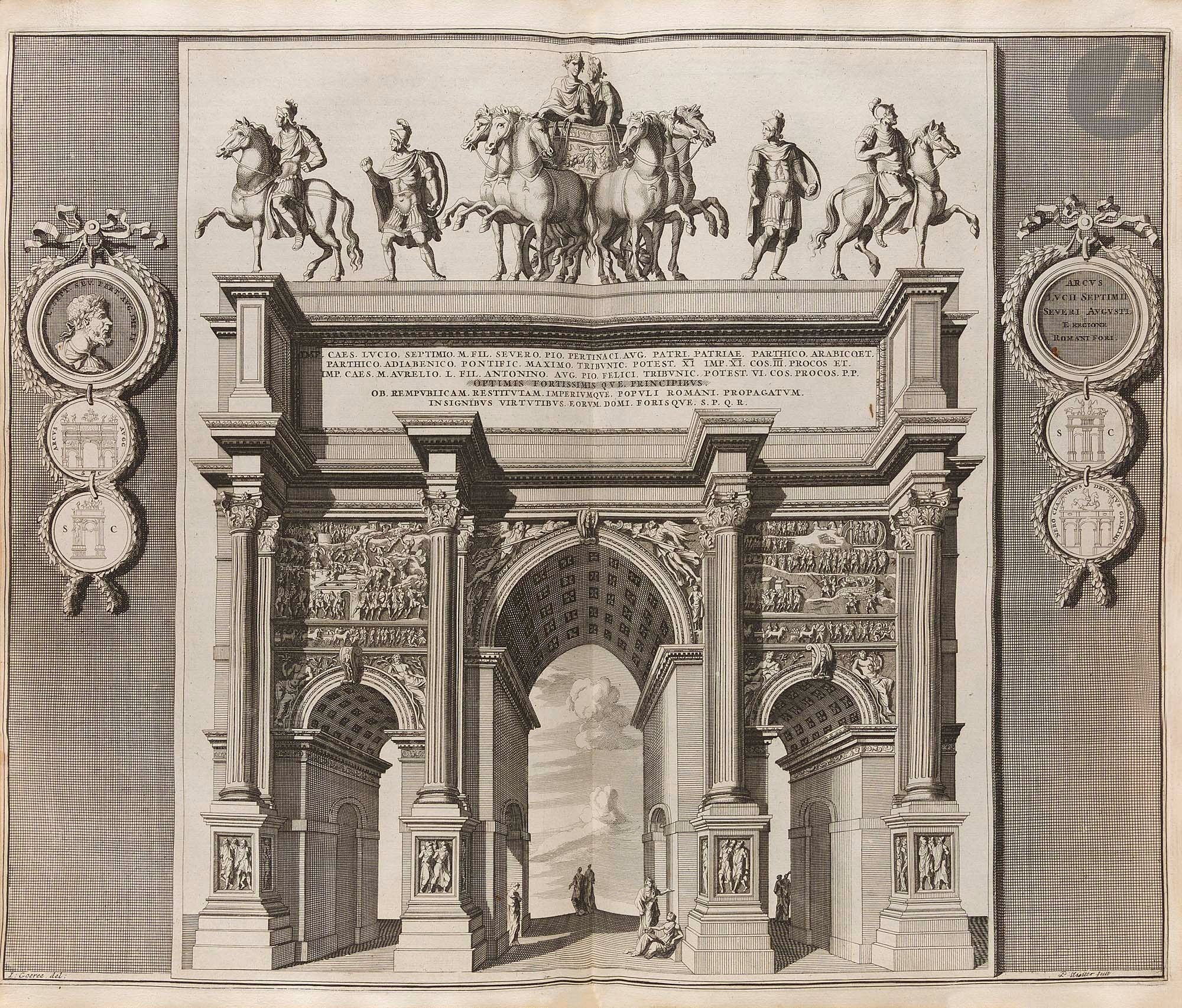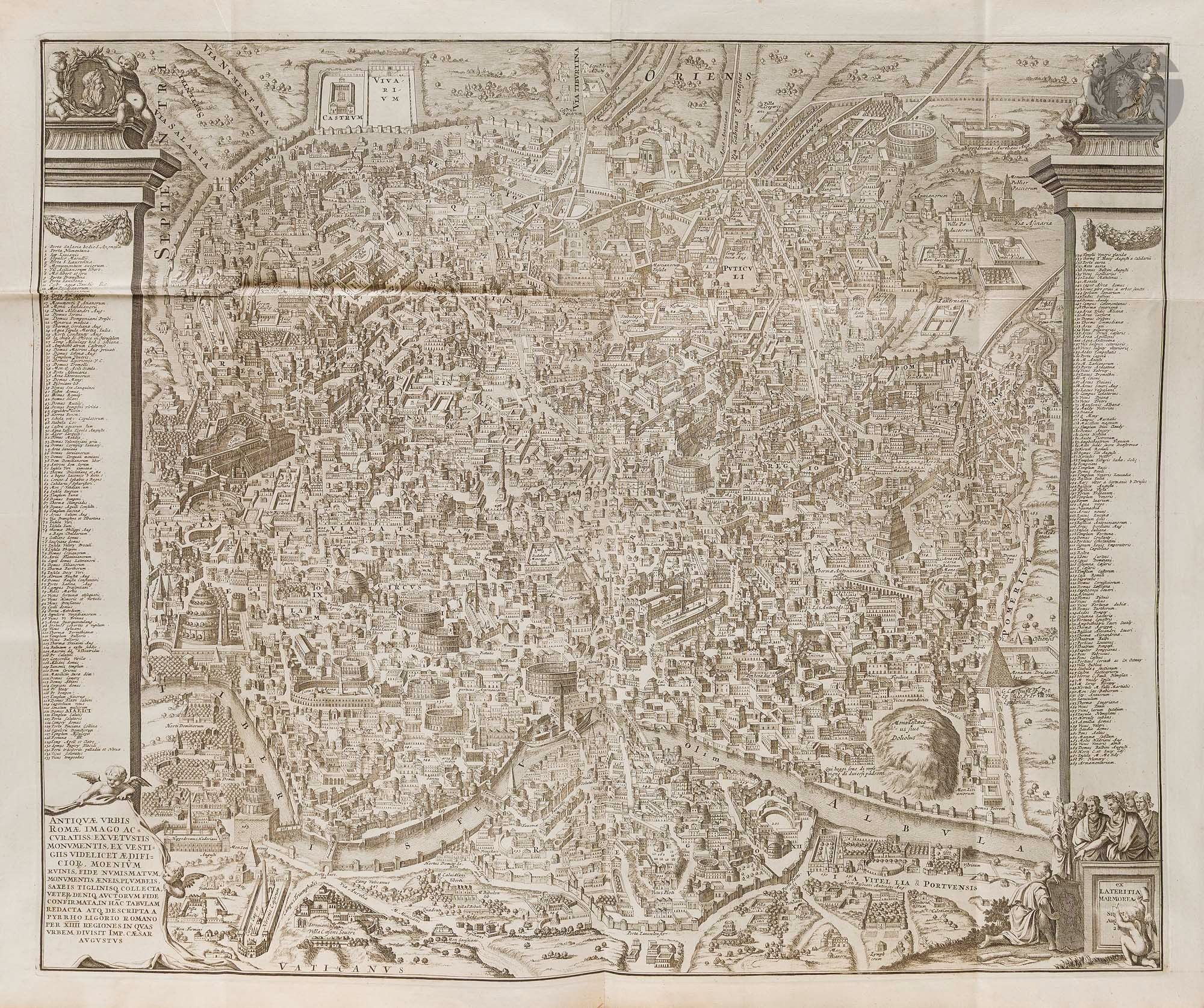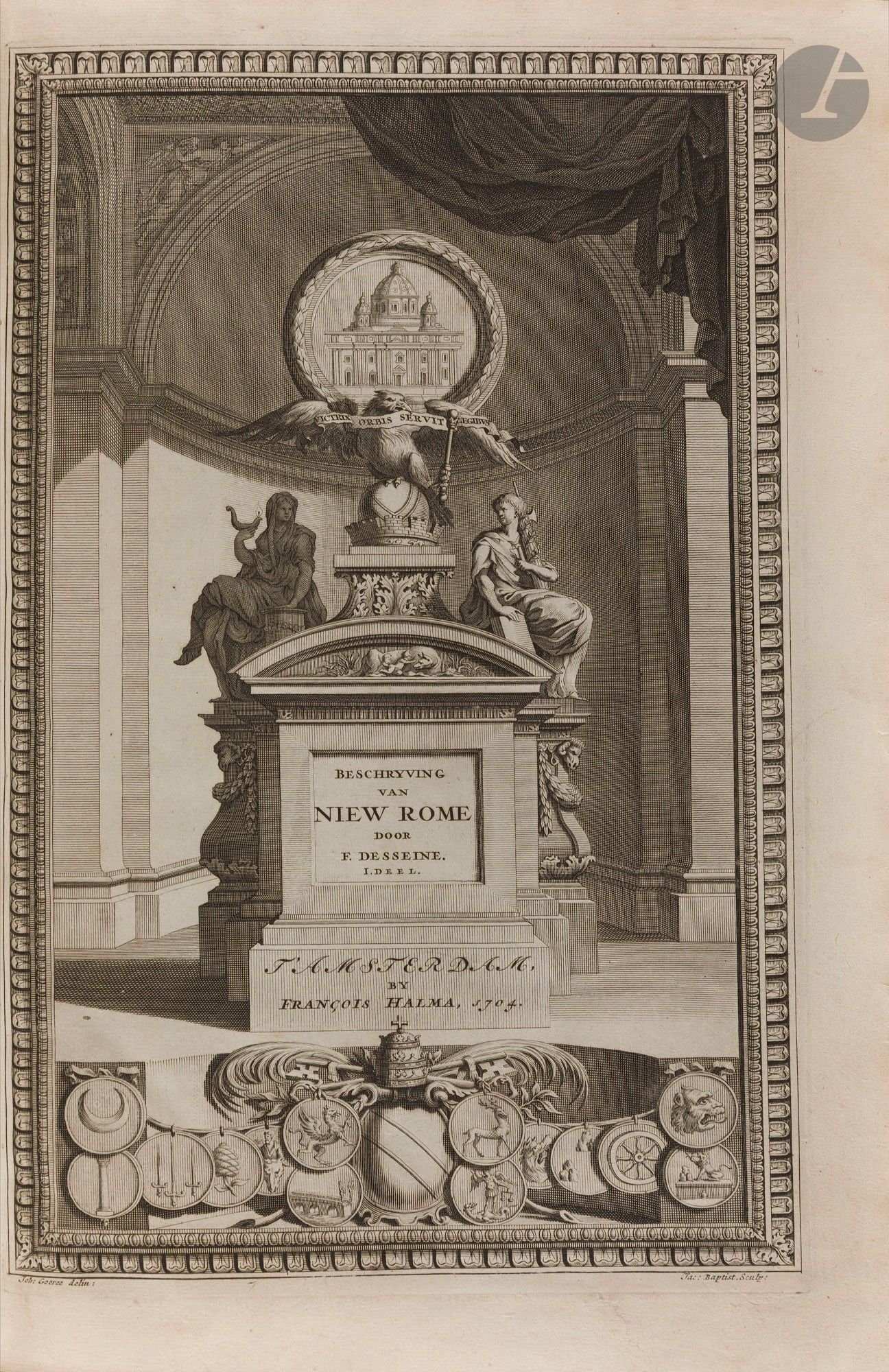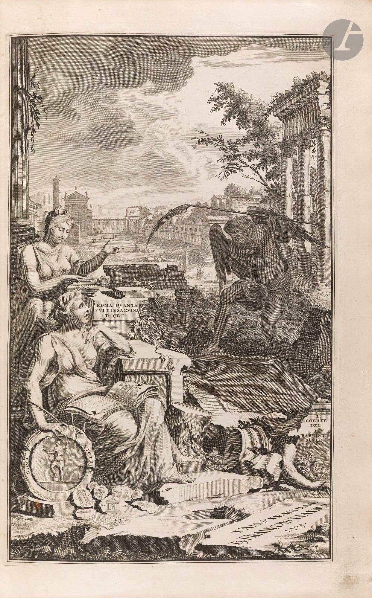 DESEINE (François). Beschryving van oud en niew Rome. Amsterdam: François Halma, 1704. - 2 folio volumes, 393 x 240: frontispiece, (12 ff.), 22 pp, pp. *22-*23, pp. 23-118, (2 ff.), pp. 121-160, 5 maps, 1 plan, 70 plates; frontispiece, (8 ff.), pp. 161-360, (2 ff.), pp. 363-479, (41 ff.), 1 map, 1 plan, 25 plates. Stiff white parchment, framed with cold fillets and iron with a cold interlacing motif in the centre of the boards, spine ribbed (period binding). First edition in Low German and Dutch, dedicated to Nicolaes Witsen (1641-1717), burgomaster of Amsterdam. This is a translation of the French work by the man of letters and geographer François-Jacques Deseine (....-1715), published in 1690 under the title Description de la Ville de Rome. The work is divided into three parts and traces the history of Rome from its foundation to the reigns of the emperors and popes, combining historical, archaeological and literary approaches. As the title indicates, it deals with "its quarters, temples, senates, churches, palaces and other remarkable buildings, as well as the ancient and current states, secular and ecclesiastical, including their customs and ceremonies". The section on ancient Rome is followed by a text by the art historian Giovanni Pietro Bellori (1613-1696) on the paintings in the Nasoni tomb, discovered in 1674 in the Via Flamina area. This edition is highly sought-after, as the publisher has chosen to enhance it with numerous beautiful copper-engraved illustrations. These consist of two frontispieces, 3 title vignettes, 3 lettrines, 3 headpieces, 22 compositions in the text, 2 plans, 6 maps and 95 plates, all engraved by Jan Goeree (1670-1731) and Livinus Cruyel (c. 1640-c. 1720) and by Pietro Sante Bartoli (1635-1700) for Bellori's text engravings. The fold-out map of the ancient city of Rome is remarkable. A good copy in contemporary binding. Some soiling and stains to bindings, although these appear to have been cleaned. Hinge of the first plates partly split. The inscriptions in ink on the spine are later than the binding. Tear without missing at the fold of the plate on page 300. The leaf appearing before page 121 has been misplaced, it should appear before leaf ***1 in the second volume.