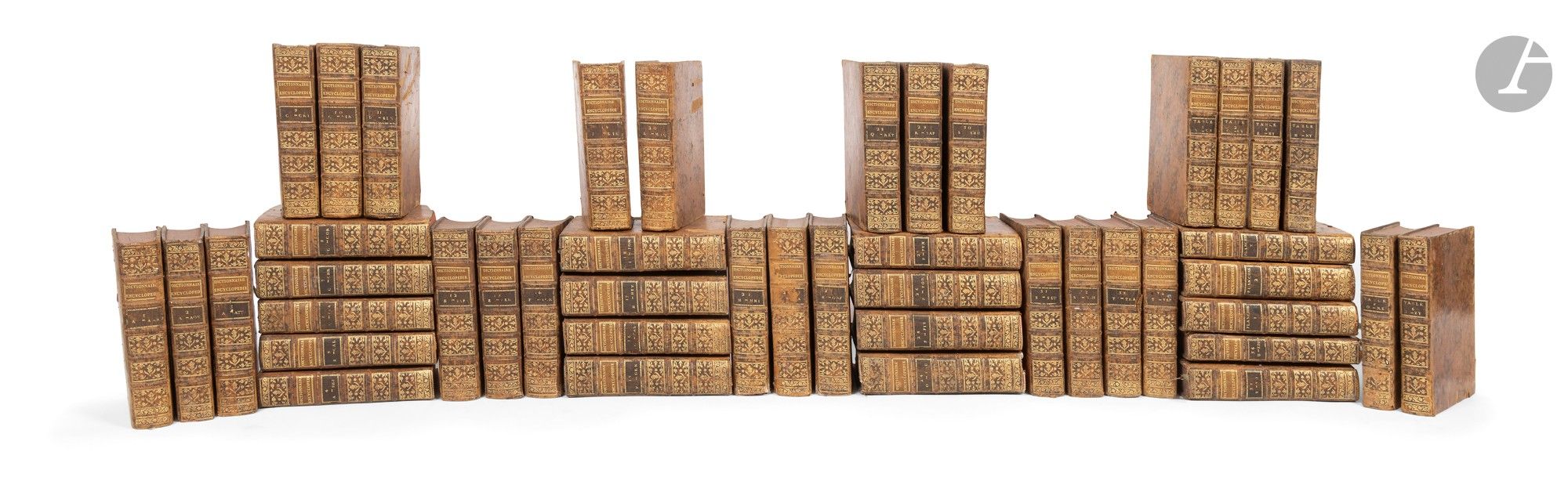 Geneva: Pellet, 1777-1779 [Volumes 1 to 6, 8, 10, 17, 18, 22, 25, 31 to 34, volumes 2 and 3 of the plates]; Geneva: Jean-Léonard Pellet; Neufchâtel: Société typographique, 1778-1779 [volumes 7, 9, 11 to 16, 19 to 21, 23, 24, 26 to 30, 35, 36]; Neufchâtel: Société typographique, 1779 [Volume 1 of plates]; Lyon: Amable Leroy, 1780-1781 [Table]. - 45 volumes in-4, marbled basane, spine ribbed and decorated, red edges (contemporary binding).