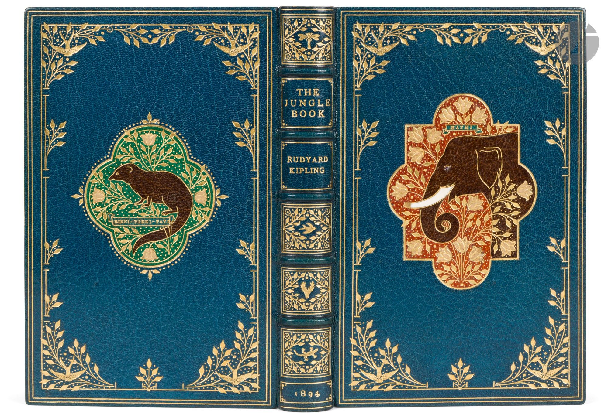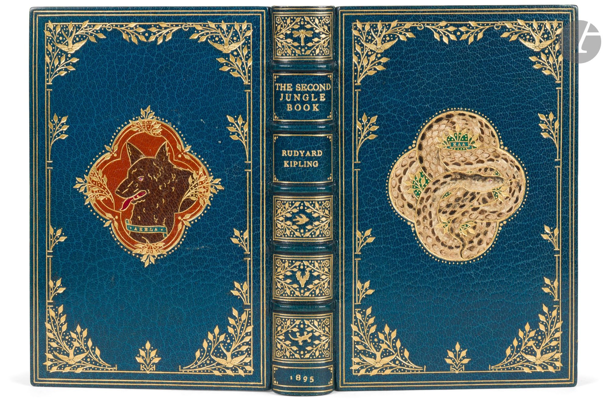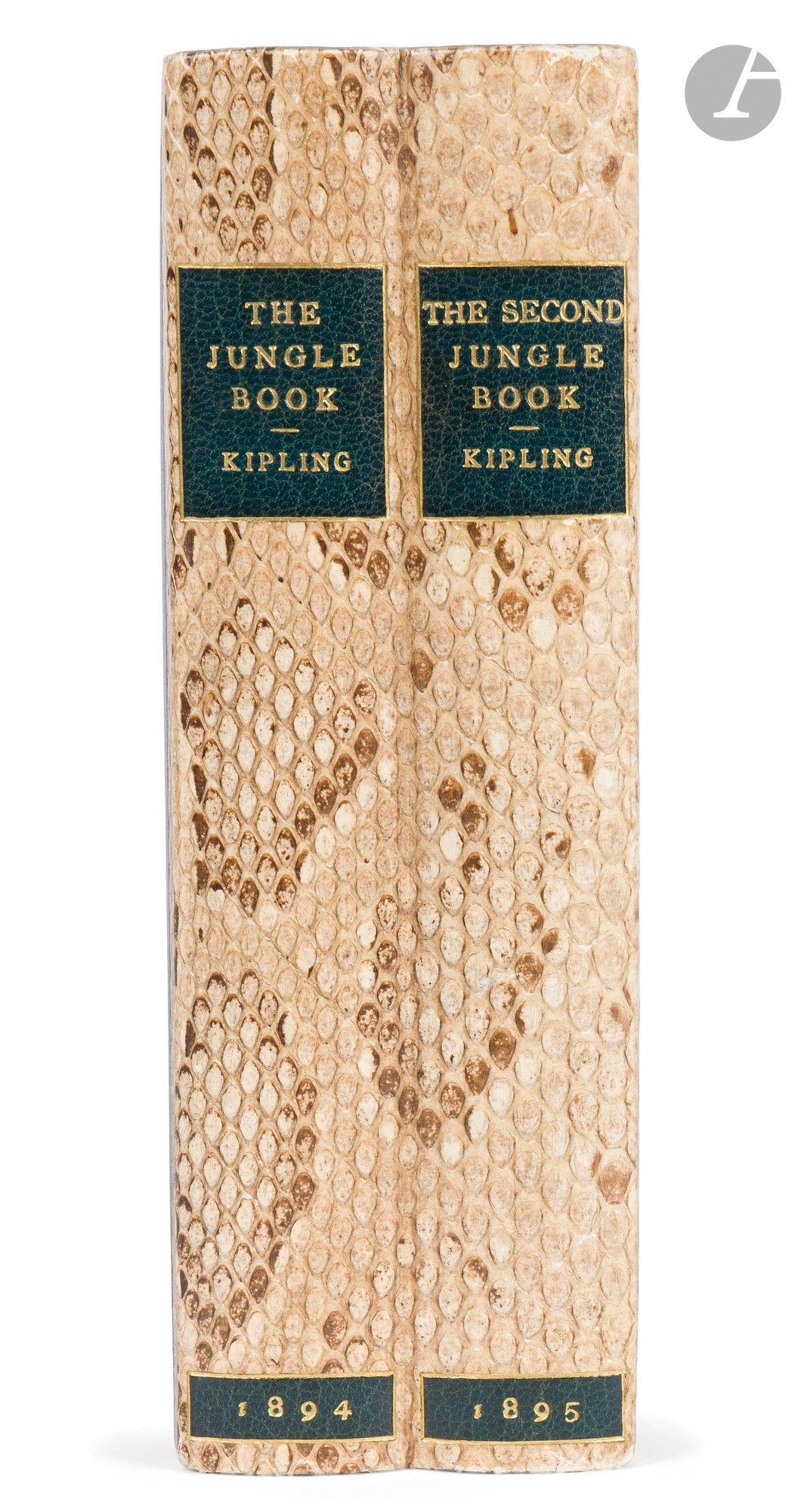 London, New York: Macmillan and co, 1894-1895. - 2 works in 2 volumes in-8, 183 x 120: (2 ff. first blank), vi pp., (1 f.), 212 pp. ; (4 ff. first blank), 238 pp., (1 f.). Blue morocco, triple gilt fillet framing the boards, with gilt leaf and bird motifs at the corners and edges, the centres decorated with a distinct mosaic composition, depicting on the first volume, the elephant Hathi on the first board, with a ruby set for the eye, in a rectangle with lobed edges, against a background of lotus flowers gilded and mosaicked in white morocco, and the mongoose Rikki-Tikki-Tavi on the second plate, in brown morocco, in a four-lobed frame against a green morocco background decorated with gilded and mosaicked flowers; and on the second volume, the snake Kaa on the first plate, with a ruby set for the eye, in real snakeskin, coiled to form a four-lobed motif, and the wolf Akela on the second plate, with a ruby set for the eye, in a four-lobed frame decorated with gilt leaves; spine decorated with gilt leaf and animal motifs, gilt fillets and roulette framing the inside, surrounding a phrase in gilt lettering, gilt swastika at the corners, snakeskin lining and endpapers, blue silk double endpapers, edges gilt and chiselled on the edges, boards and spine in percaline of the original cartonnage preserved, common snakeskin-backed slipcase (Sangoski and Sutcliffe).