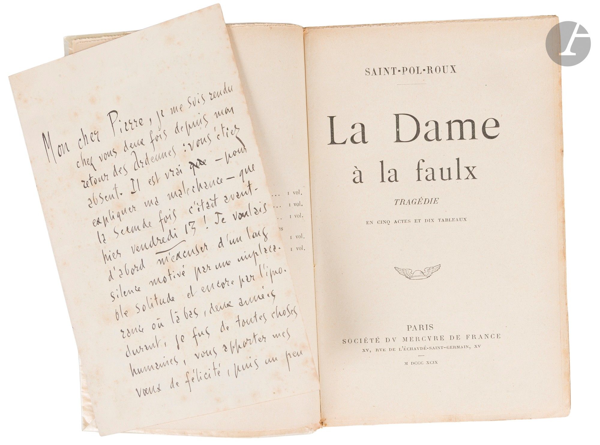 A copy of the current edition, enriched with a long autograph letter signed by Saint-Pol-Roux, 4 pages in-8, dated 15 November 1896. It is addressed to "Mon cher Pierre", to whom he is asking for financial help. He begins by talking about his play: "Perhaps you know that I am coming back with some battle works, perhaps you have read that one of them (this DAME À LA FAULX, the content of which you were one of the first to know) is pending at Sarah Bernhardt's doorstep". The author did indeed try to have his play performed by Sarah Bernhardt and Mounet-Sully. He continued: "If you really have faith in Saint-Pol-Roux, if you deign to suppose that a will predestined me to fight the 'Battle of Hernani' of Symbolism, give me a shoulder - which you would get back as soon as Gold and Laurel came to me [...] Remember that I tried everything to gain the independence necessary for my future works, and that, unable to conquer it, I had to flee to the Forest, to a life of meditation. Here I am, back in the land of misery, - well, you, to whom Fortune smiles, offer me your hand, the hand that saves... Help the poet, won't you also collaborate? And imagine for a moment that we are living in 1830 and that my name is Victor. It's a proud thing to write, but this last-ditch argument will undoubtedly help me in your heart of hearts.