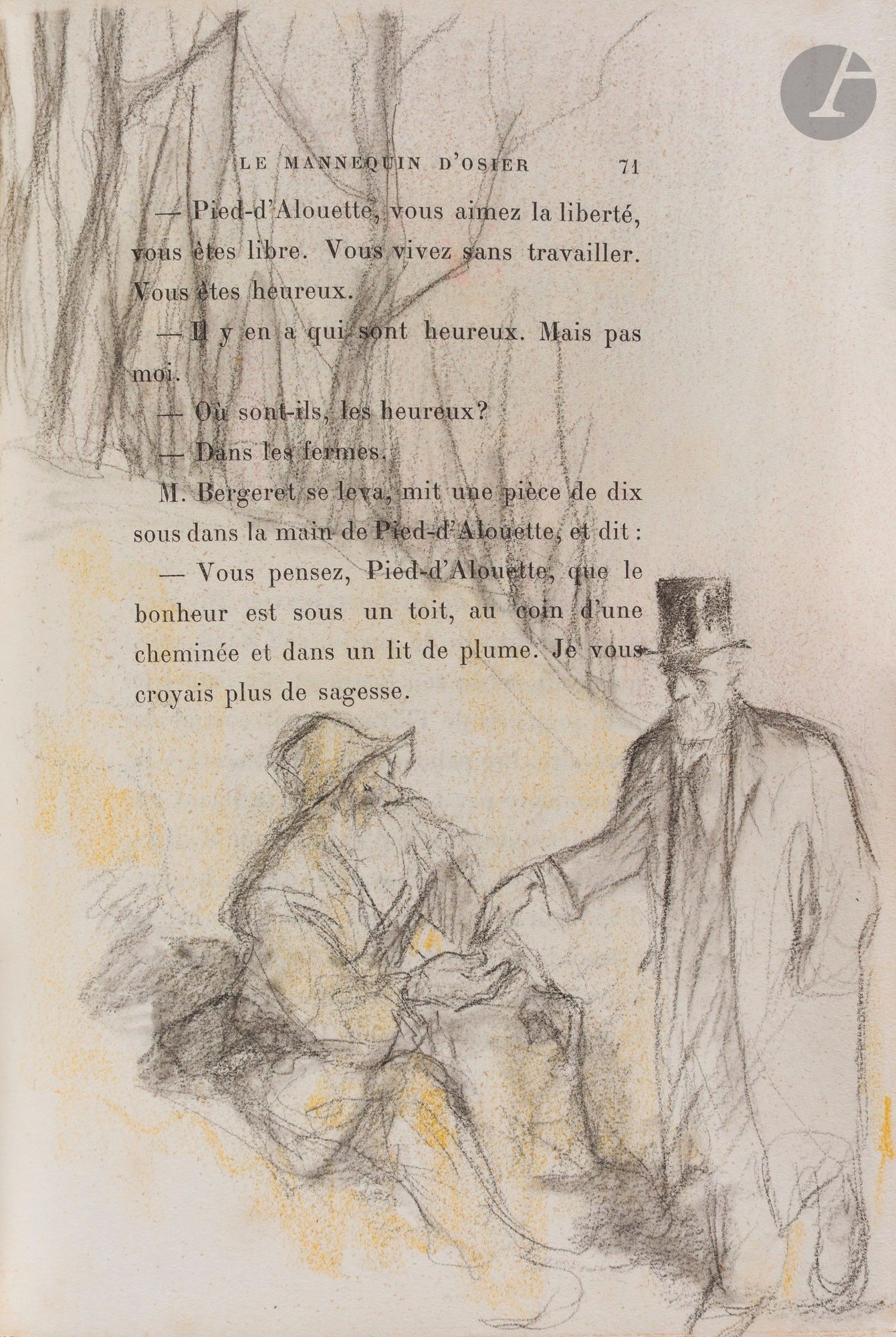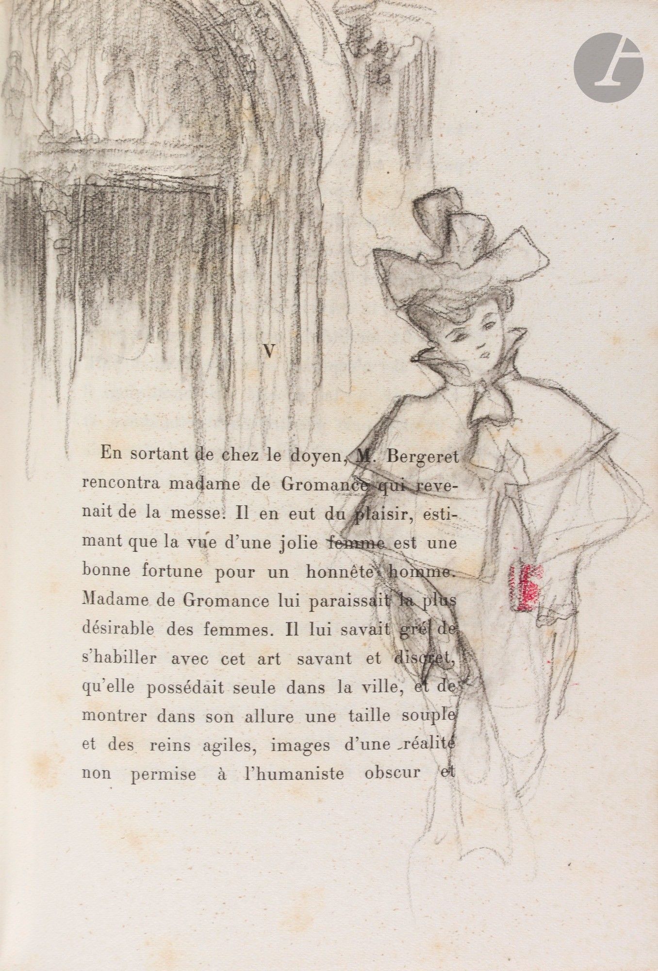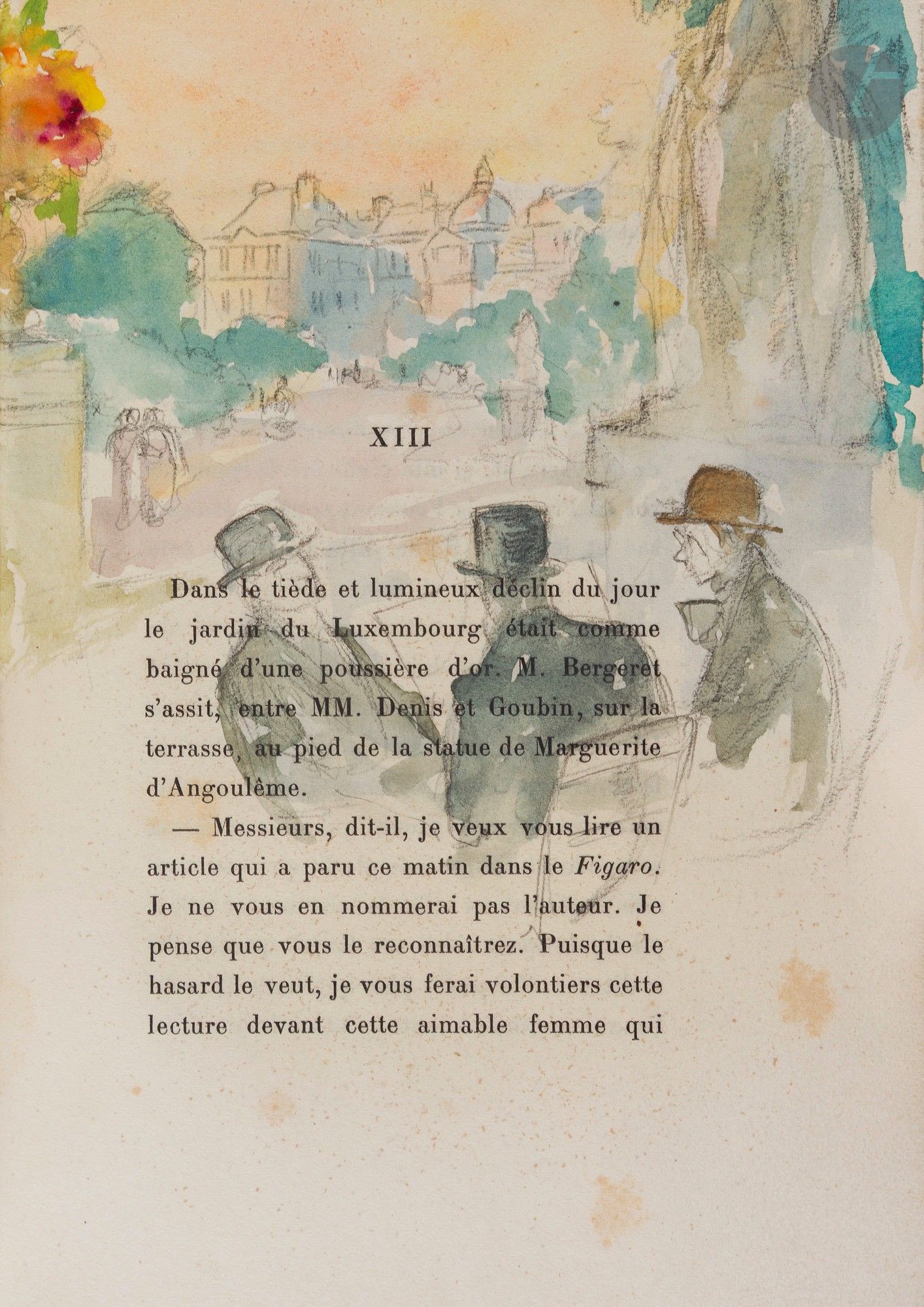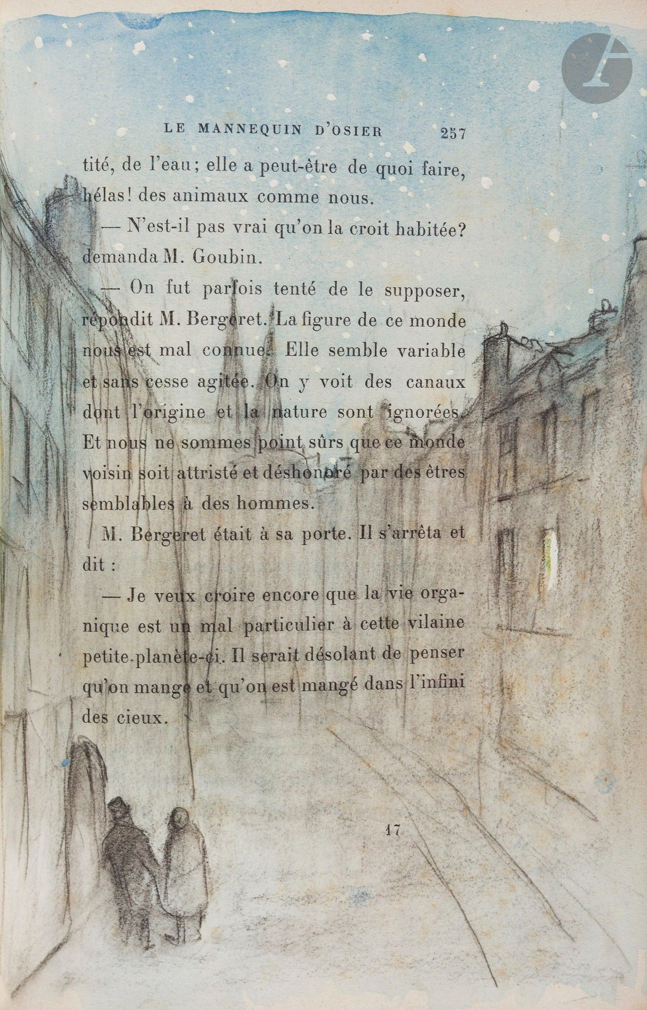 There are a total of 423 drawings in watercolour and coloured pencil, 143 in L'Orme du Mail (completed in January 1927), 105 in Le Mannequin d'osier, 83 in L'Anneau d'Améthyste (completed in April 1927) and 92 in Monsieur Bergeret à Paris (completed in May 1927). The artist also signed each of the titles, as well as the last page, on which he wrote the date on which he completed the drawings, with the exception of the second book.