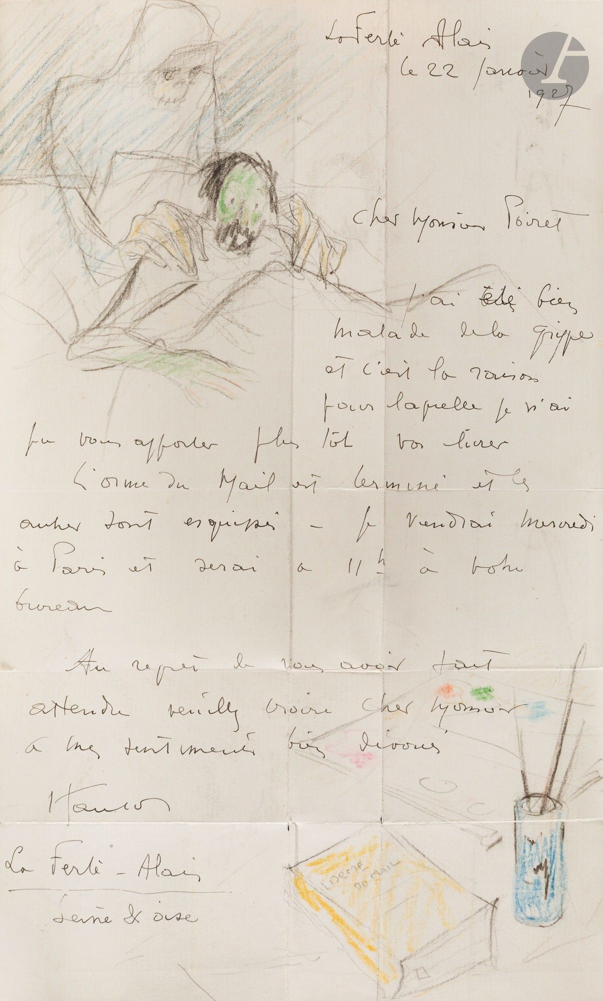 The drawings in this series of works were produced for and at the request of the famous couturier and collector Paul Poiret (1879-1944), as attested by an autograph letter signed by the artist and placed at the head of L'Orme du mail. The letter, one page in-4, is dated La Ferté Alais, 22 January 1927. Hautot warned Paul Poiret that "L'Orme du mail is finished and the others are sketched". The artist drew himself in bed, ill, held by his shoulders by death. At the foot of the bed is a palette and the work L'Orme du Mail.