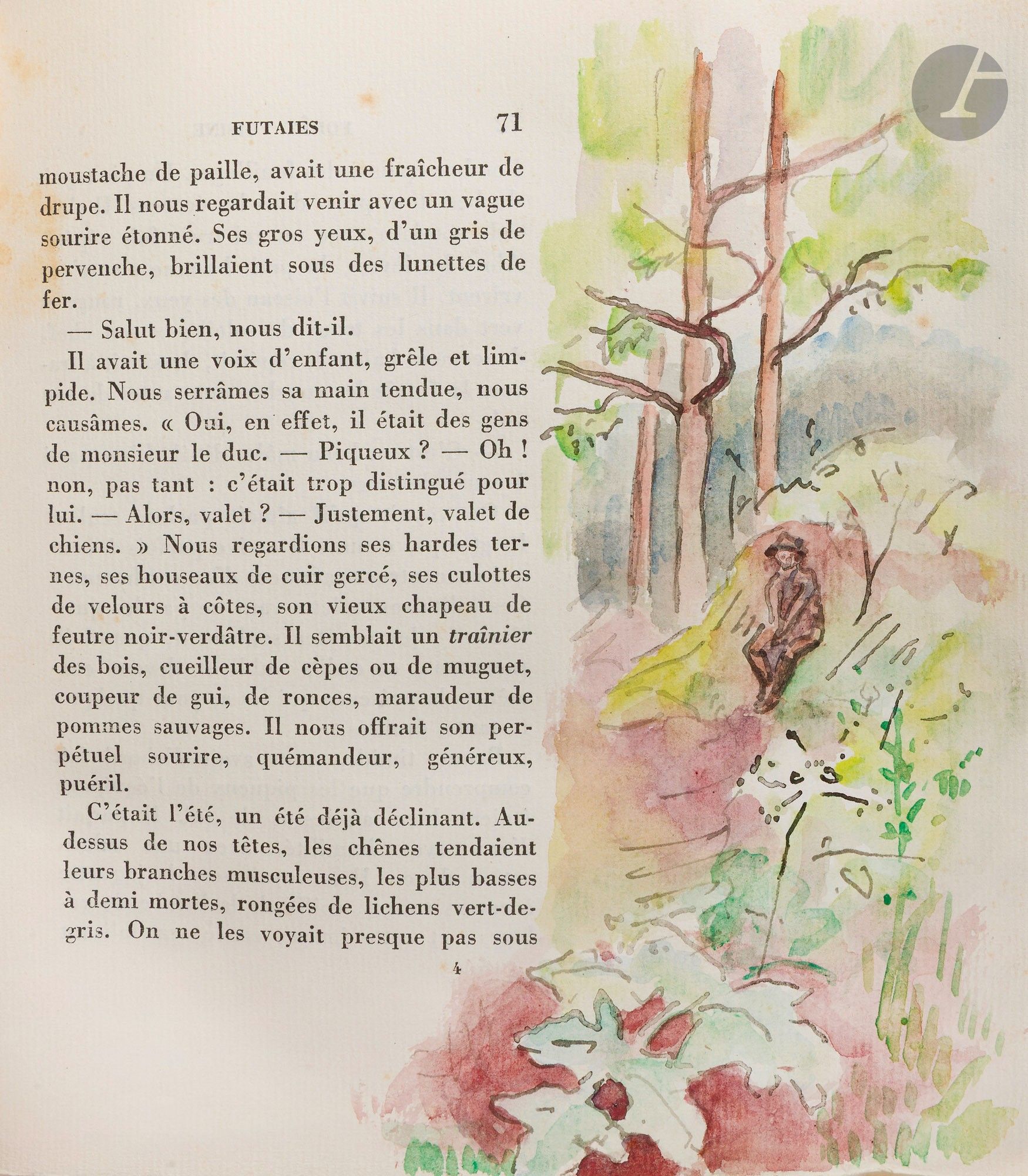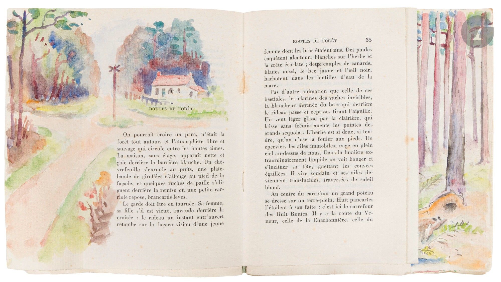 These 25 watercolours were done in the margins, sometimes following the text. The artist has identified himself on the false title, which reads: "Dessins et aquarelles Maurice Asselin" (Drawings and watercolours by Maurice Asselin).