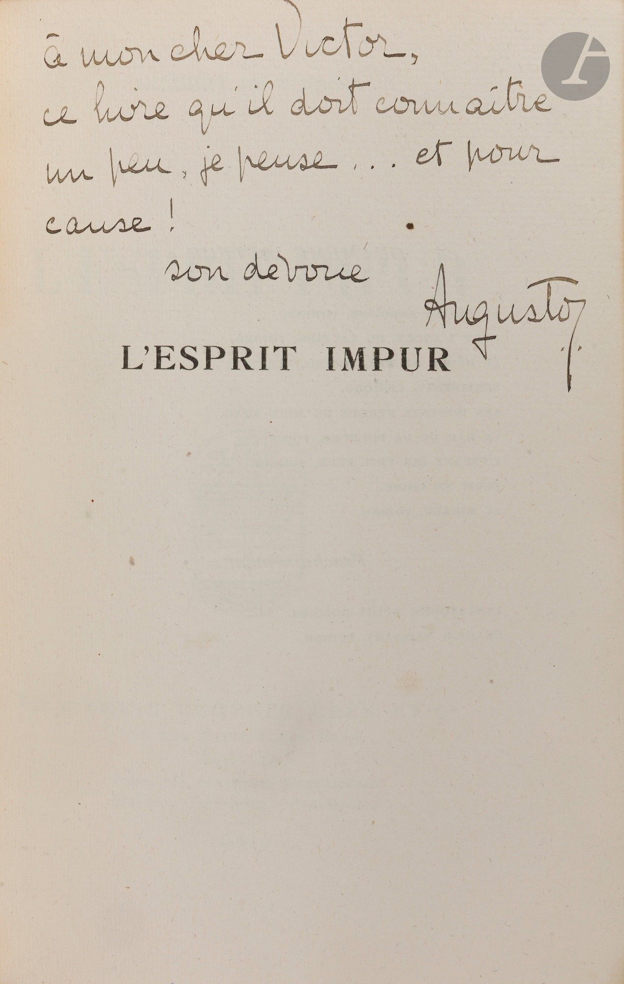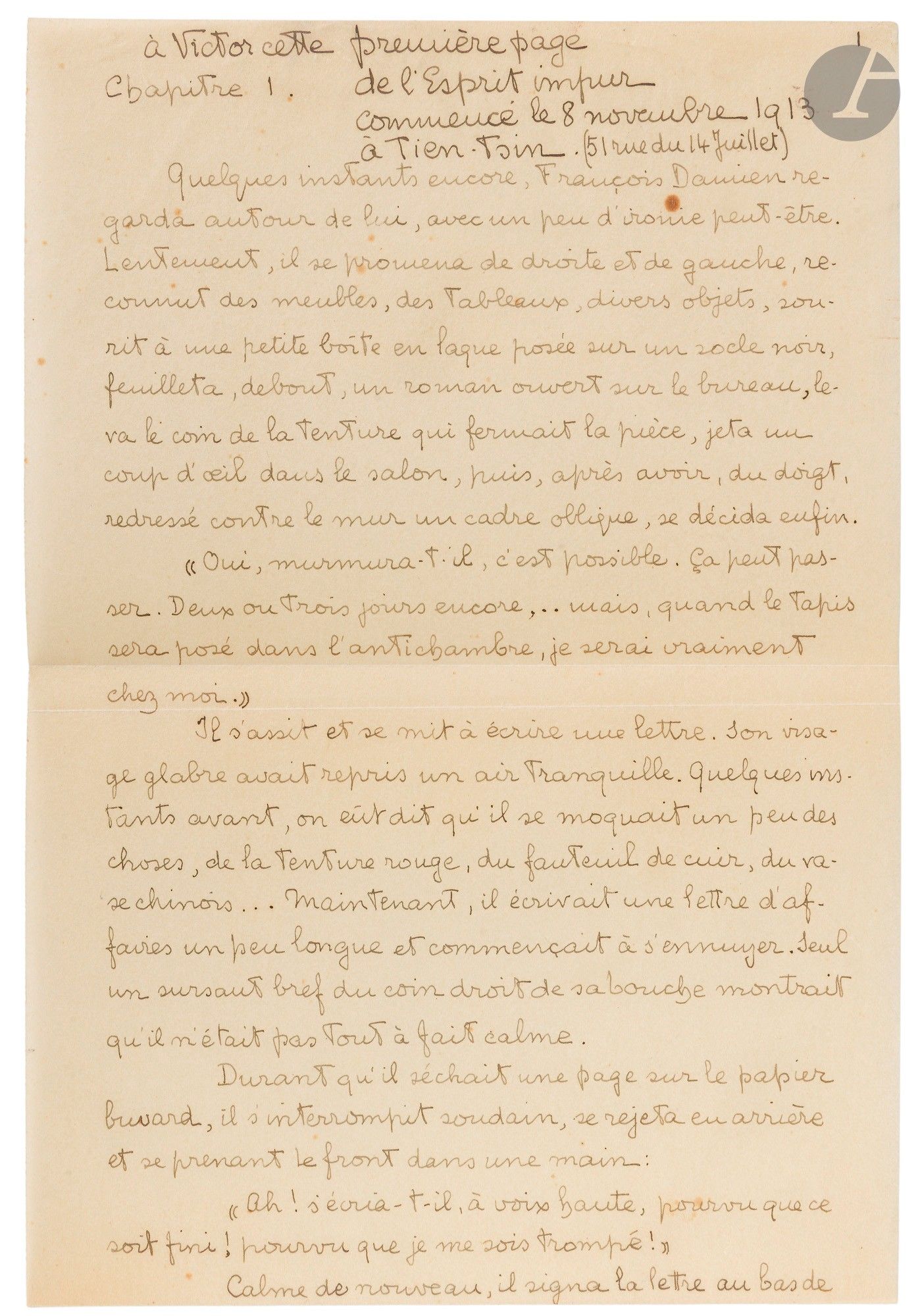 This copy contains an autograph manuscript by the author, with an autograph dedication: "to Victor this first page of L'Esprit impur begun on 8 November 1913 in Tien-Tsin (51 rue du 14 juillet)". Rue du 14 juillet was located in the city's French concession, near the Haiho River.