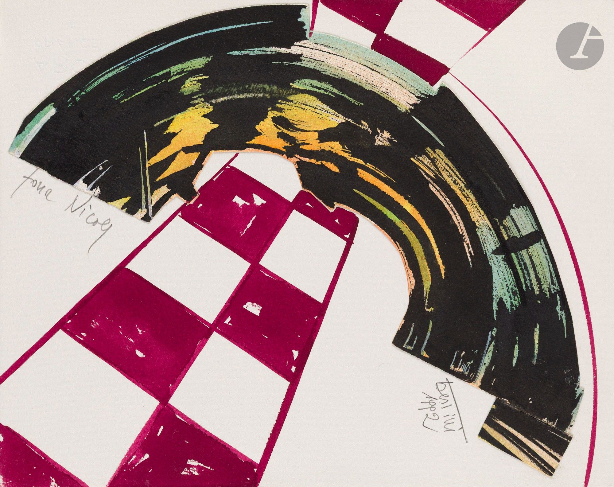 - Silkscreen print cut out, pasted and enriched with the design of a wide strip with a red chequerboard motif, dedicated "Pour Nicole", signed and dated 1992.