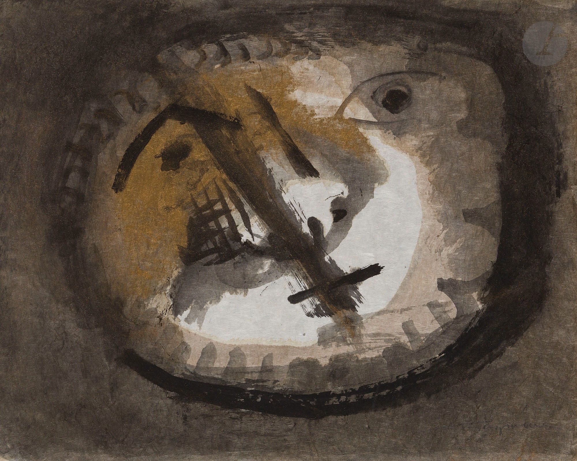 Limited edition of 40 copies on Arches wove paper. This copy, number 2, is one of 5 with an original signed watercolour by the artist. The watercolour on this copy, measuring 279 x 345 mm, was produced on Japon nacré paper and depicts a face painted in black and gold.