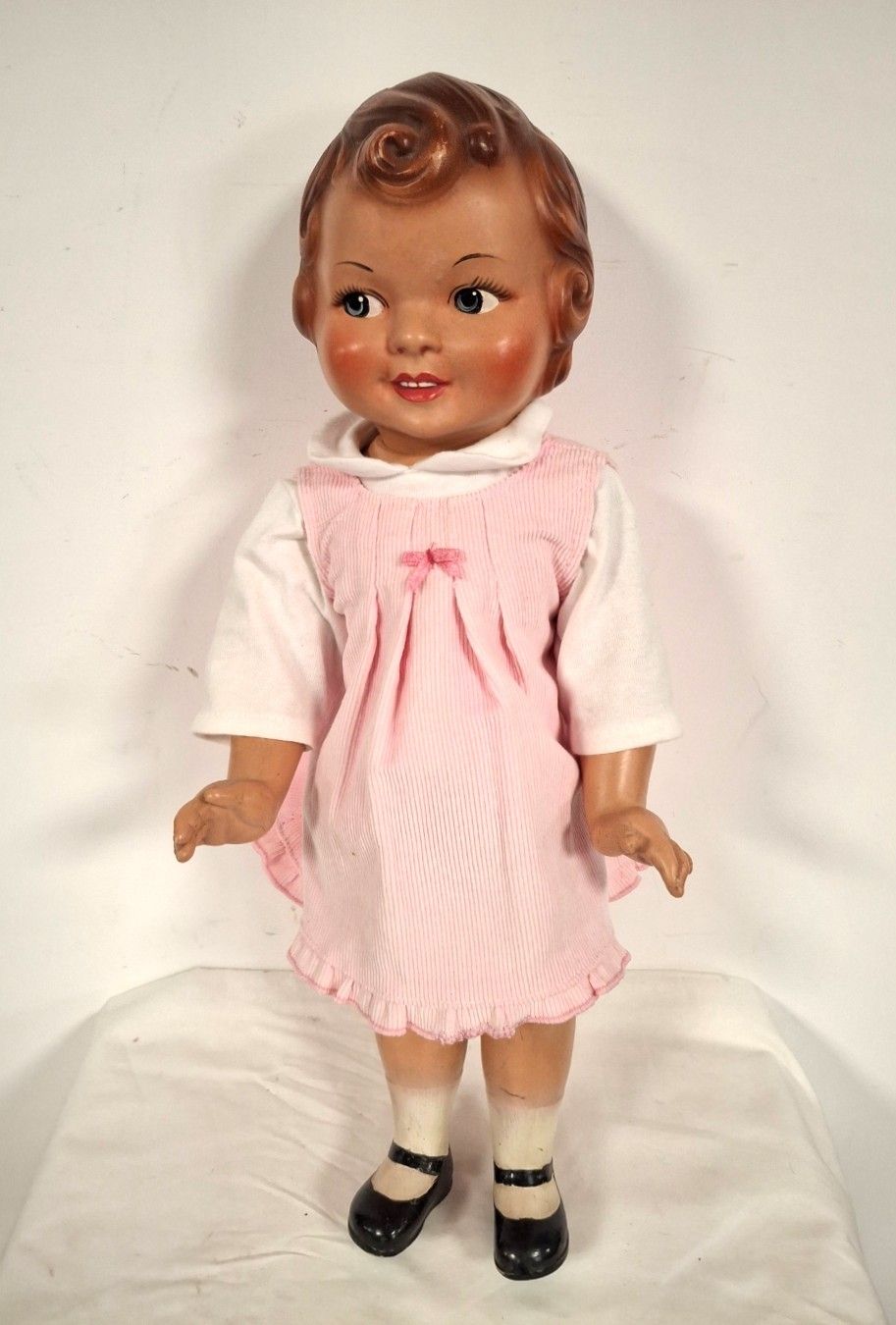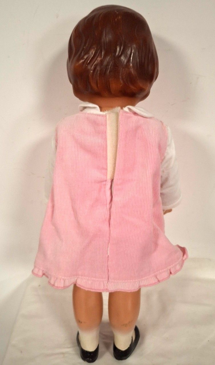 Little smiling rhodoïd doll in pink dress (H 43 cm)