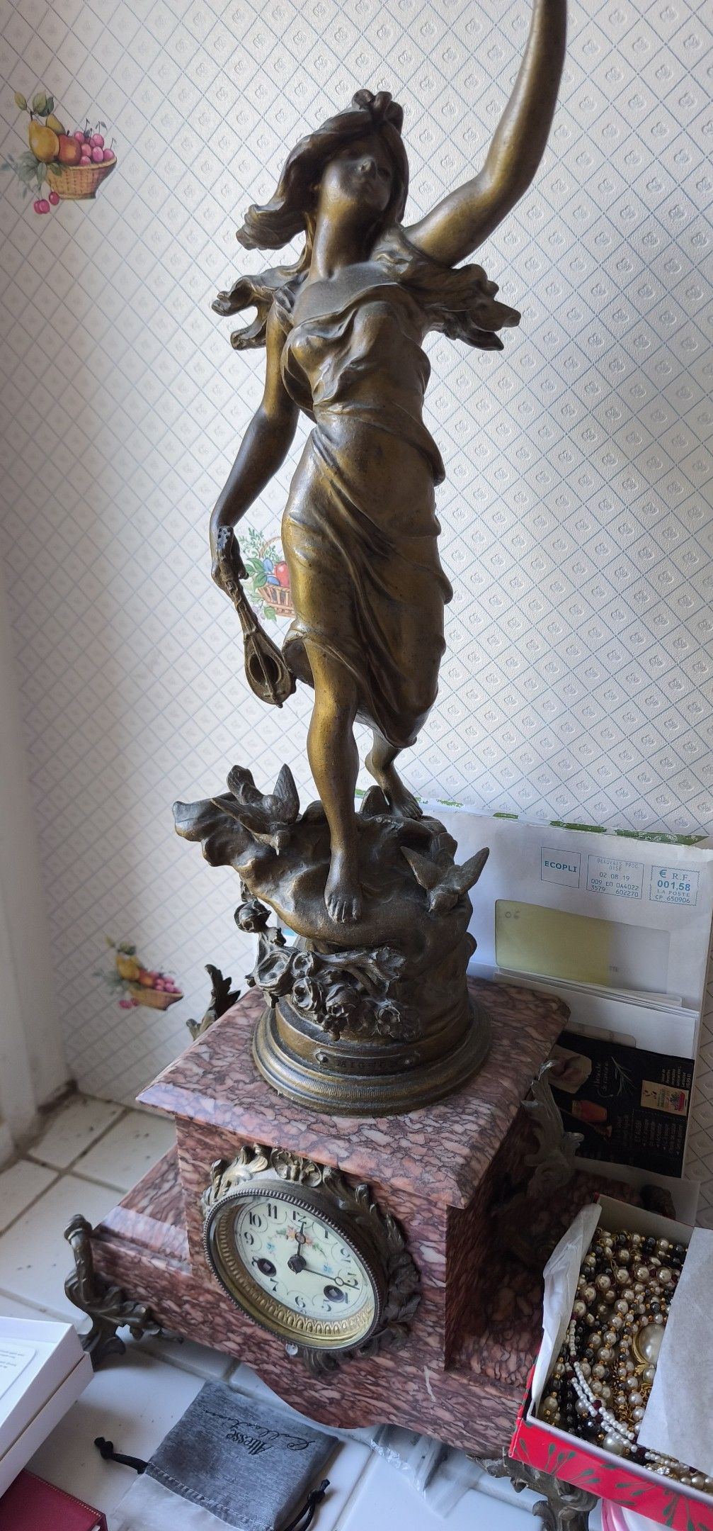 Pink shaded marble clock "Woman with mandolin and birds" regule (H 71 cm)