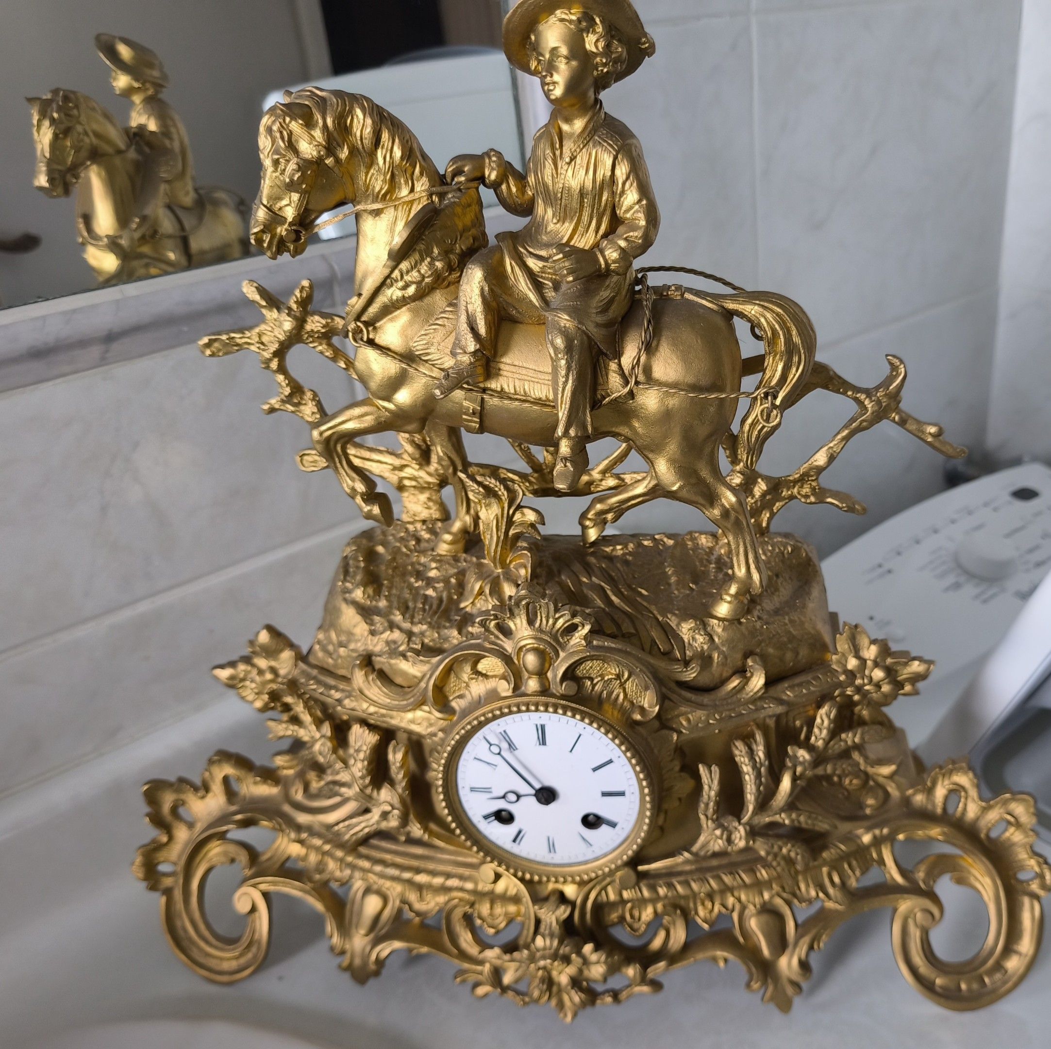 Gilded regule clock with young horseman in Roman numerals (H 43 cm)