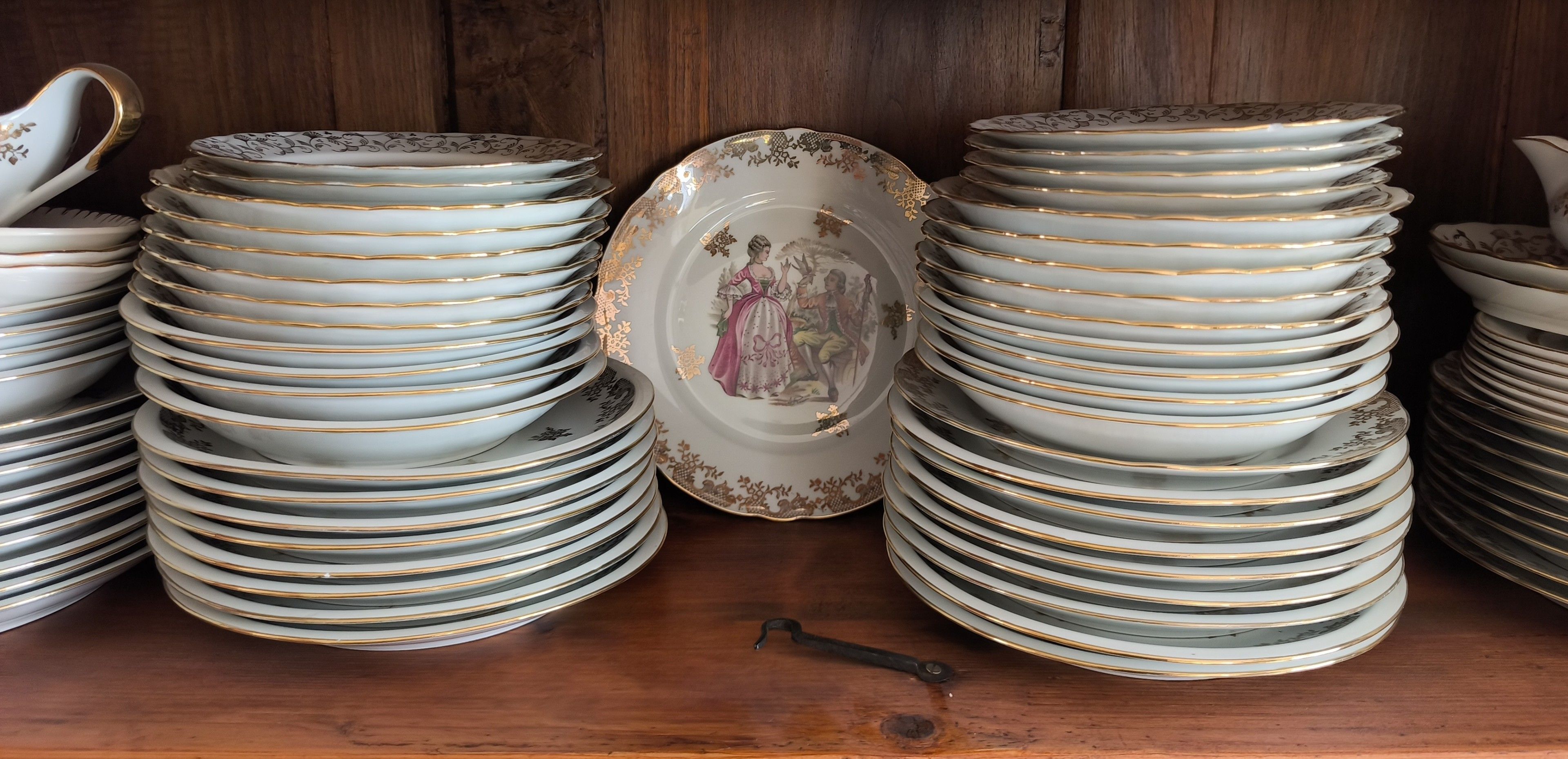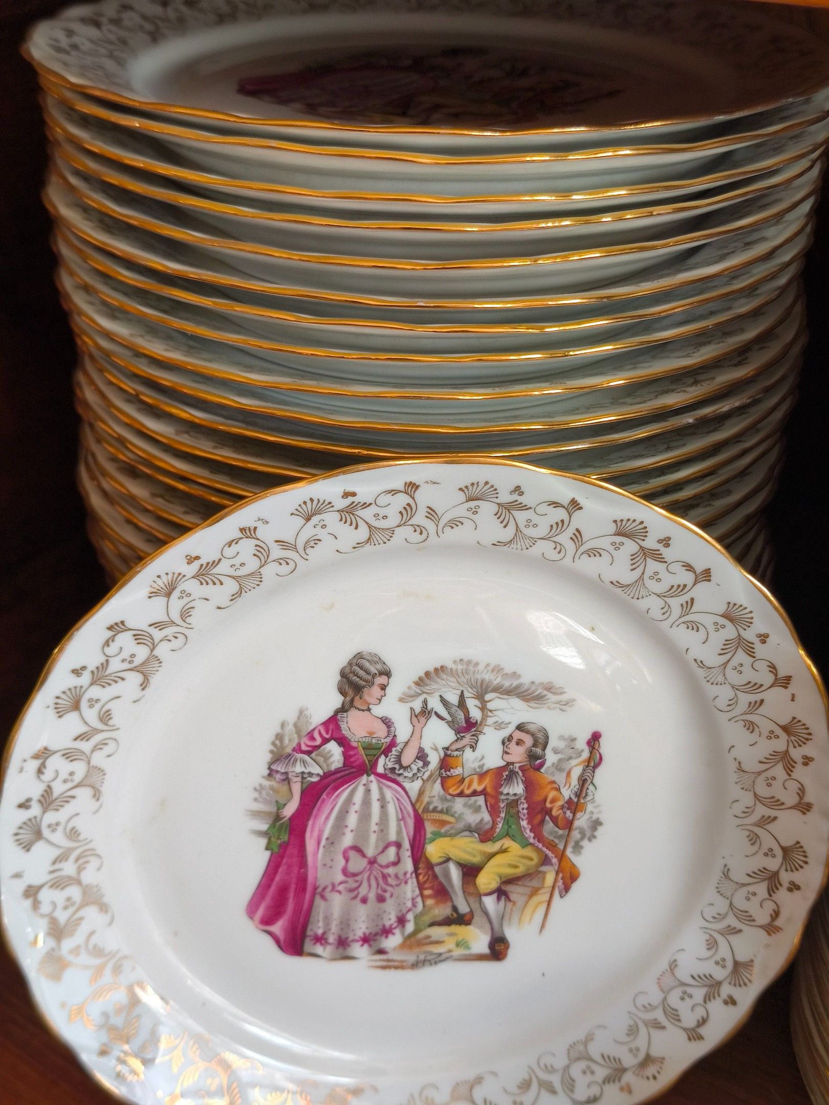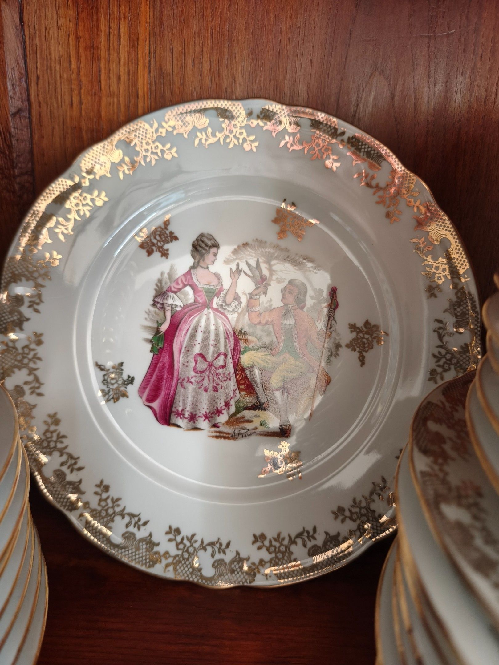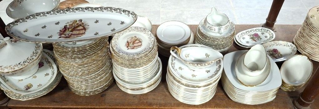 MASSE and SURGET porcelain dinner service decorated with a galant scene and gilded scroll border + elements of 2 porcelain services (approx 180 pieces total)