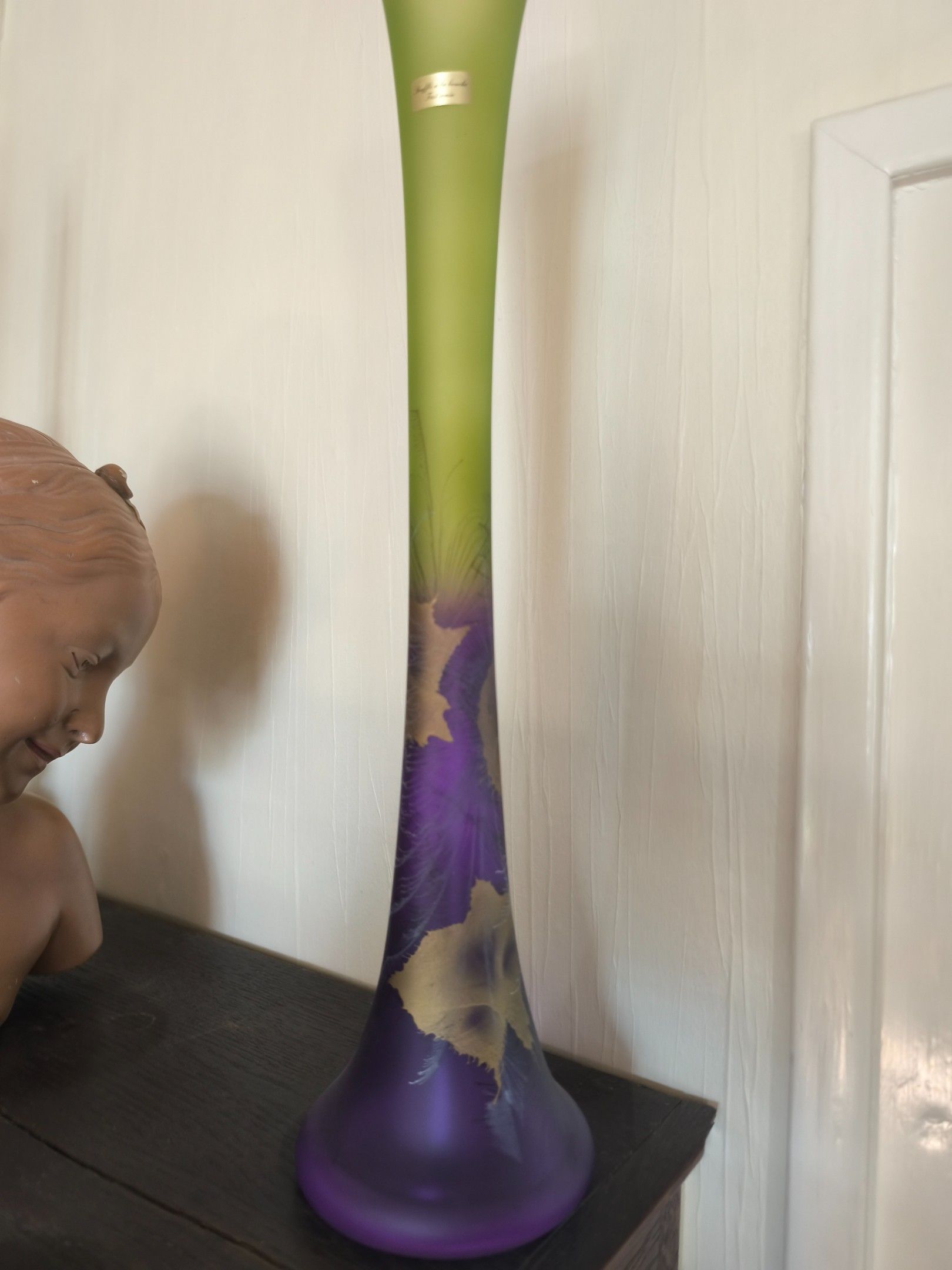 High-necked vase in violet and green with gilded foliage (H 49.5 cm)