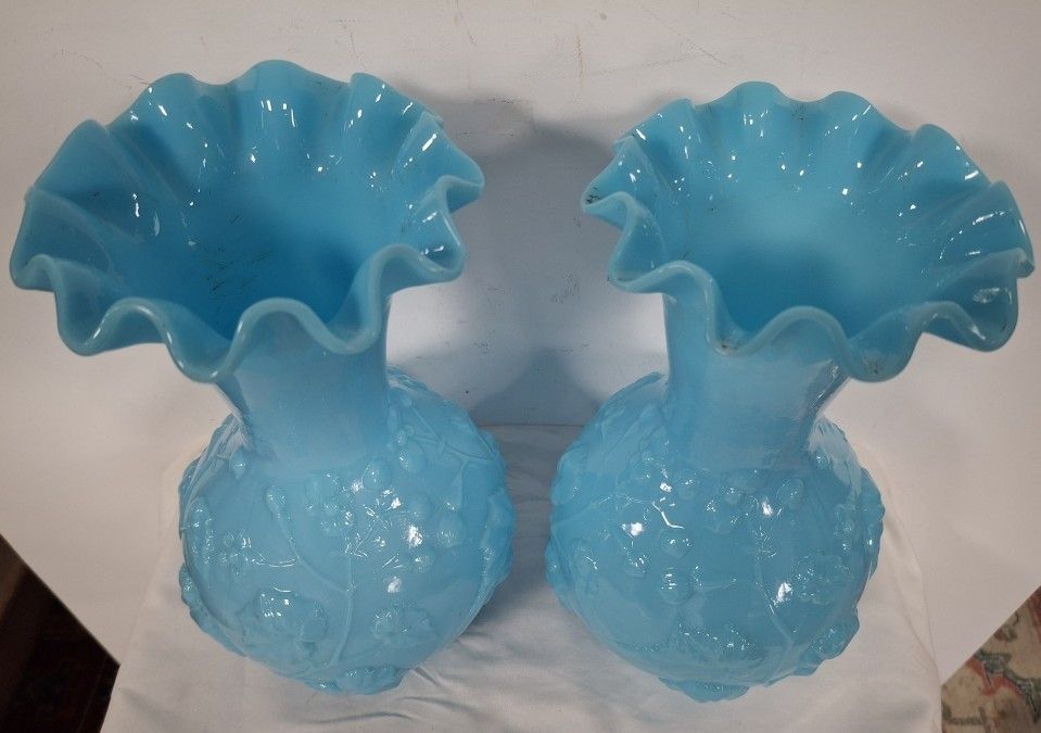 Pair of blue opaline vases decorated with grapevines on a serrated neck (H 24 cm)
