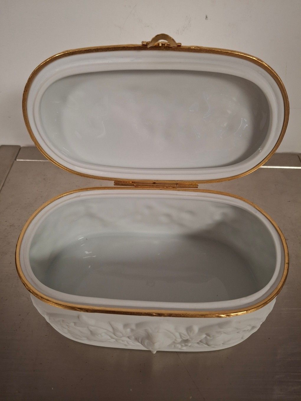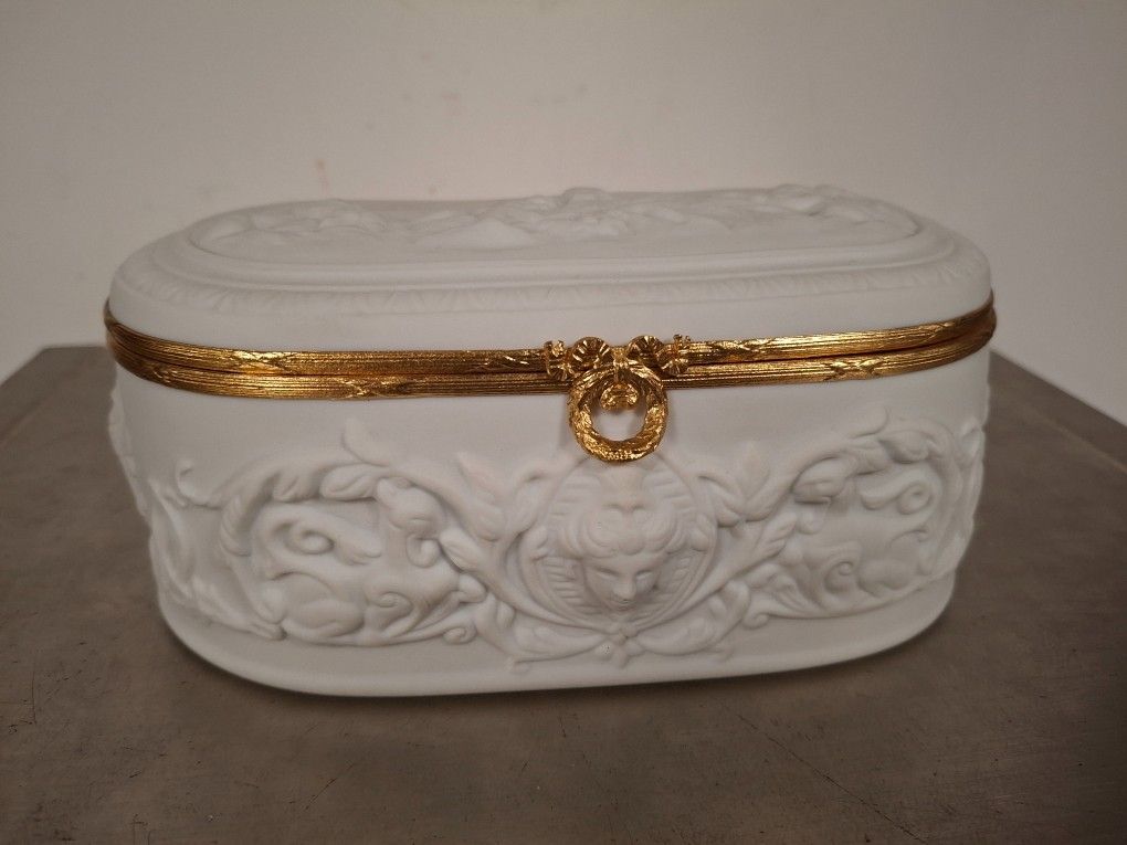Small covered biscuit box decorated with masks (Length 27/H 28 cm)