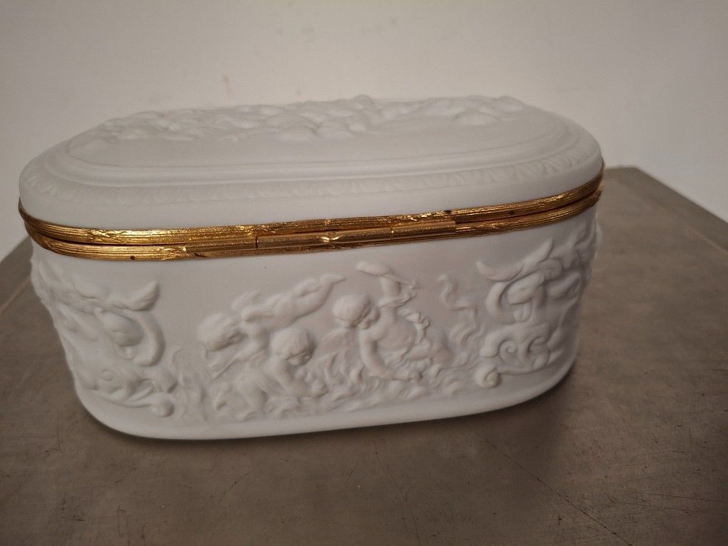 Small covered biscuit box decorated with masks (Length 27/H …