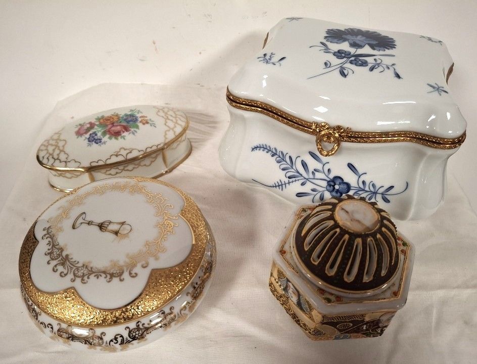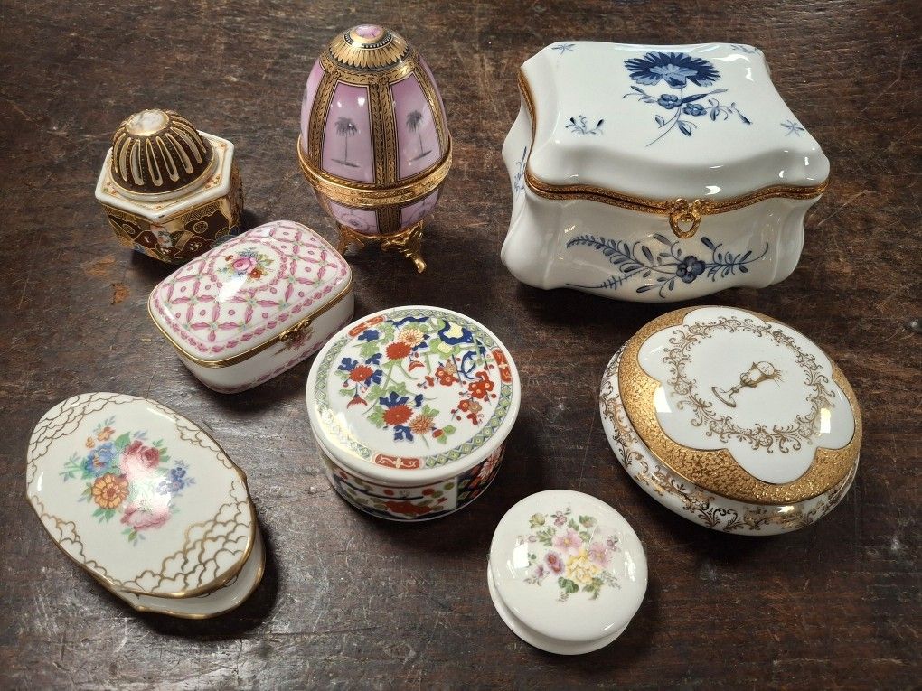 7 Porcelain covered boxes with carnation decoration in the Chantilly style (length 7 to 14 cm) + Porcelain egg in the Fabergé style