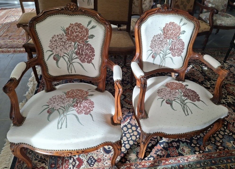 Pair of moulded beech armchairs with light fabric shell backs decorated with Regency-style flowers