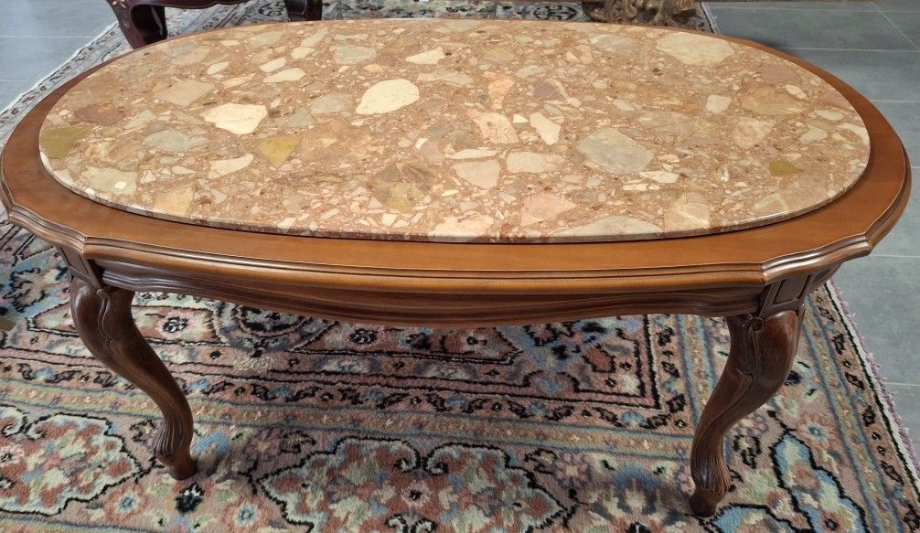 Louis XV style wood and marble coffee table (H 45 / L 98 cm)