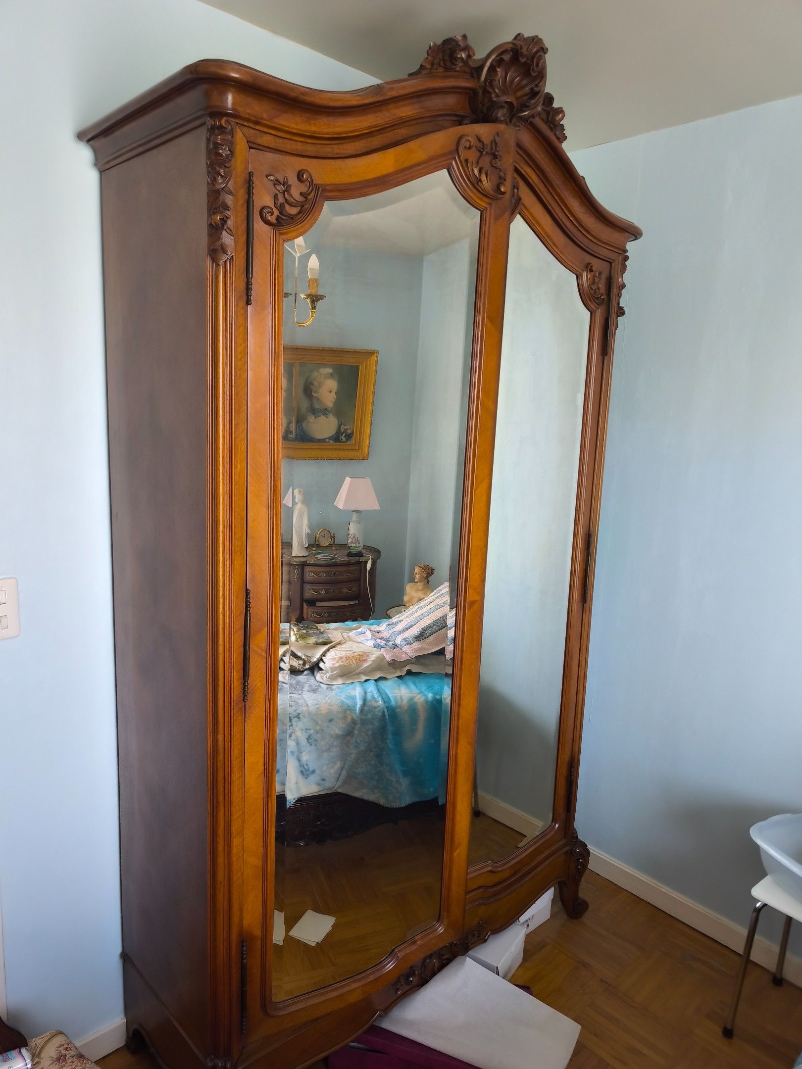 Large mirror cabinet veneered 2 doors gendarme hat carved (H 2m40 / width 1m25 / depth 0.50 cm) SALE ON DESIGNATION, at charge of removal in a flat in BEAUVAIS (60)