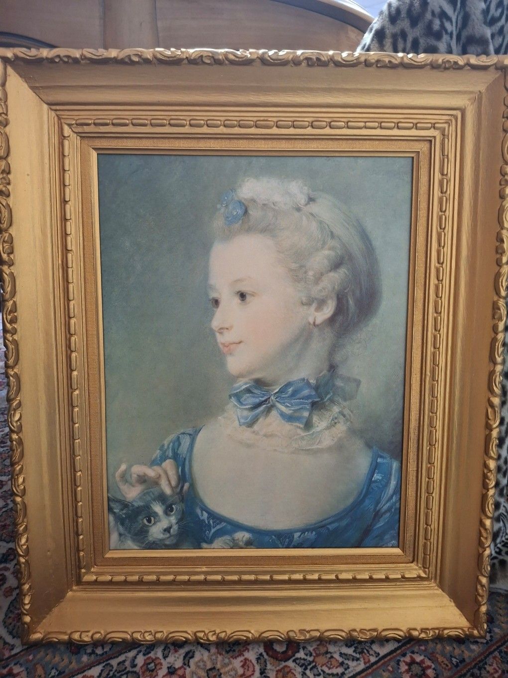 Reproduction on canvas with gilded frame of "young woman with little cat" (54x65cm)