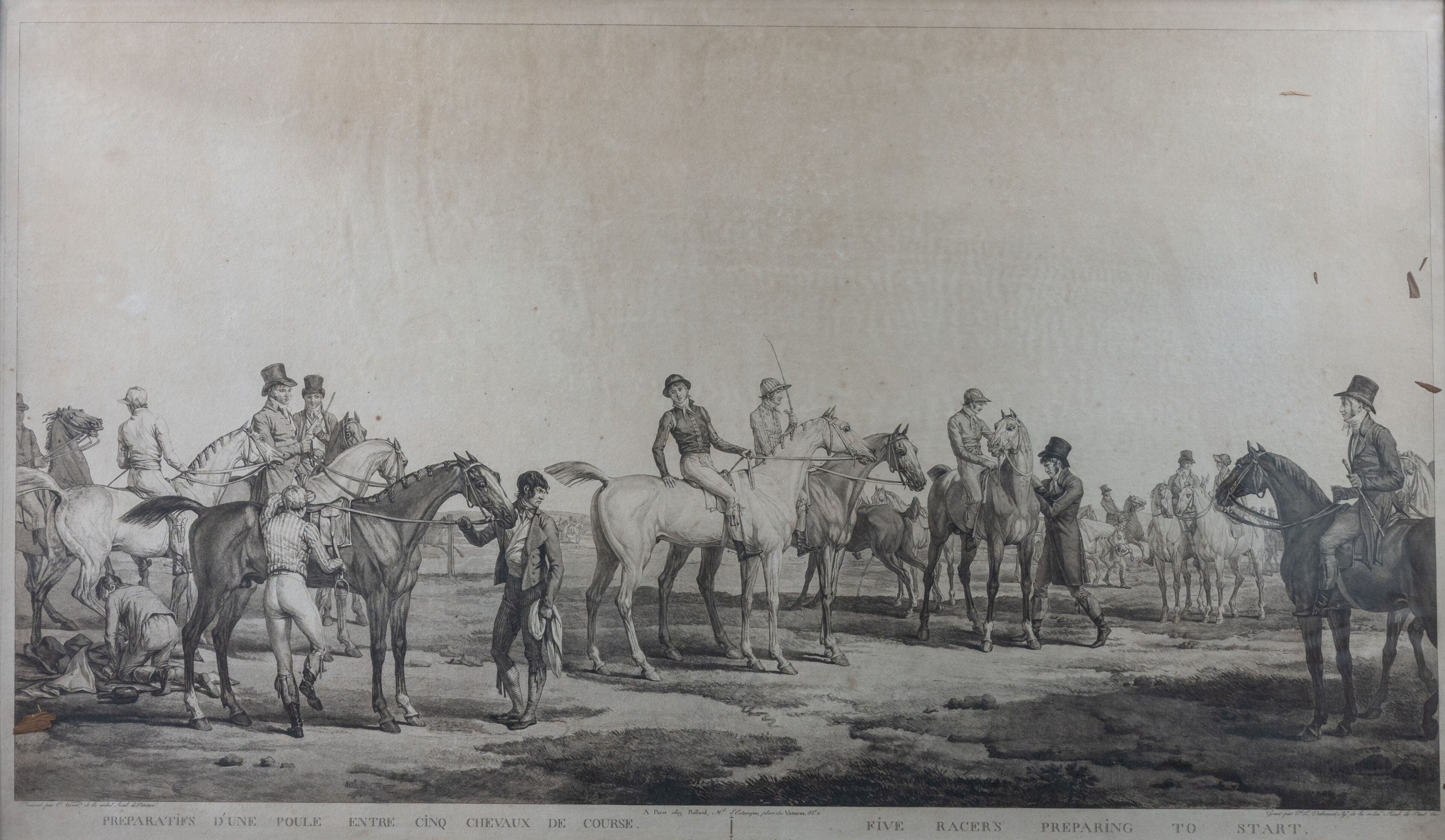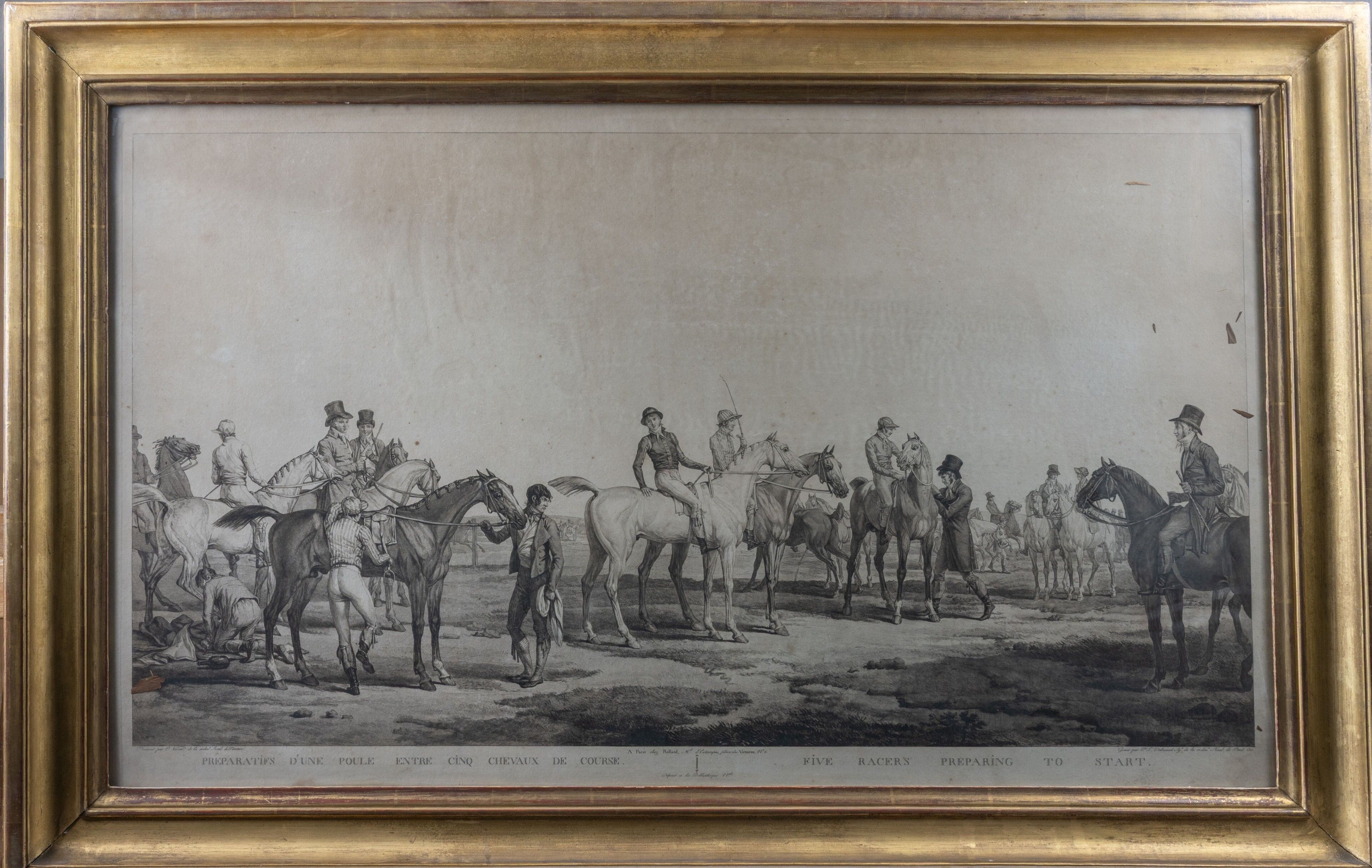 After Carle Vernet (1758-1836) Preparing a hen between five racehorses Aquatint by L. Ph de Bucourt published by Rolland marchand d'estampe place des Victoires and deposited in the national library Proof on vellum H. 56 cm - L. 95 cm (view) ANC Insolation, pitting and a few other defects