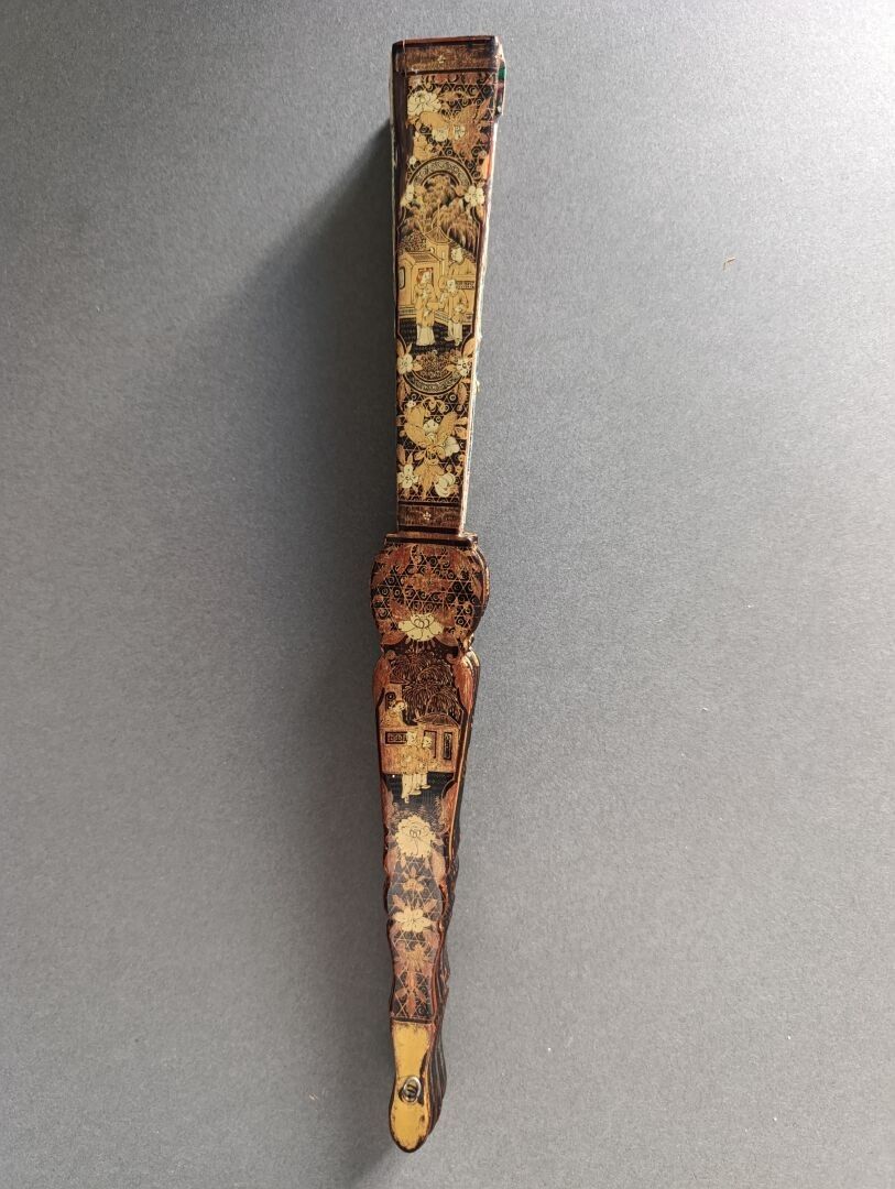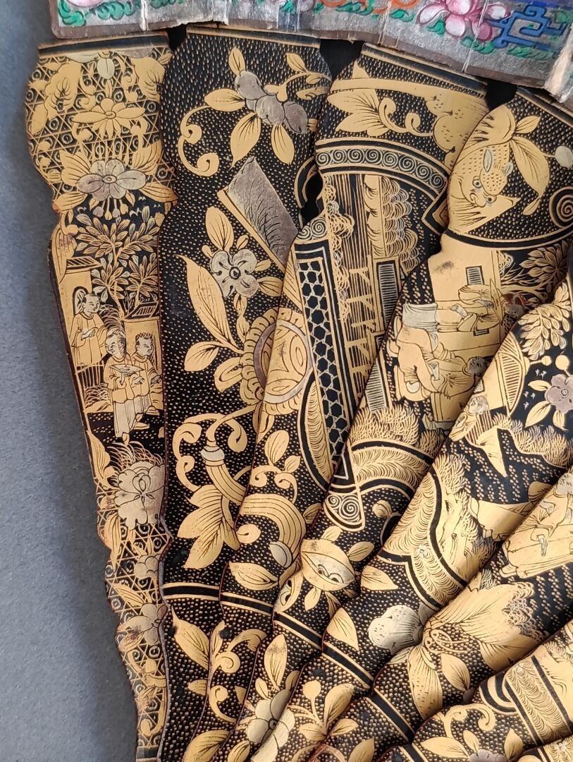 Black lacquered bamboo frame with rich gold decoration of scholars in a garden.