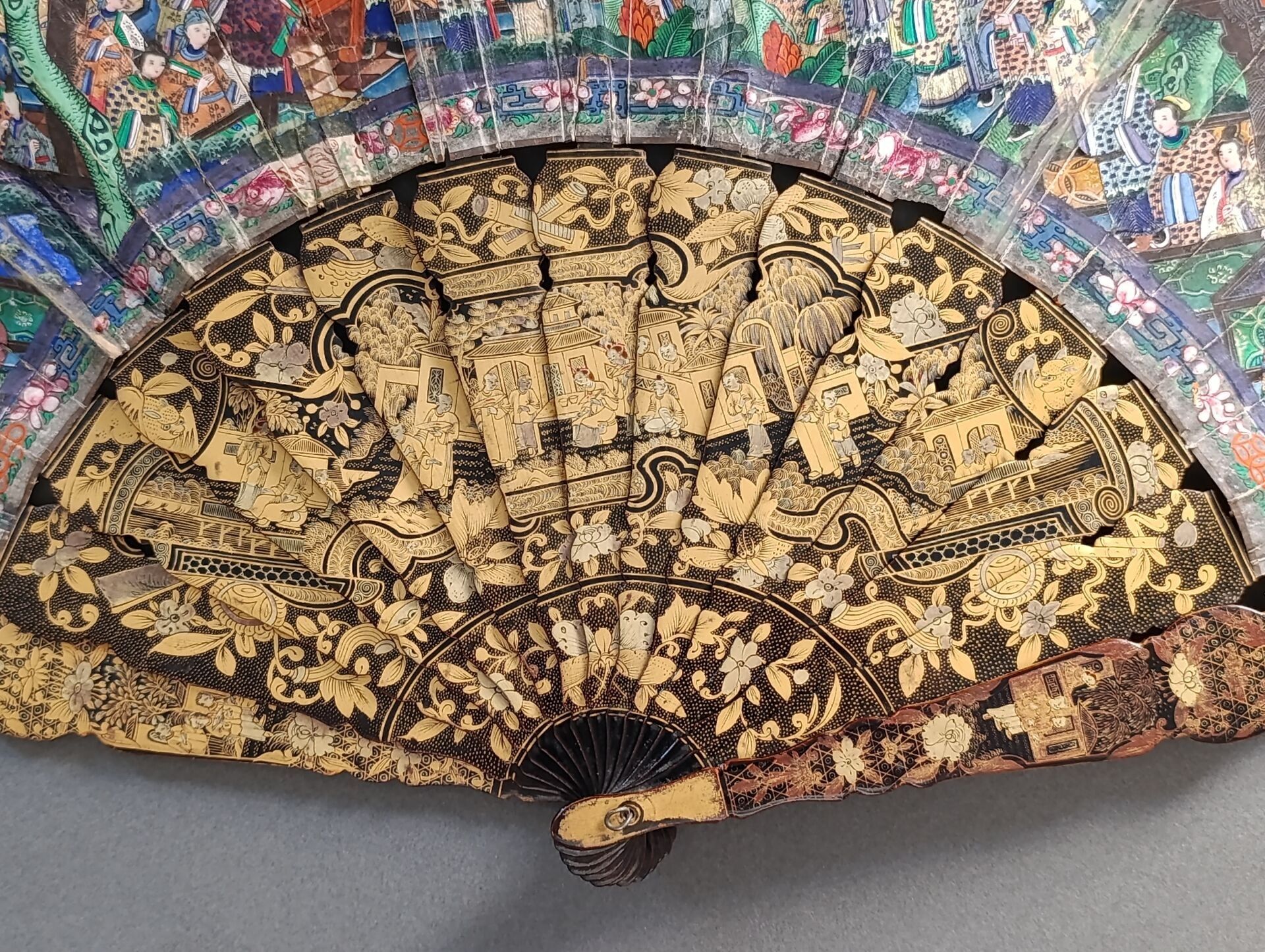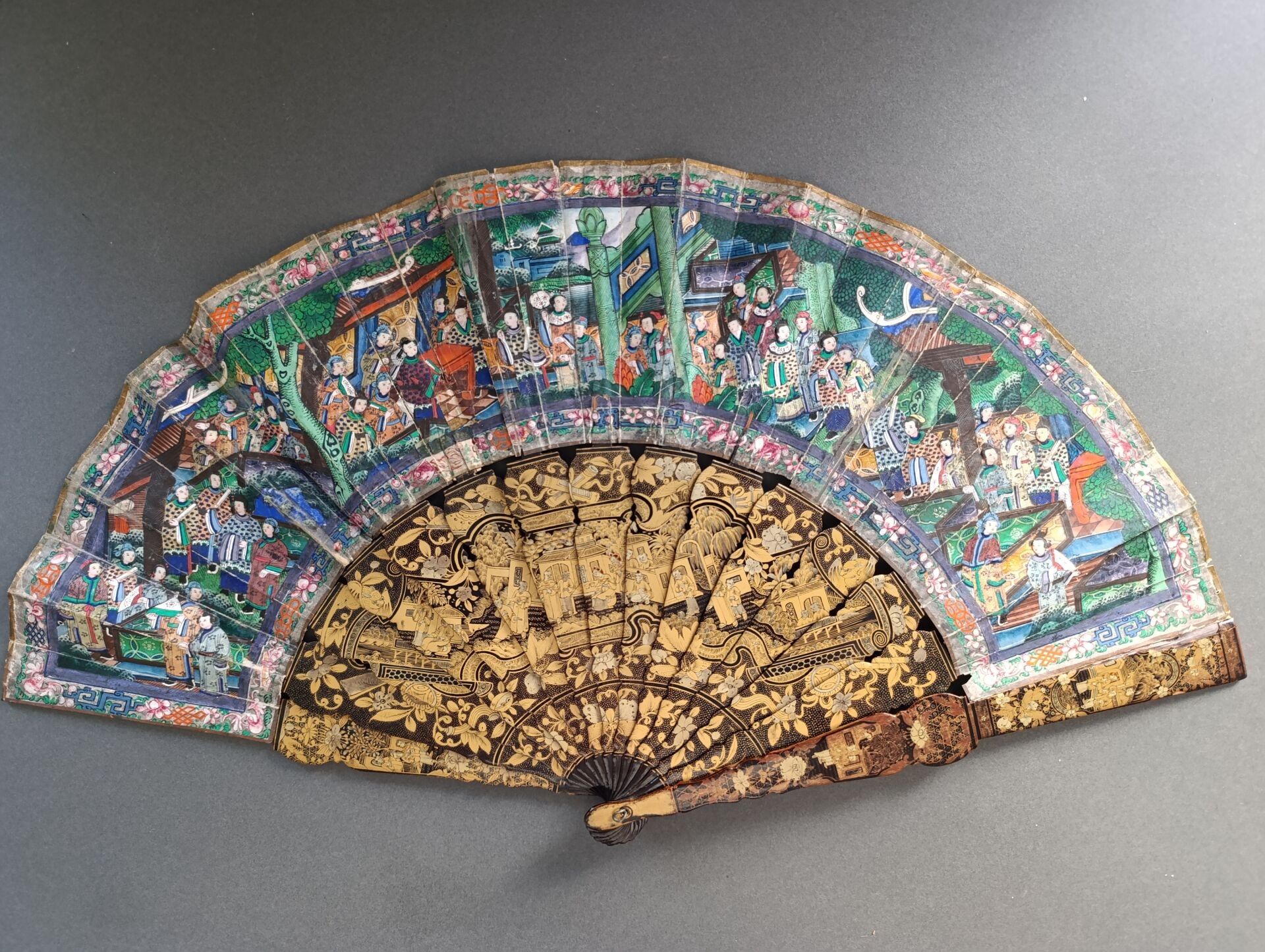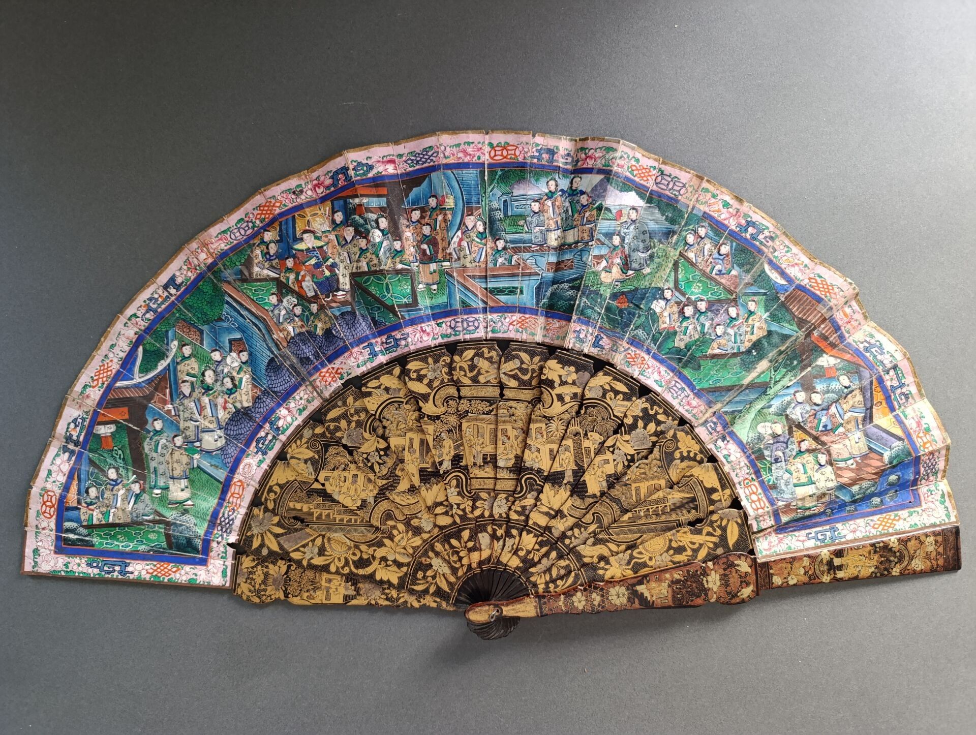 Folded fan, the double sheet of paper painted on both sides with 50 figures whose heads and silk garments are in relief.